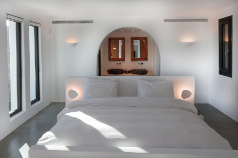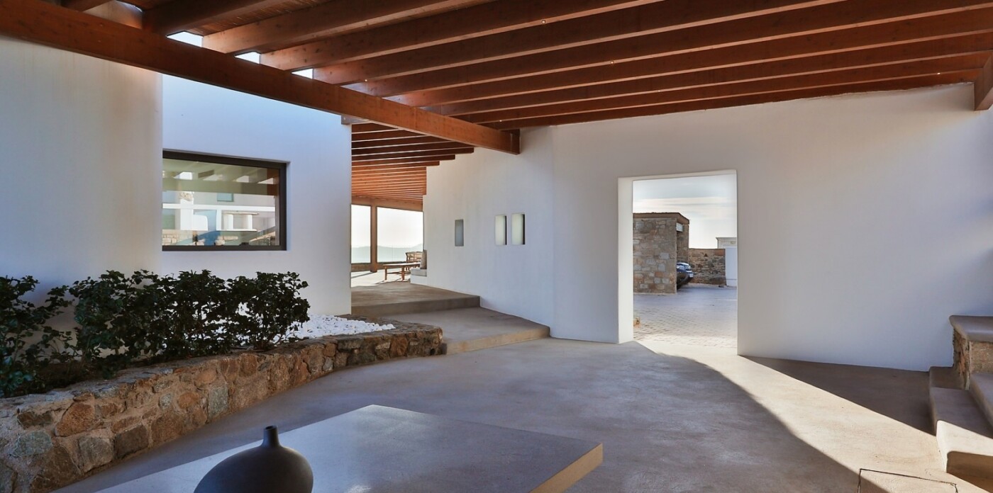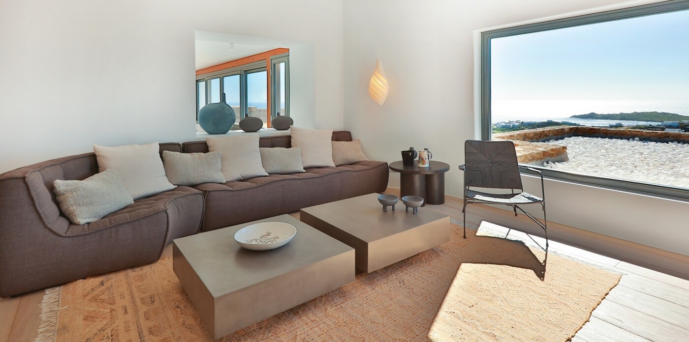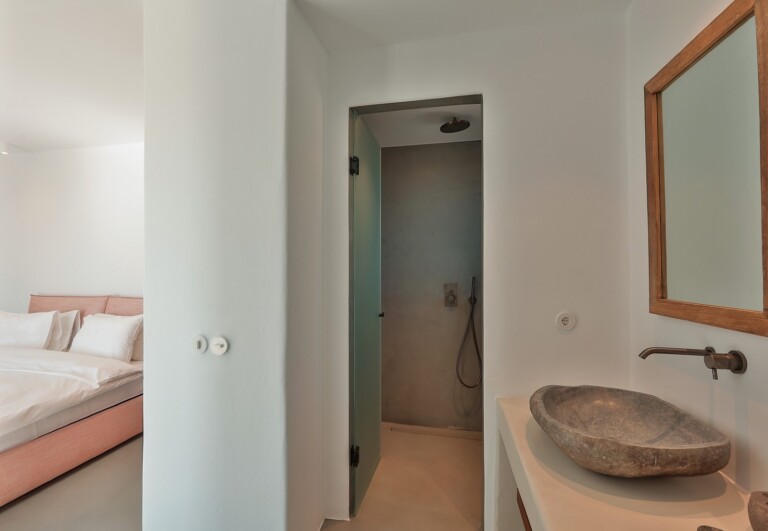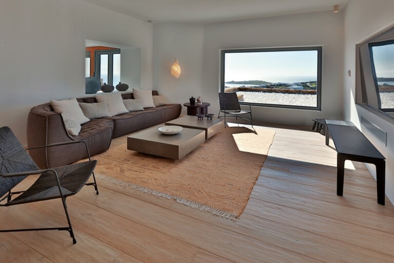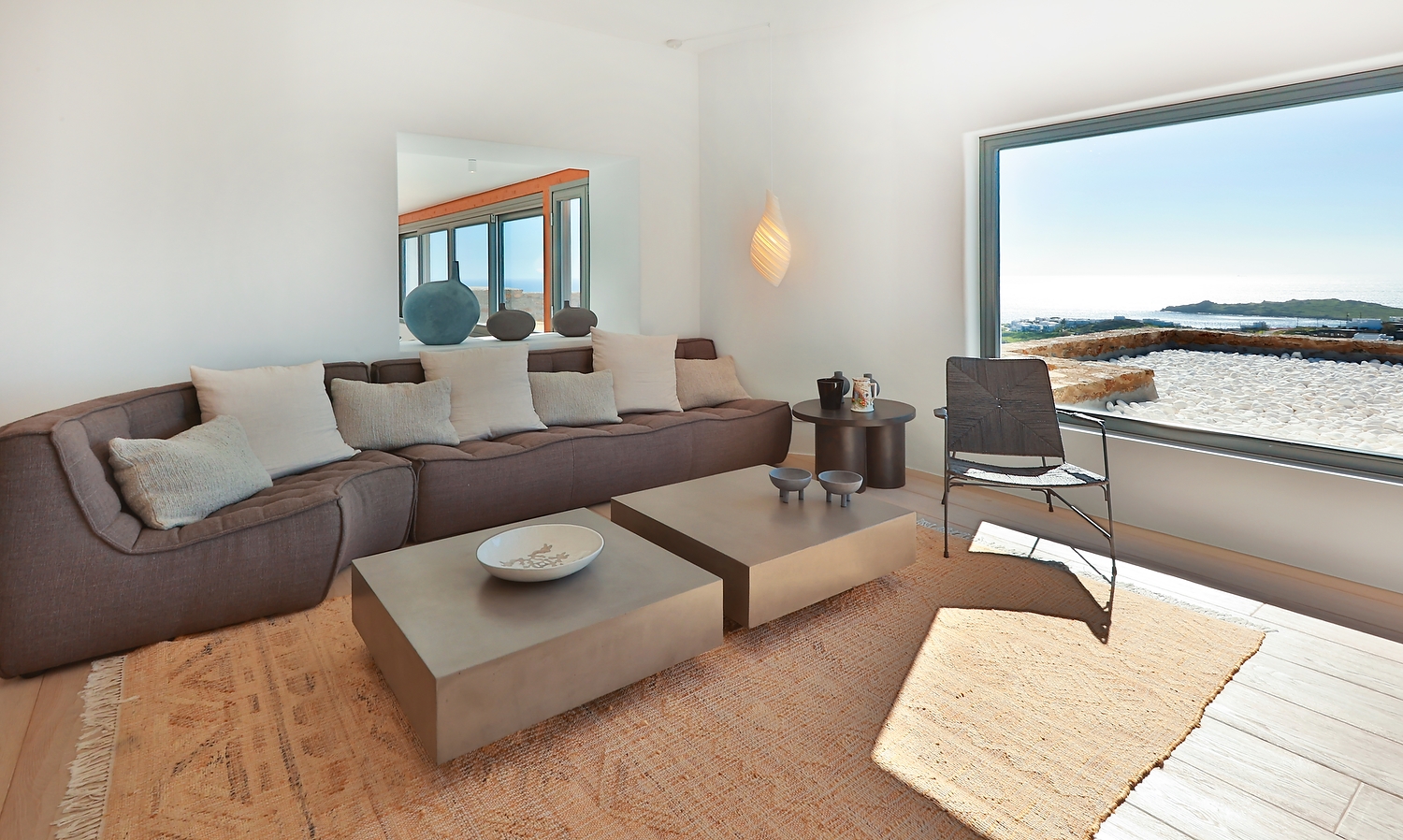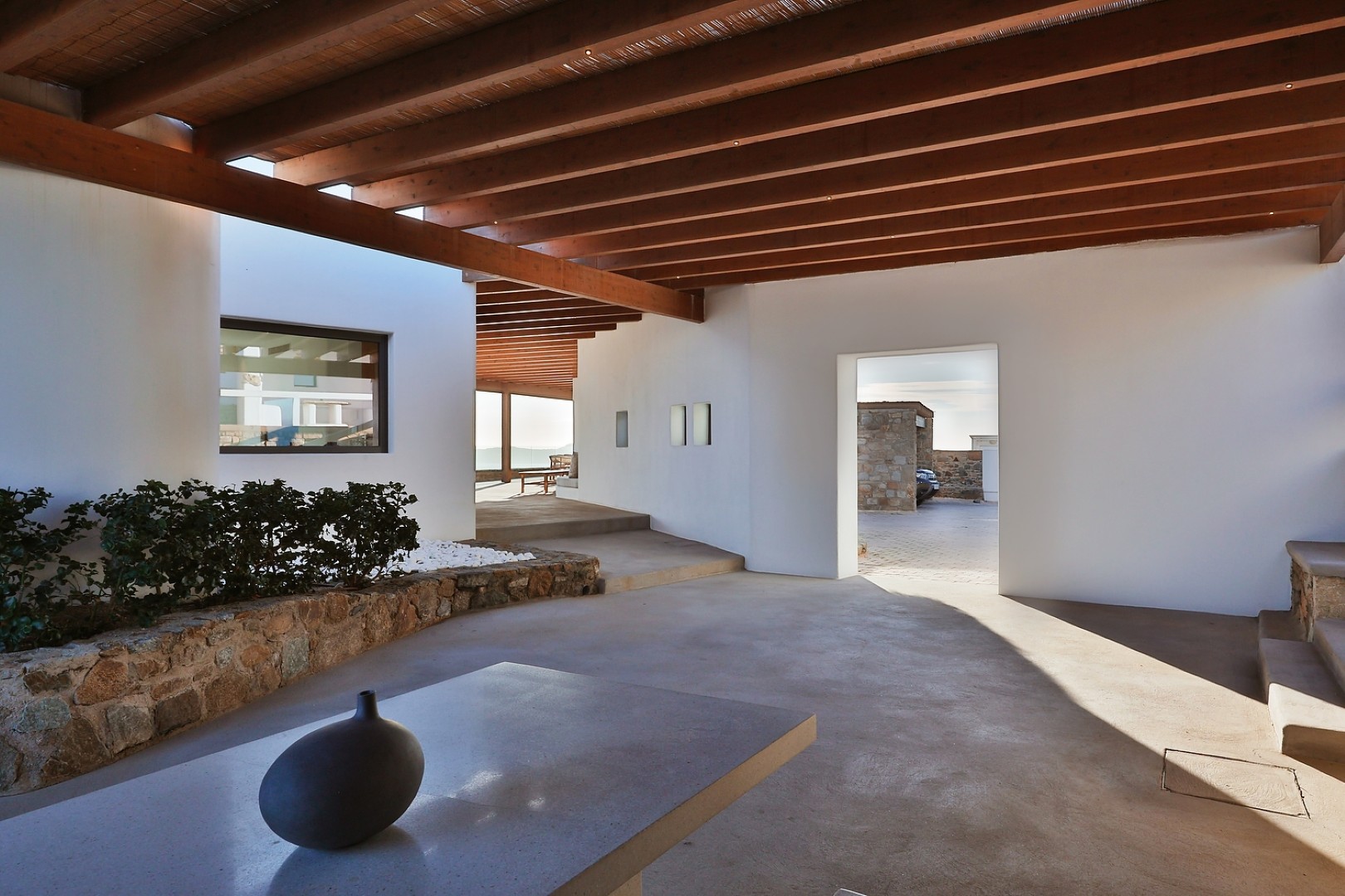 Designed with clean lines and natural textures, the villa combines contemporary comfort with the understated elegance of the Cyclades. Expansive living areas open directly onto wide terraces, where indoor and outdoor spaces blend seamlessly. Floor-to-ceiling openings frame the sea and fill the interiors with light throughout the day.
