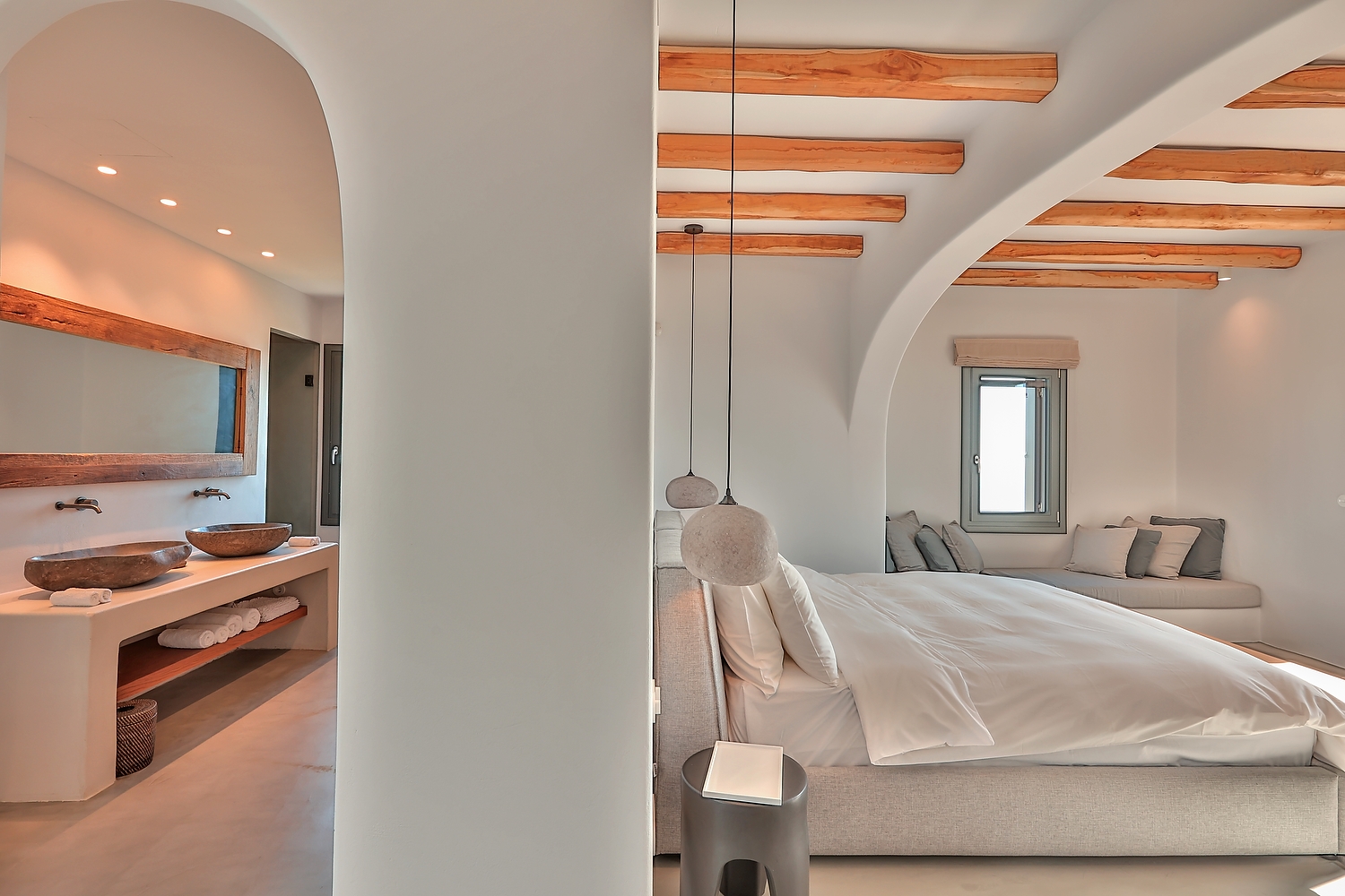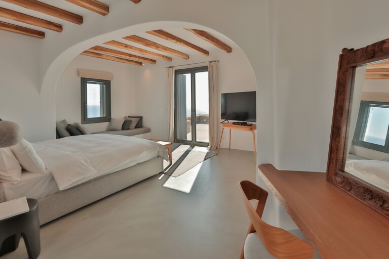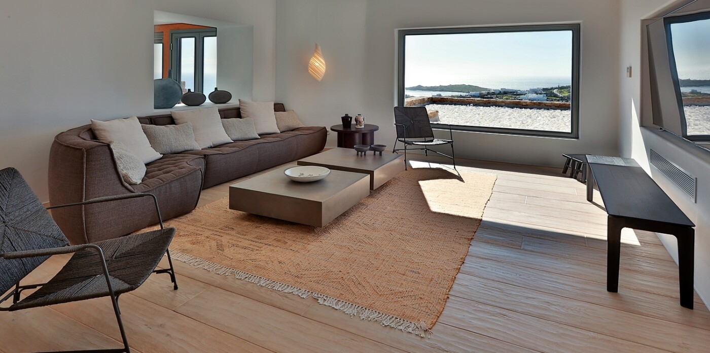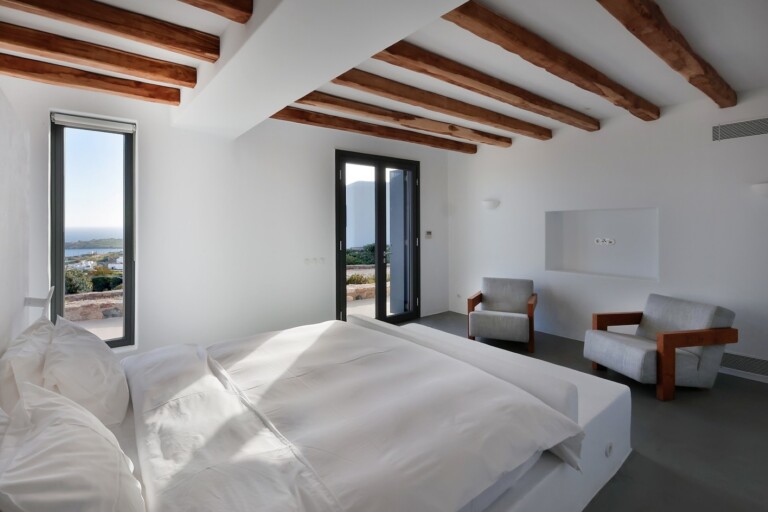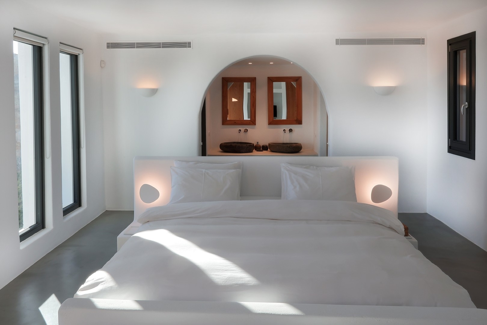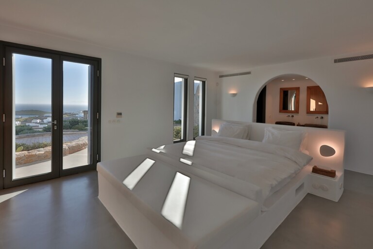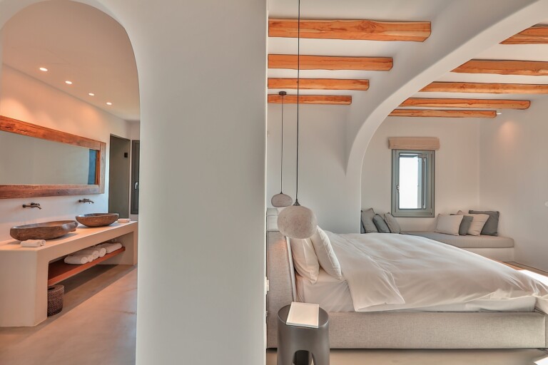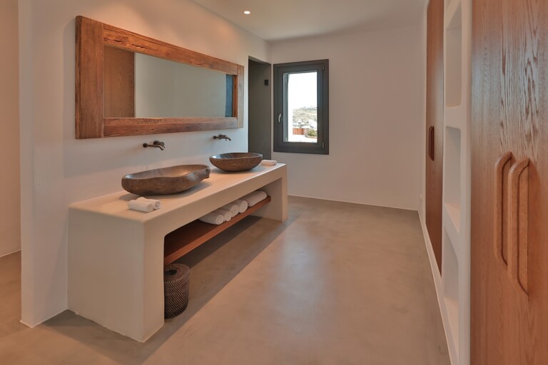 Designed with clean lines and natural textures, the villa combines contemporary comfort with the understated elegance of the Cyclades. Expansive living areas open directly onto wide terraces, where indoor and outdoor spaces blend seamlessly. Floor-to-ceiling openings frame the sea and fill the interiors with light throughout the day.