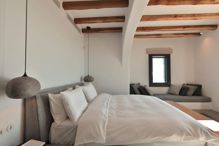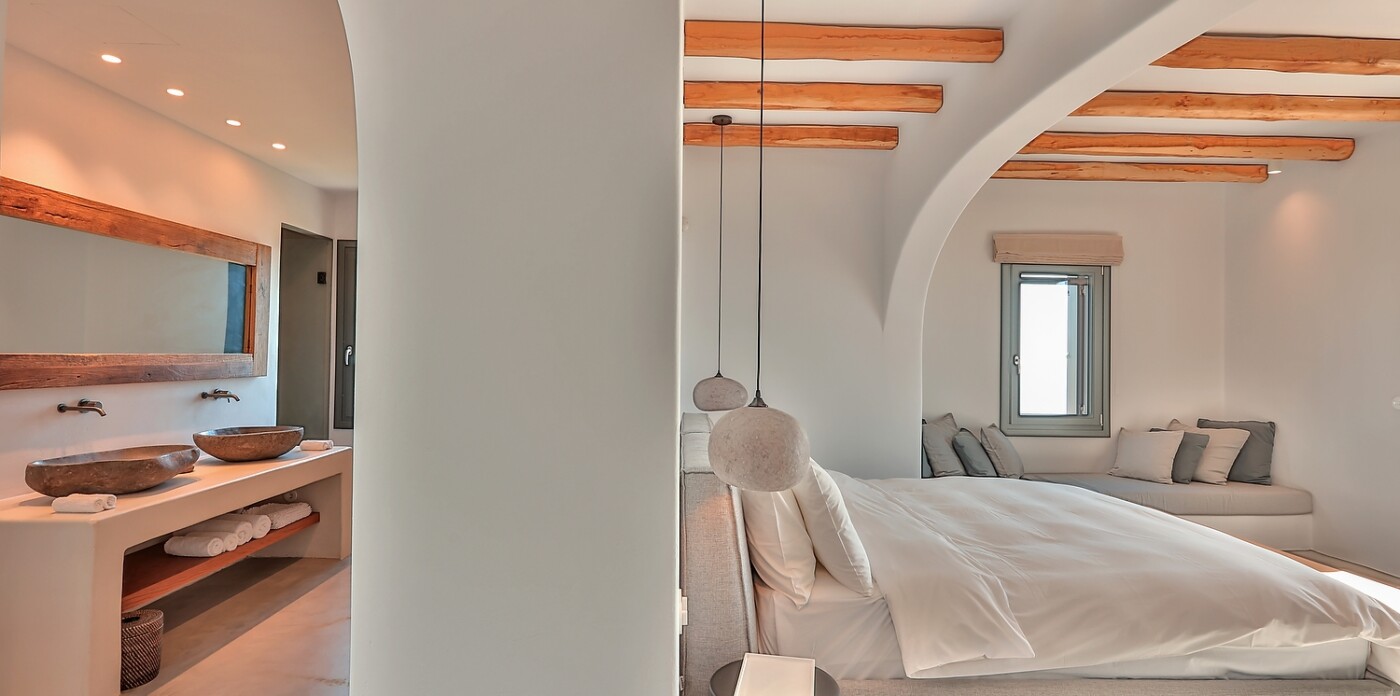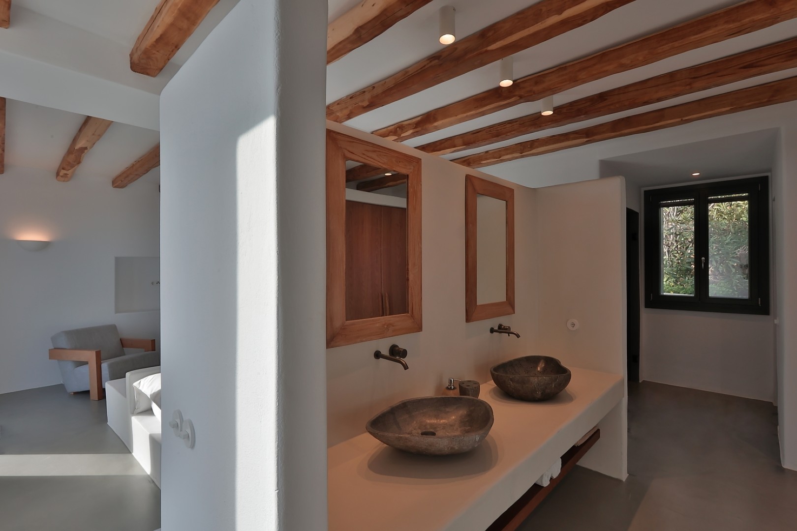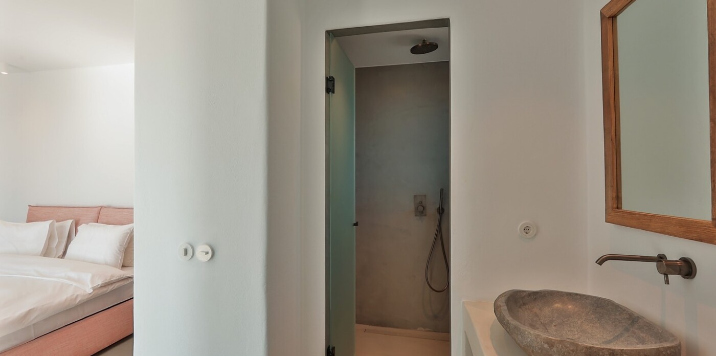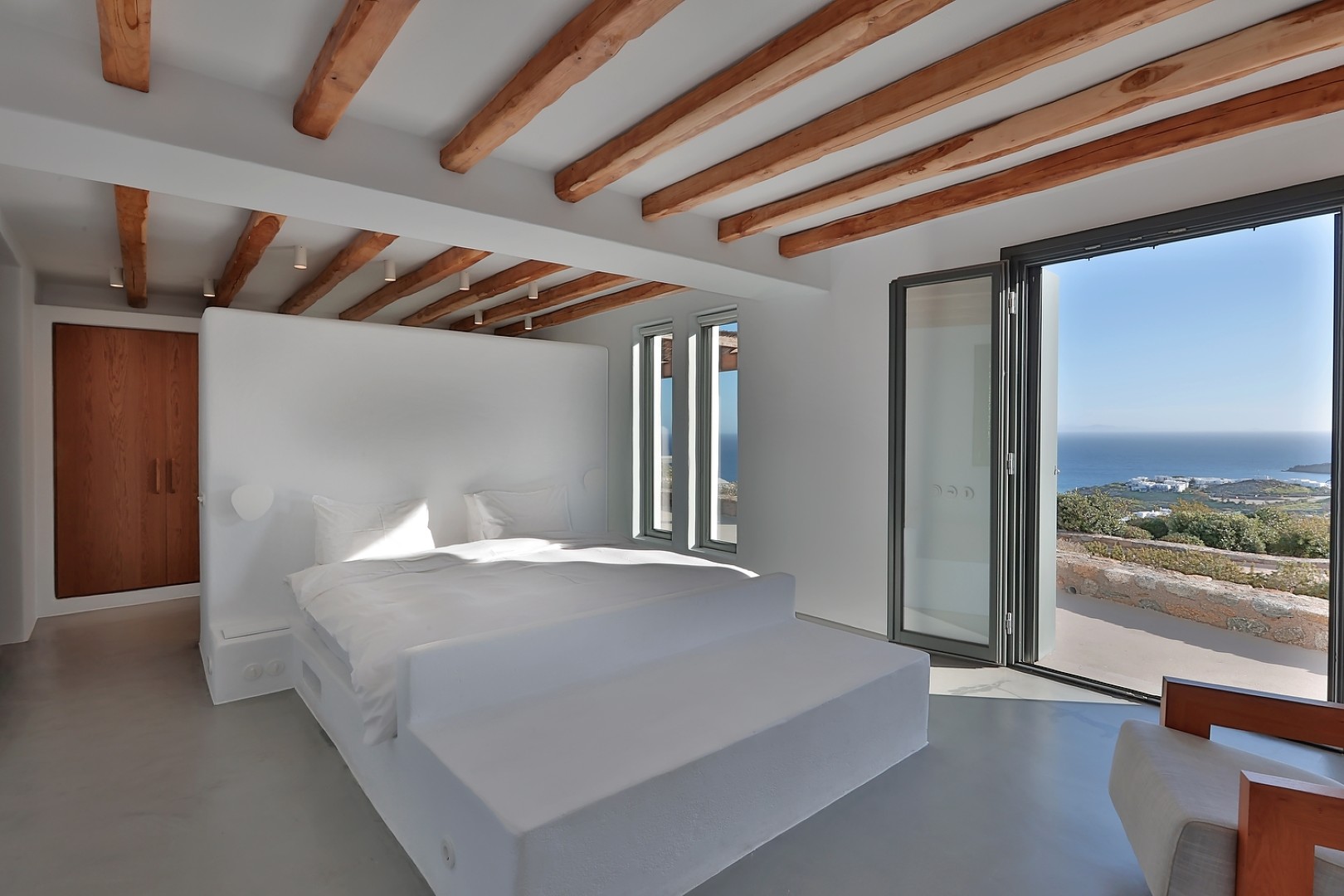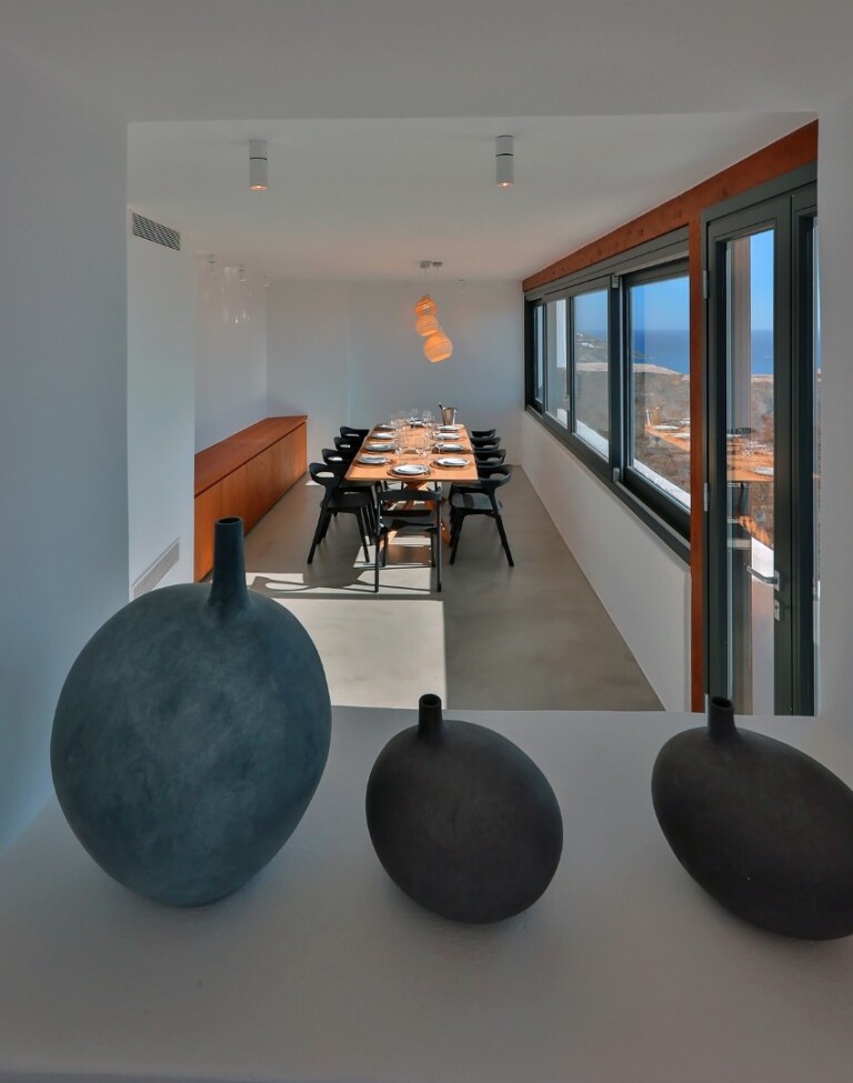 Designed with clean lines and natural textures, the villa combines contemporary comfort with the understated elegance of the Cyclades. Expansive living areas open directly onto wide terraces, where indoor and outdoor spaces blend seamlessly. Floor-to-ceiling openings frame the sea and fill the interiors with light throughout the day.
