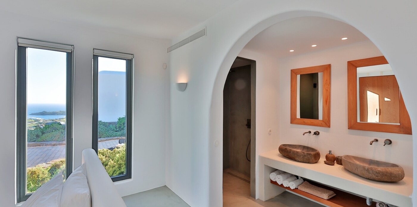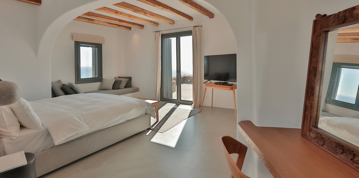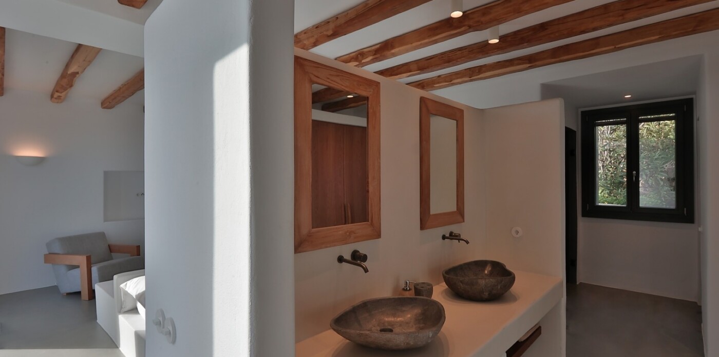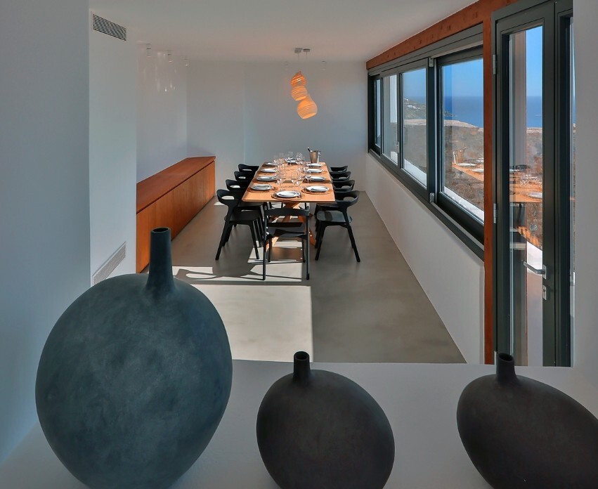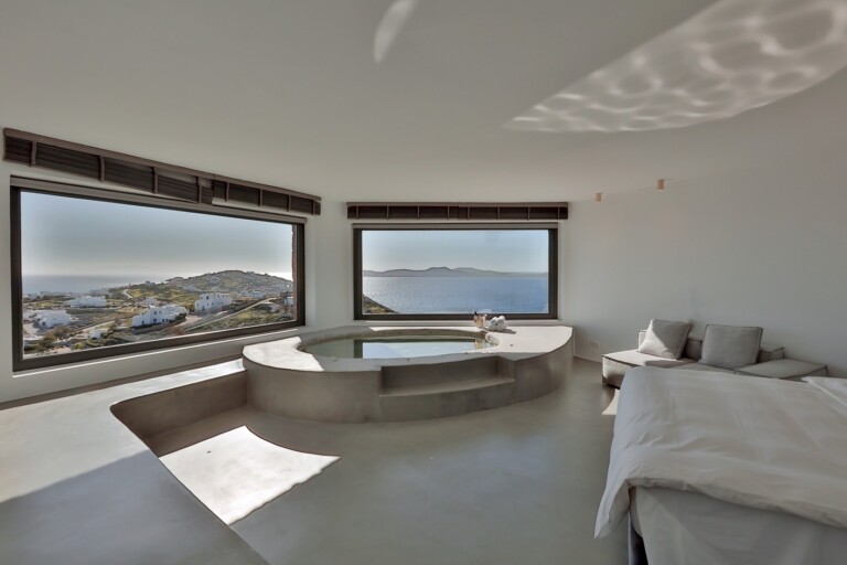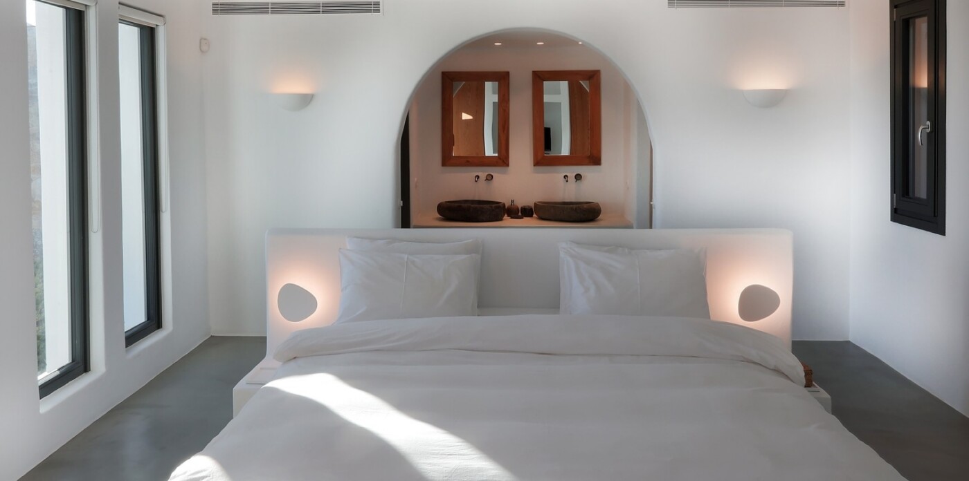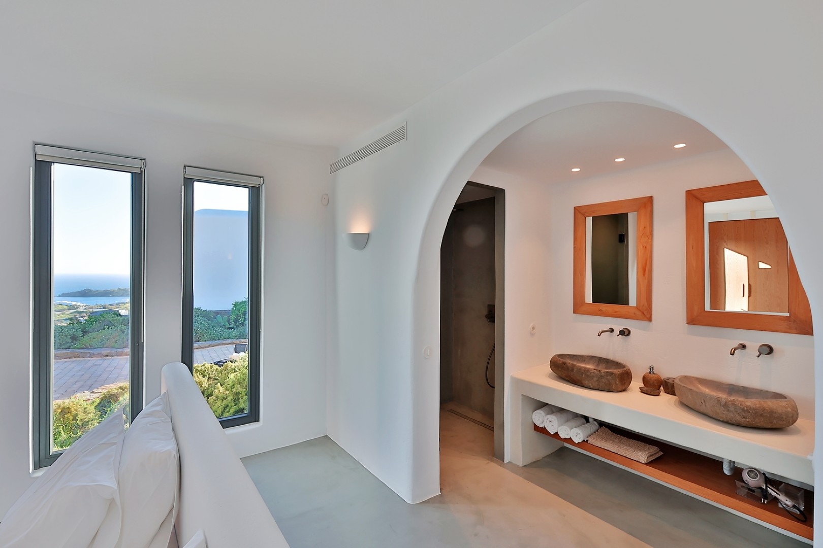 Designed with clean lines and natural textures, the villa combines contemporary comfort with the understated elegance of the Cyclades. Expansive living areas open directly onto wide terraces, where indoor and outdoor spaces blend seamlessly. Floor-to-ceiling openings frame the sea and fill the interiors with light throughout the day.