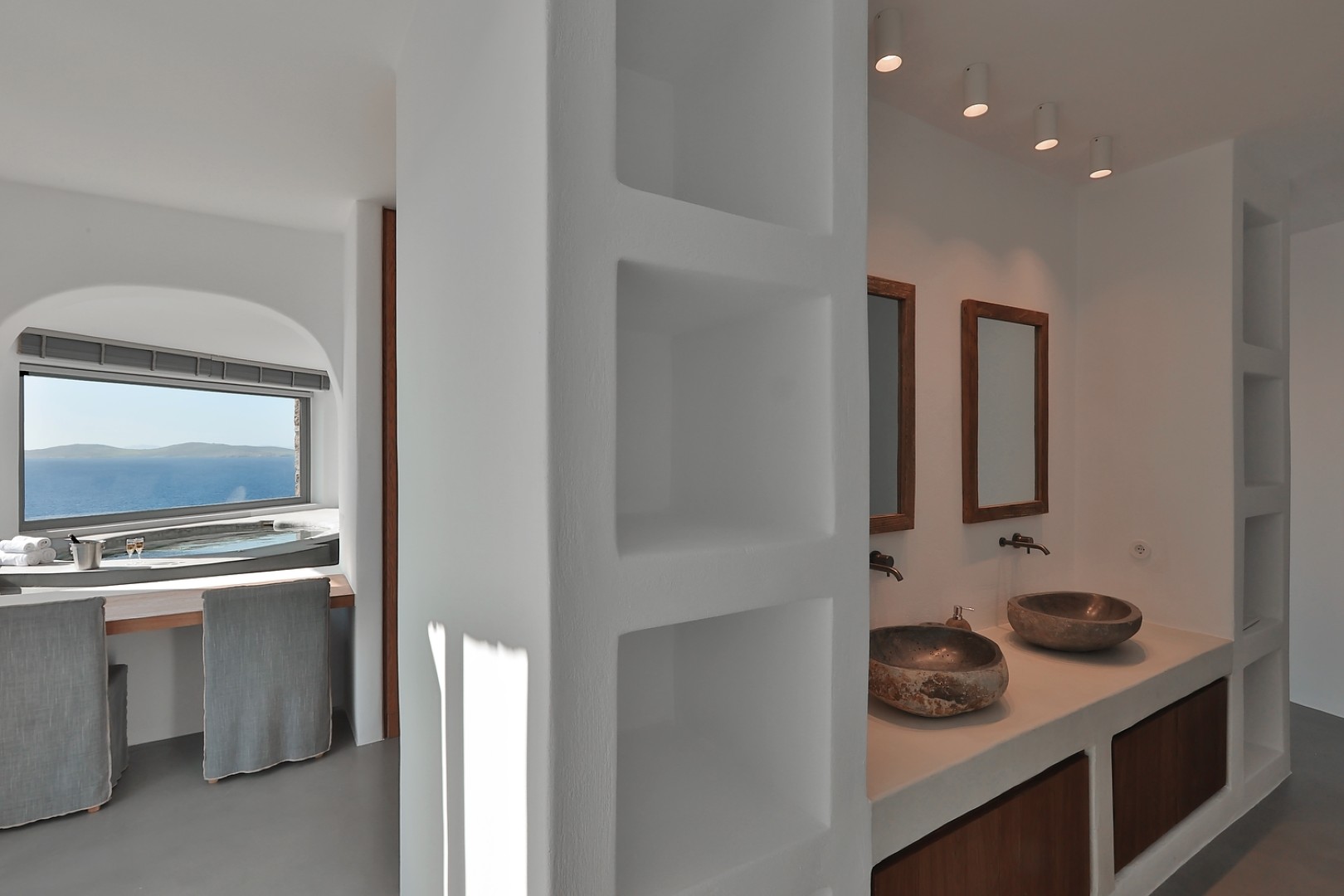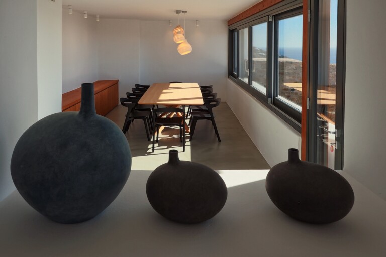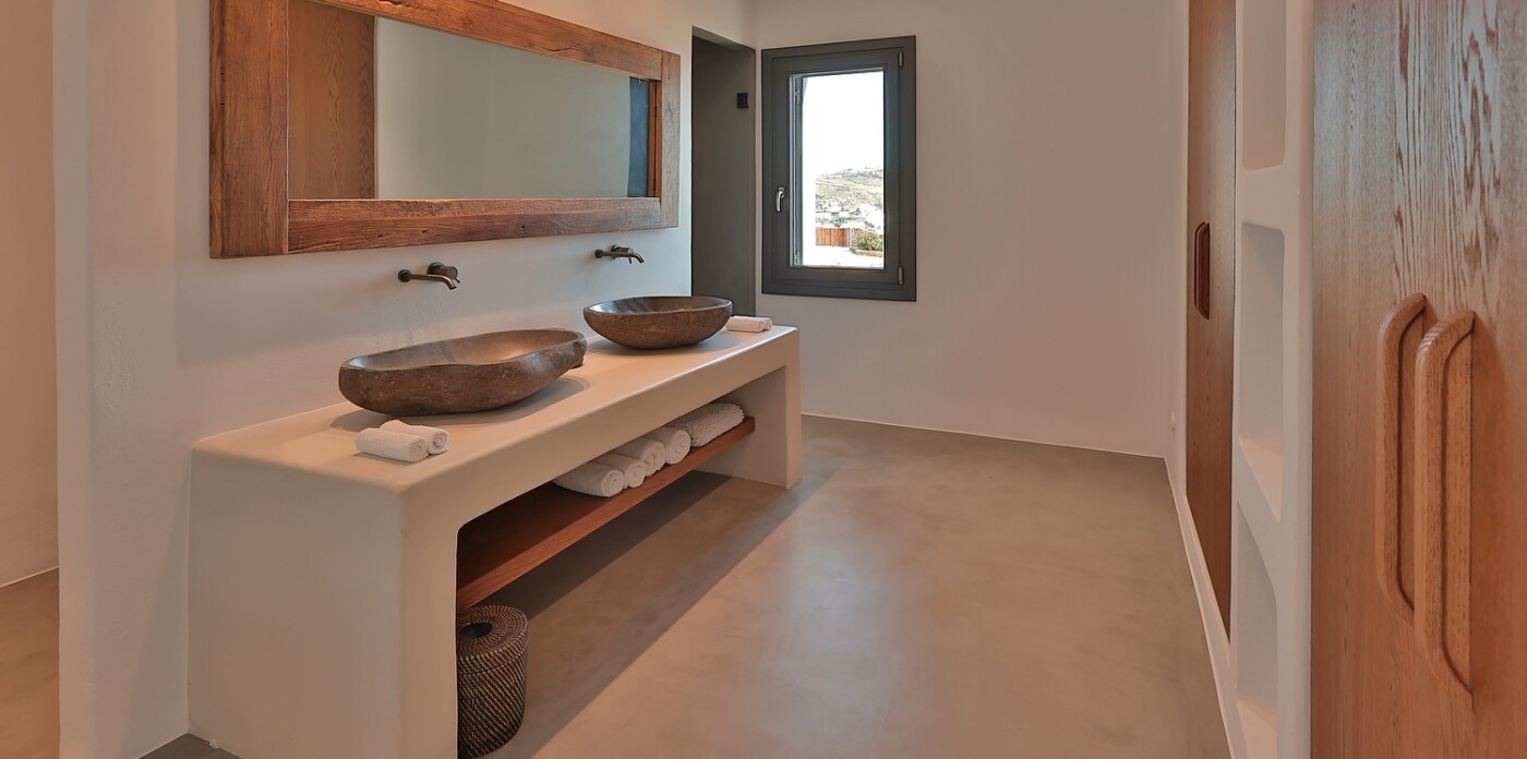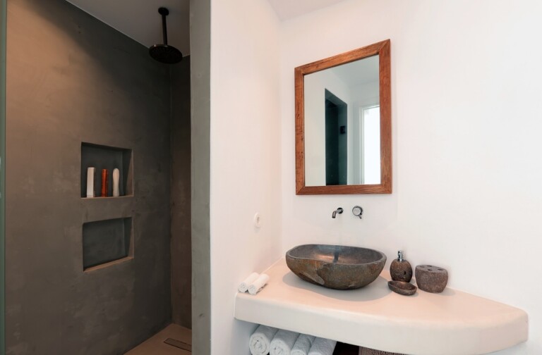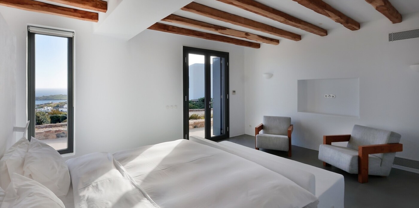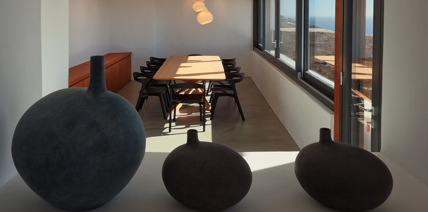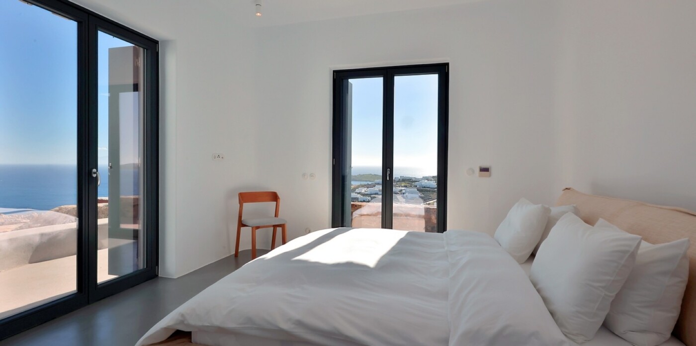 Designed with clean lines and natural textures, the villa combines contemporary comfort with the understated elegance of the Cyclades. Expansive living areas open directly onto wide terraces, where indoor and outdoor spaces blend seamlessly. Floor-to-ceiling openings frame the sea and fill the interiors with light throughout the day.