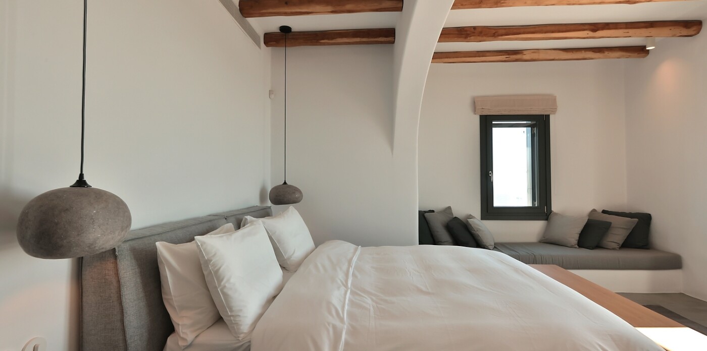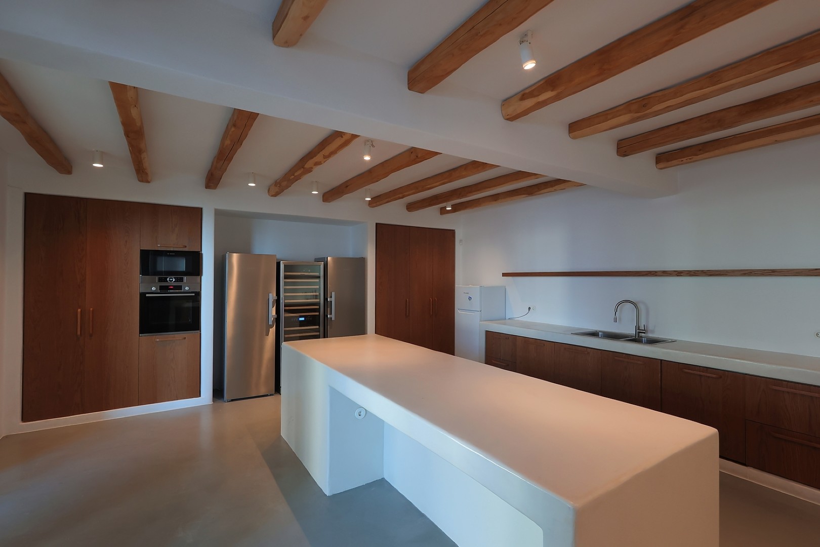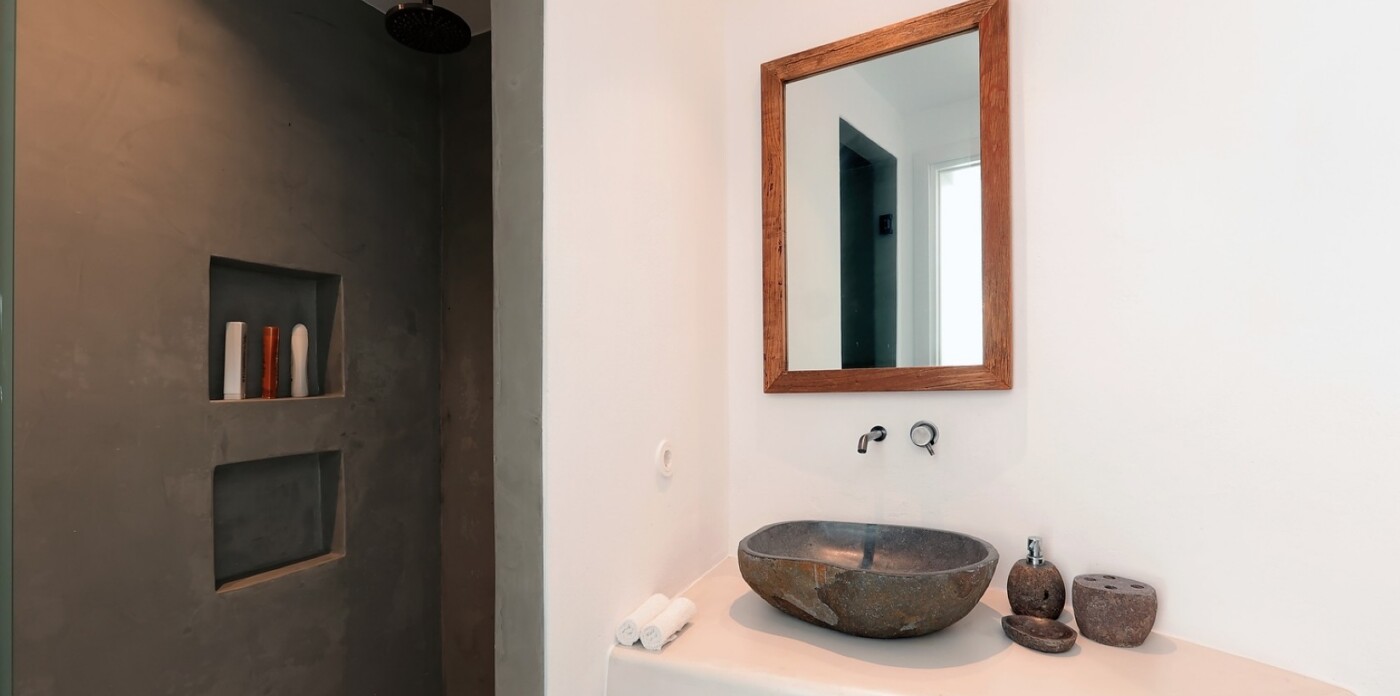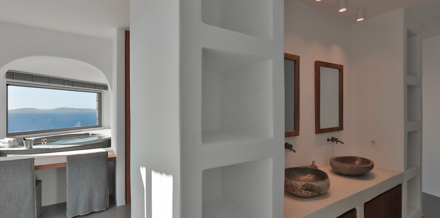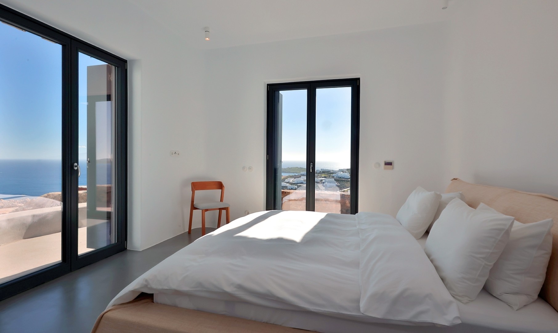 Designed with clean lines and natural textures, the villa combines contemporary comfort with the understated elegance of the Cyclades. Expansive living areas open directly onto wide terraces, where indoor and outdoor spaces blend seamlessly. Floor-to-ceiling openings frame the sea and fill the interiors with light throughout the day.