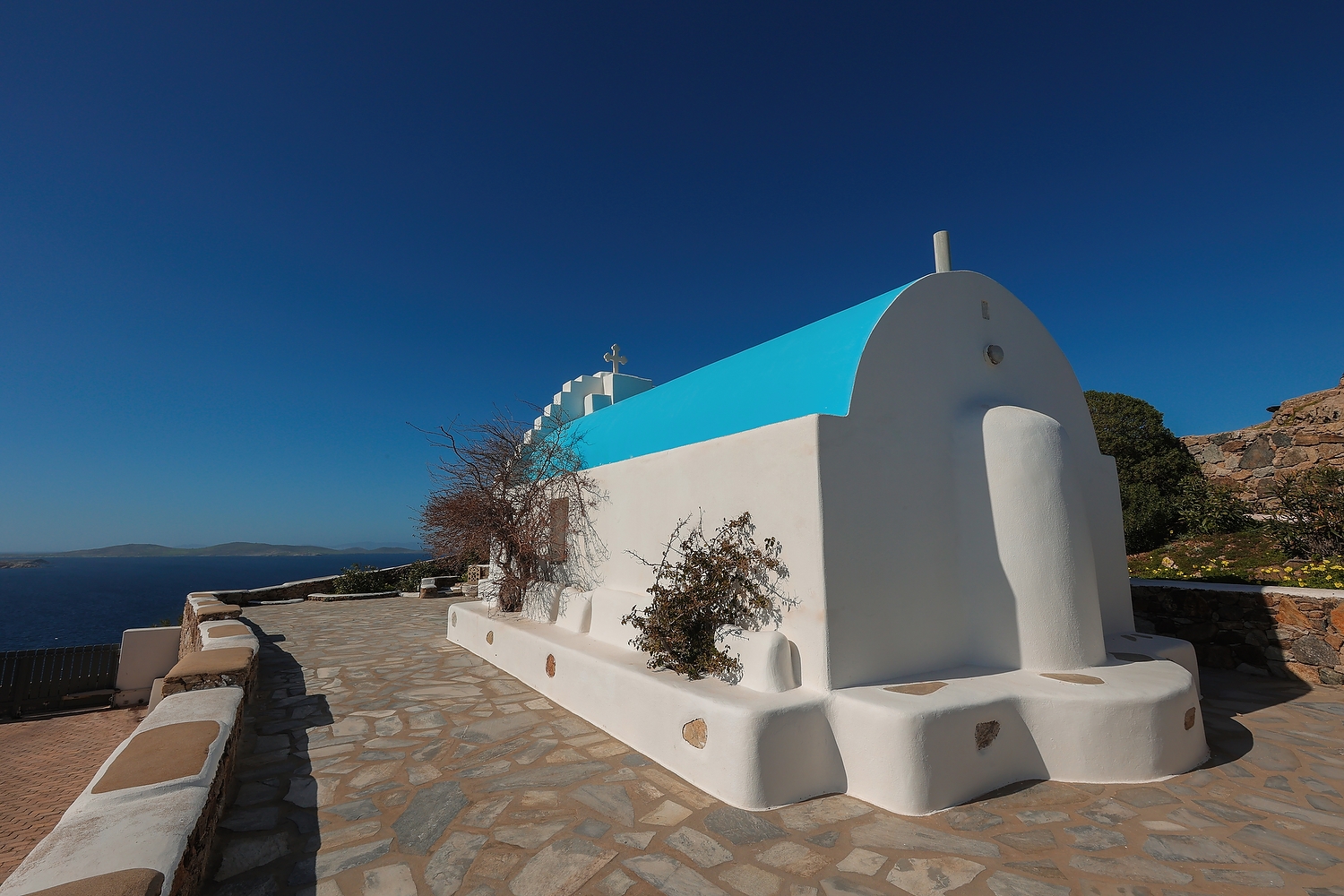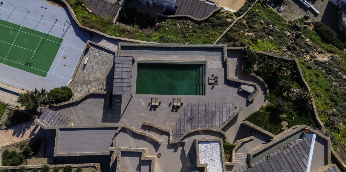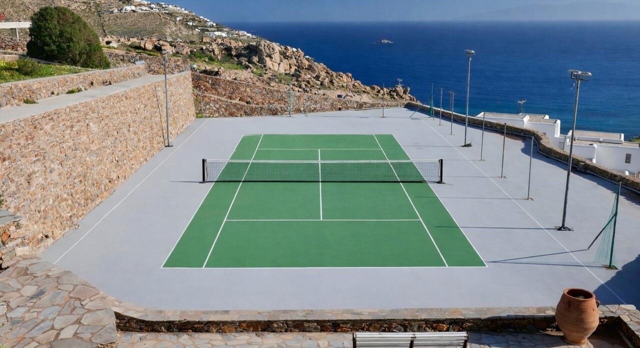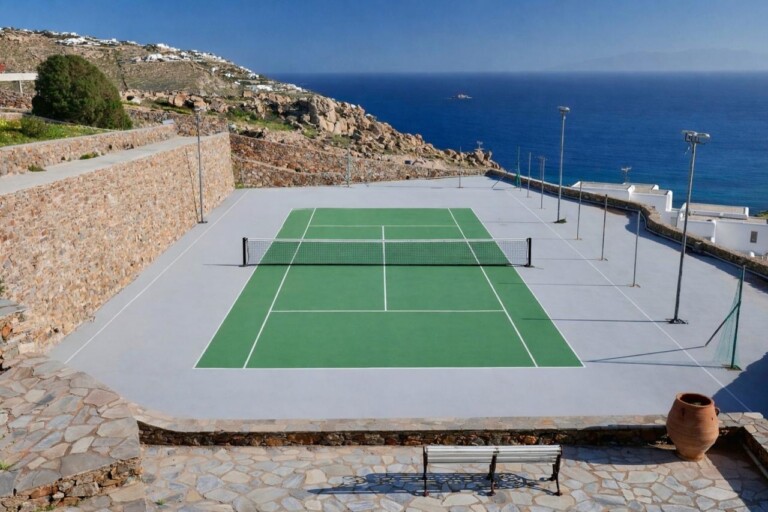 Outdoors, an infinity pool overlooks the horizon, surrounded by shaded lounges and dining spaces designed for long summer afternoons and sunset dinners. A private tennis court offers an additional amenity rarely found on the island, while a charming private chapel provides a distinctive setting for intimate celebrations.