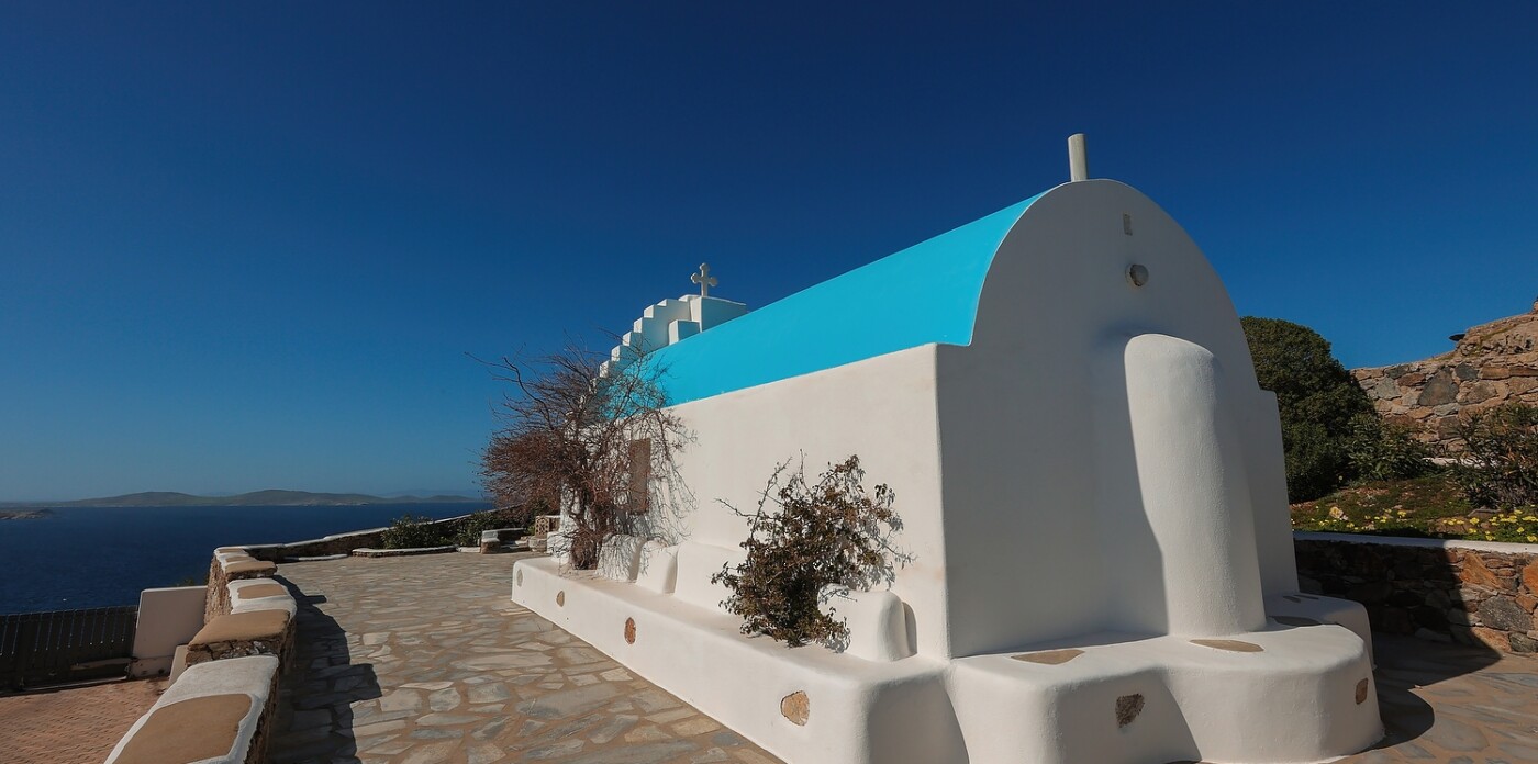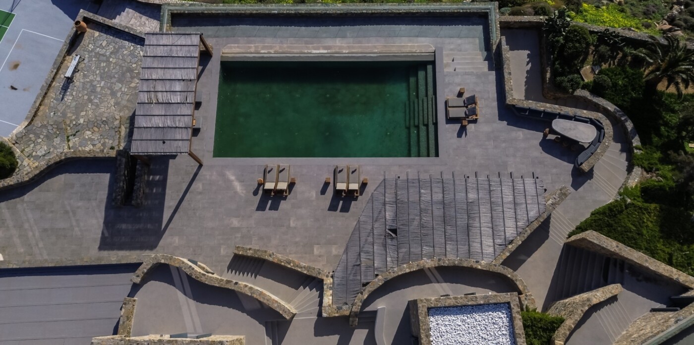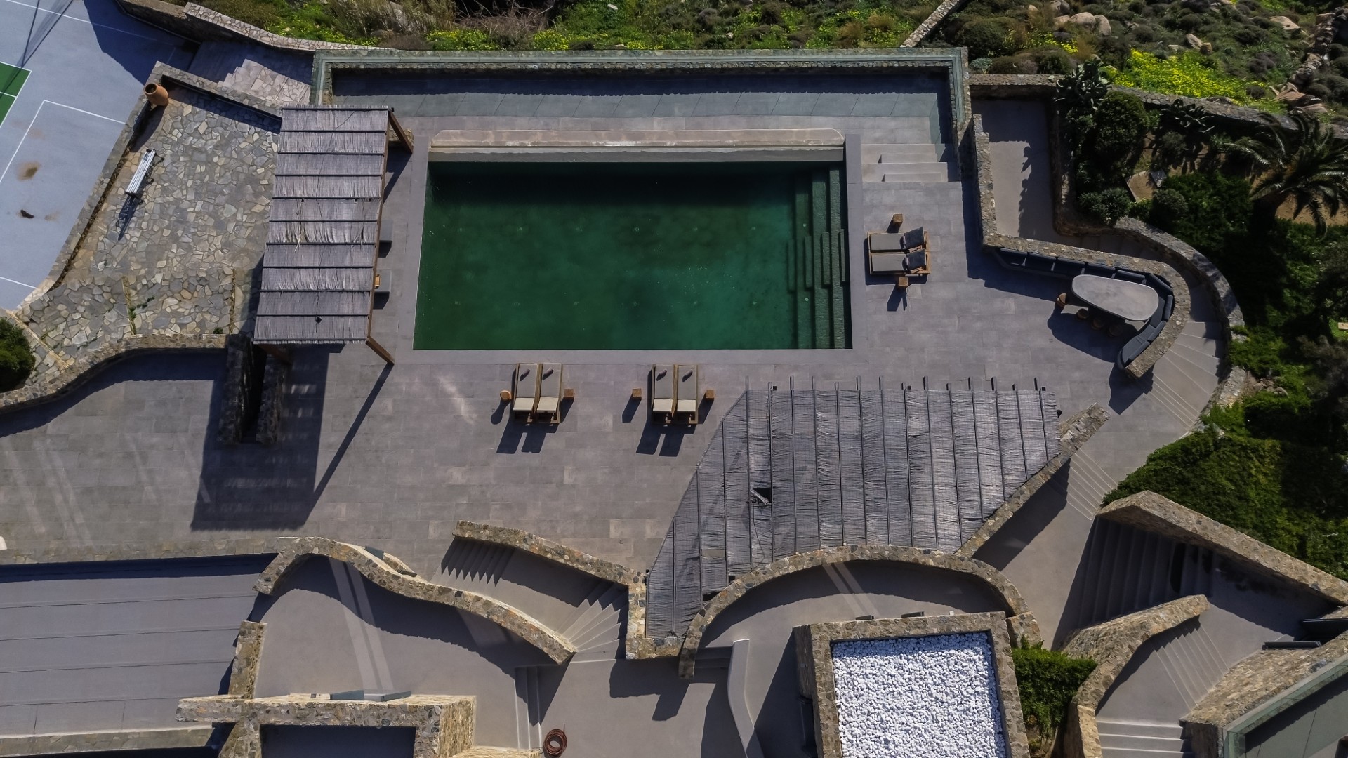 Outdoors, an infinity pool overlooks the horizon, surrounded by shaded lounges and dining spaces designed for long summer afternoons and sunset dinners. A private tennis court offers an additional amenity rarely found on the island, while a charming private chapel provides a distinctive setting for intimate celebrations.