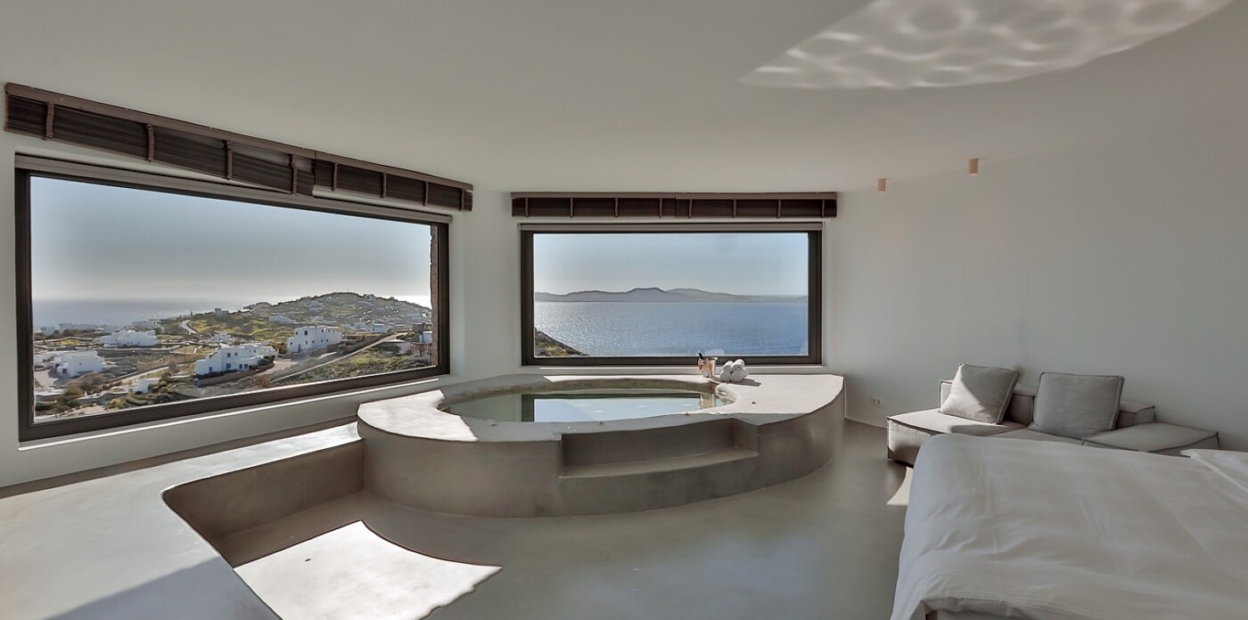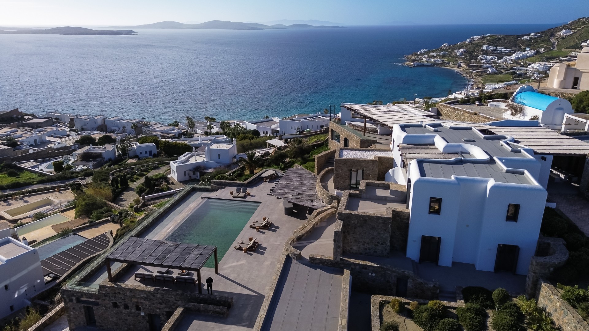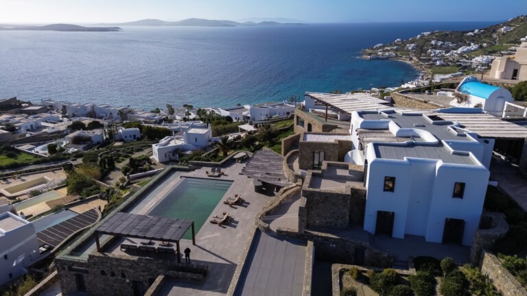 Located in Agios Ioannis, one of Mykonos’ most desirable waterfront locations and only 2-3 minutes drive from the famous beach of Psarou and Ornos, this newly built 9-bedroom villa with 3 additional staff rooms offers privacy, panoramic Aegean views, and generous space for refined summer living.