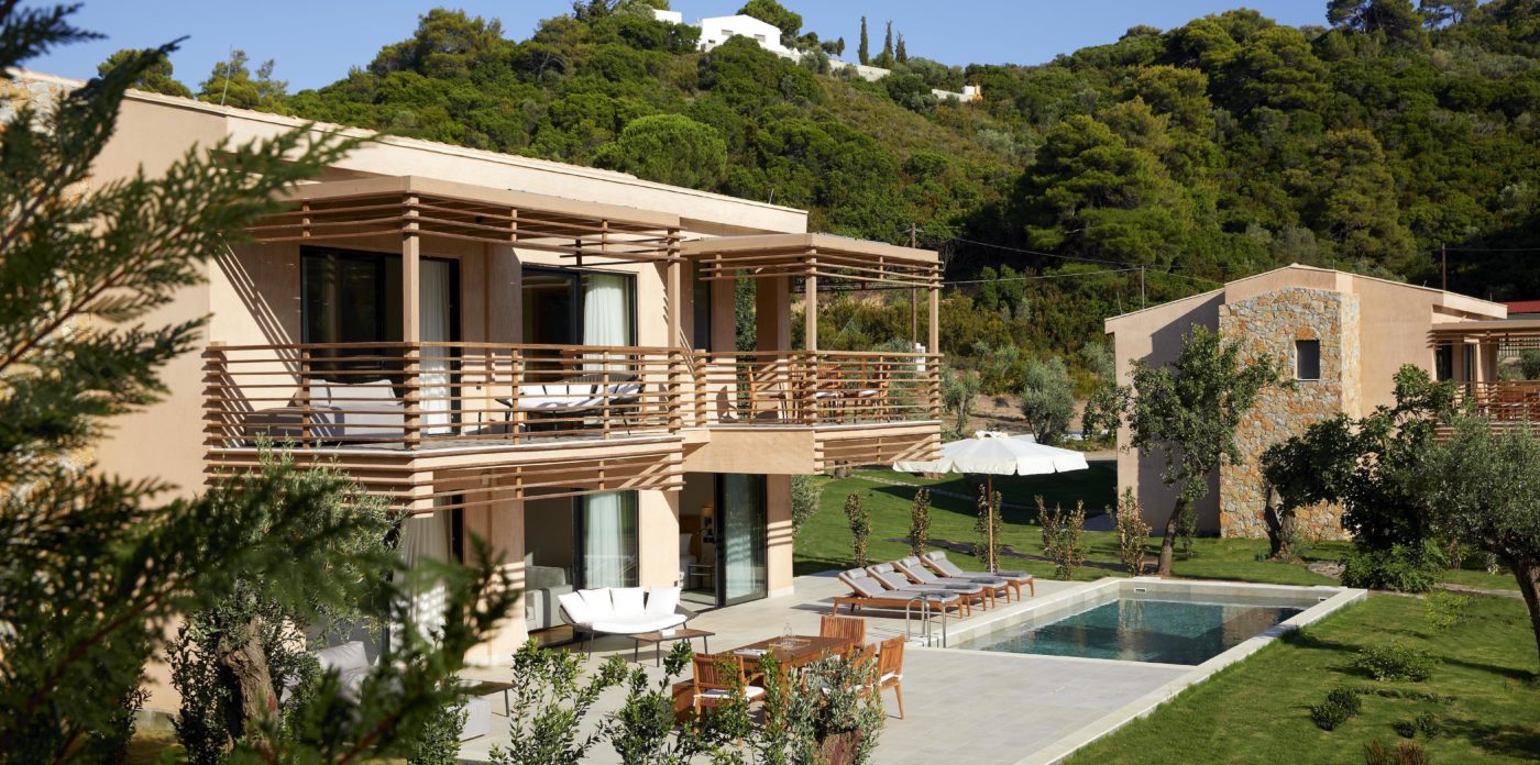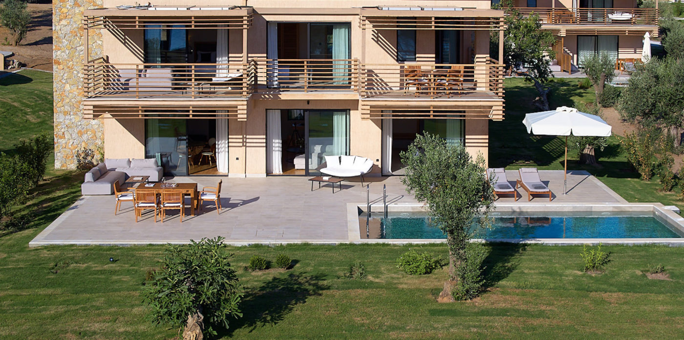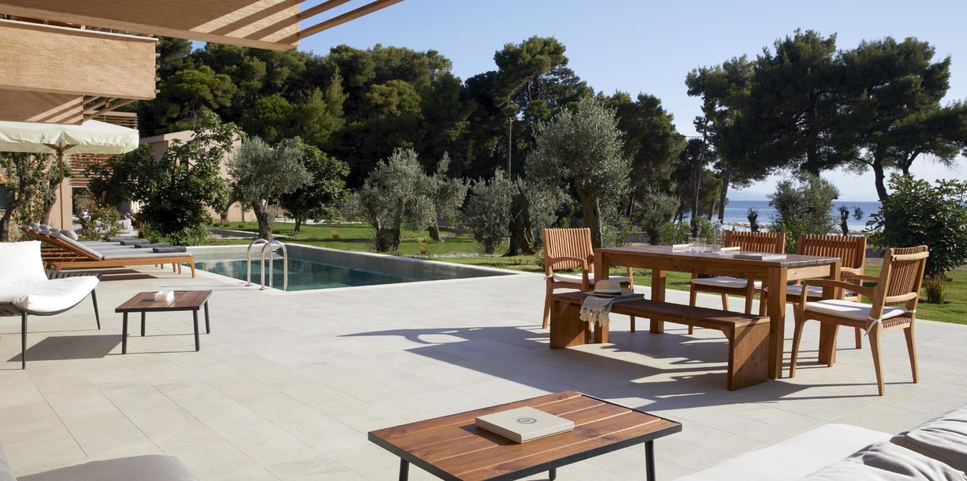 Cornelia a 200 sqm villa-suite, set in a green scenery of olive trees, pines and cultivated wild flora, in front of the beach, offers a true connection with nature. It may accommodate up to eight people and two children in its four bedrooms and features a 36sqm pool, with 100sqm terrace on the ground floor and a 32sqm veranda on the first floor. A beautiful sitting area, kitchen and dining area, look out over the sea that stretches out in front of Big Banana beach.