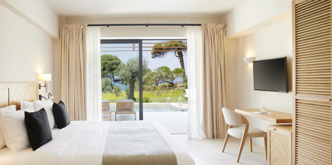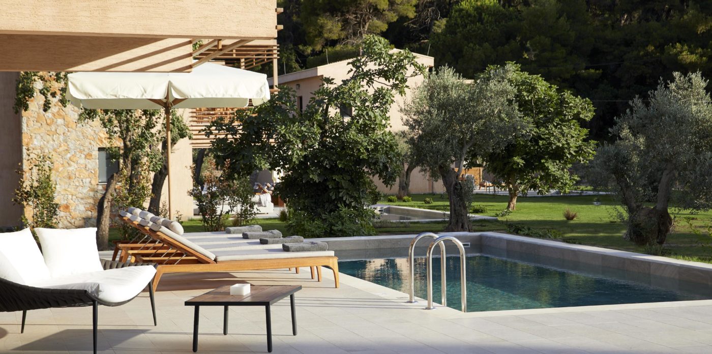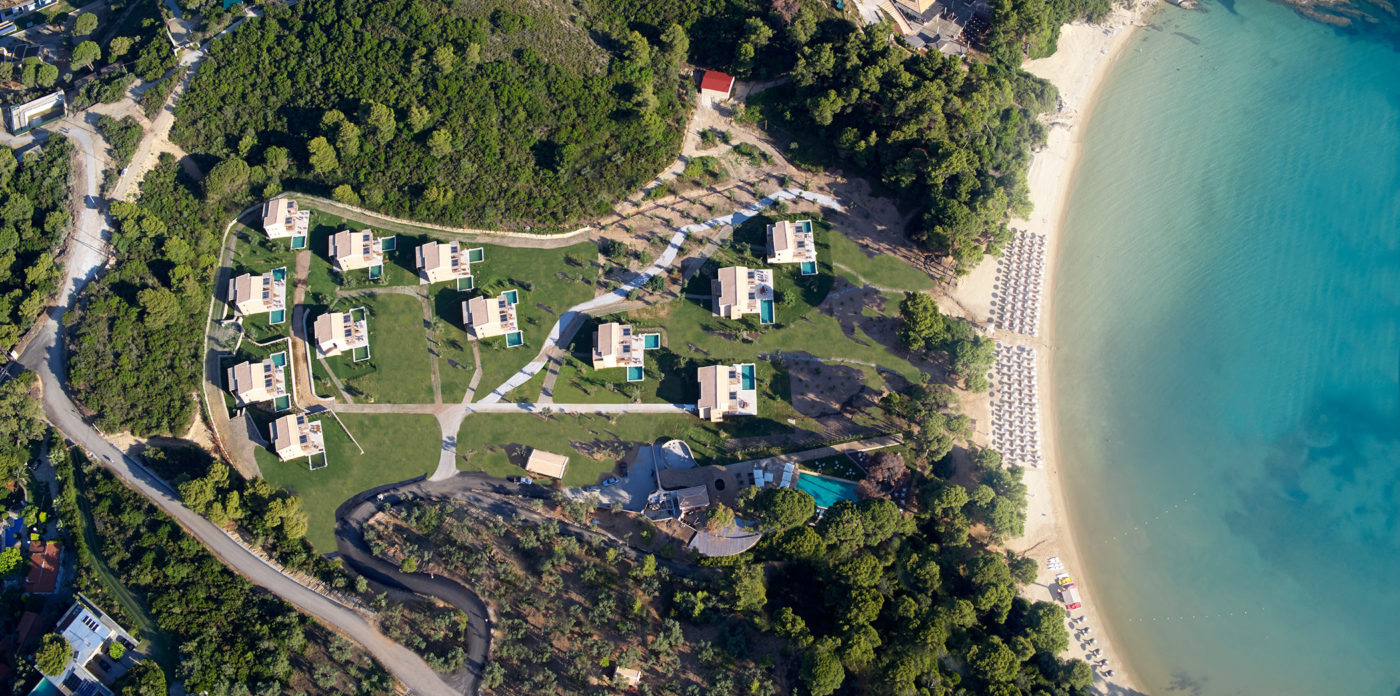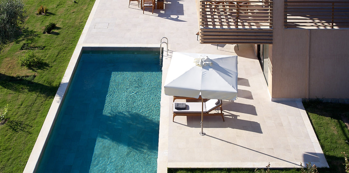 Cornelia a 200 sqm villa-suite, set in a green scenery of olive trees, pines and cultivated wild flora, in front of the beach, offers a true connection with nature. It may accommodate up to eight people and two children in its four bedrooms and features a 36sqm pool, with 100sqm terrace on the ground floor and a 32sqm veranda on the first floor. A beautiful sitting area, kitchen and dining area, look out over the sea that stretches out in front of Big Banana beach.