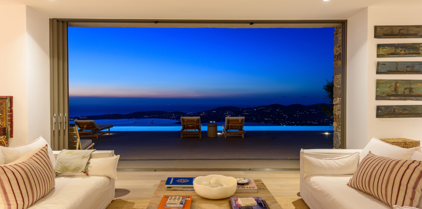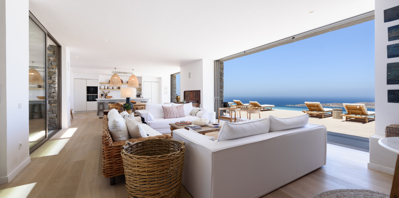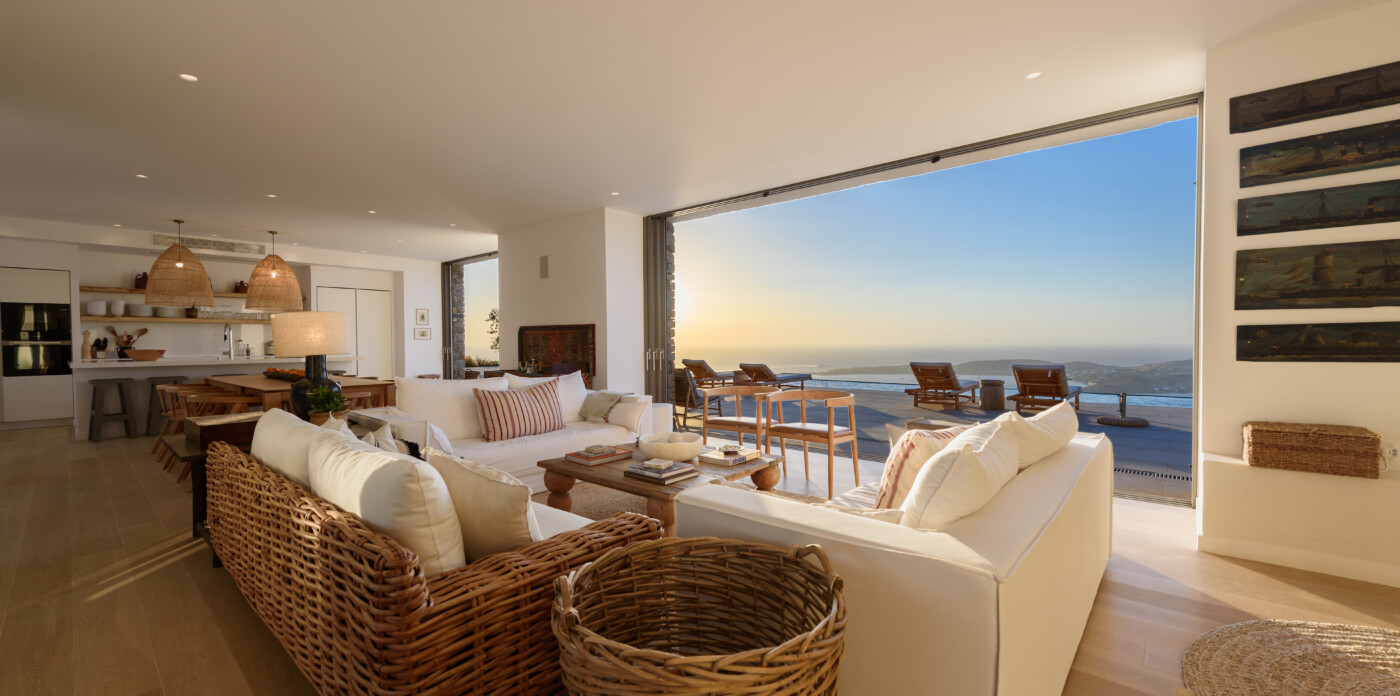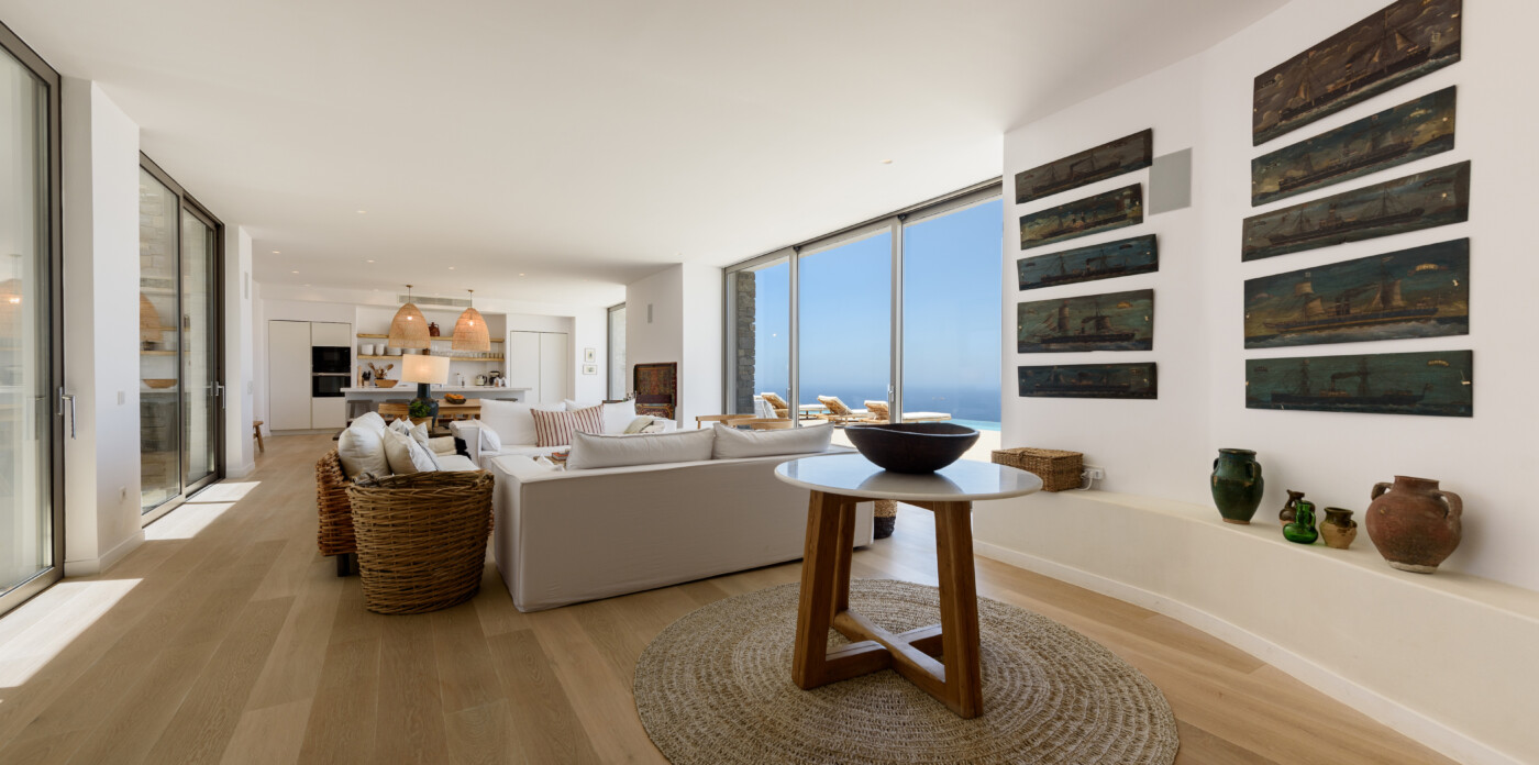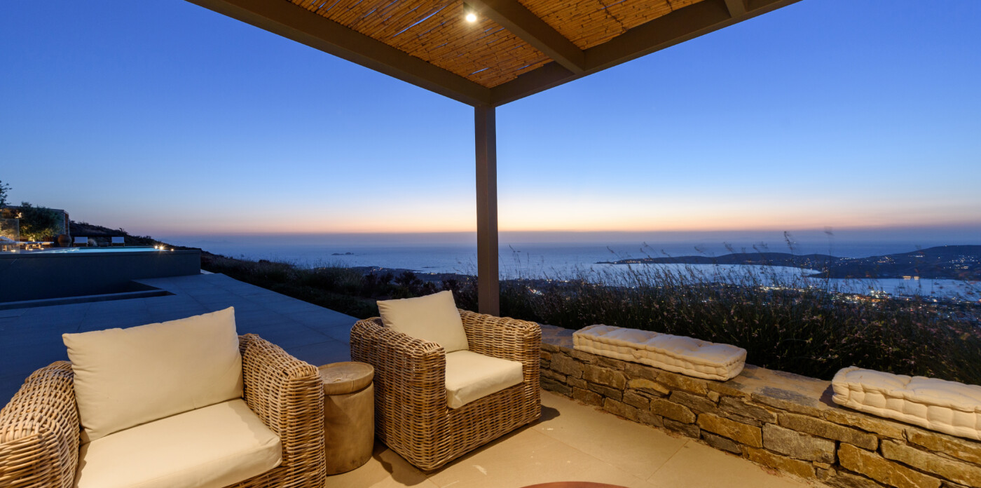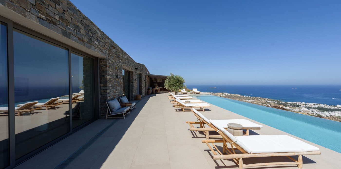 Crystalline, is a magnificent 6-bedroom brand new villa that offers breathtaking panoramic views of the Aegean Sea and the islands of Mykonos, Syros and Serifos. Situated on an elevated plot, the villa combines modern luxury with the desirable Cycladic charm, featuring sleek architectural lines and natural stone elements. Its crystal clear views of the endless sea and sky will just enchant you at first sight. Here you may enjoy the most astonishing sunsets and breathtaking views all day long.