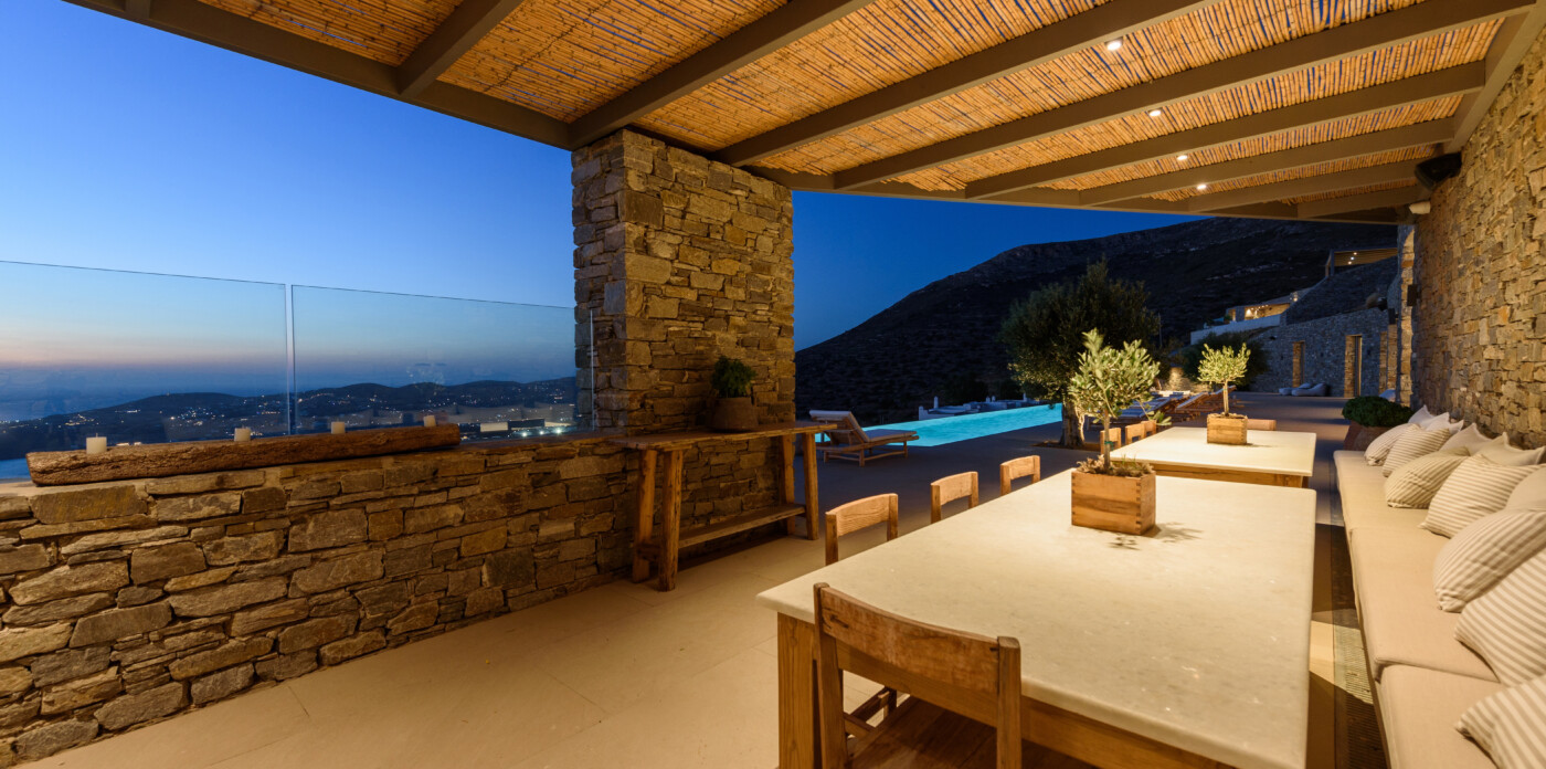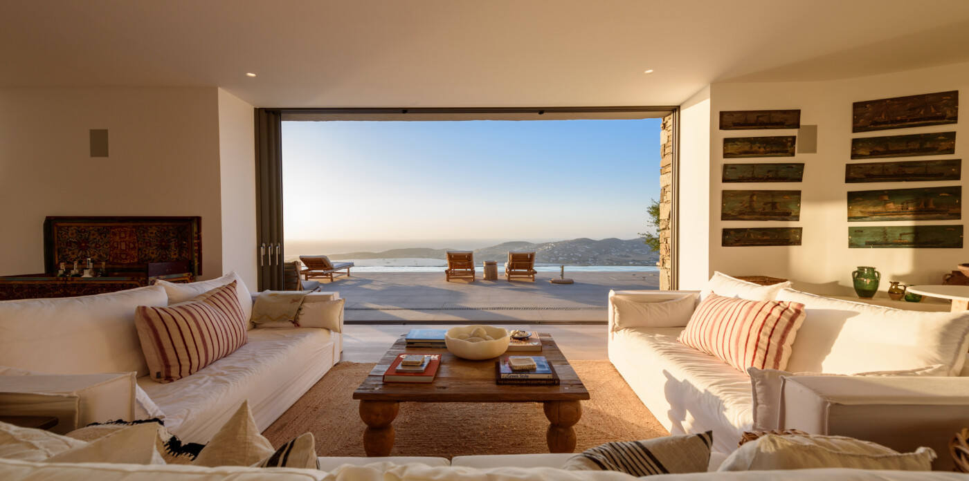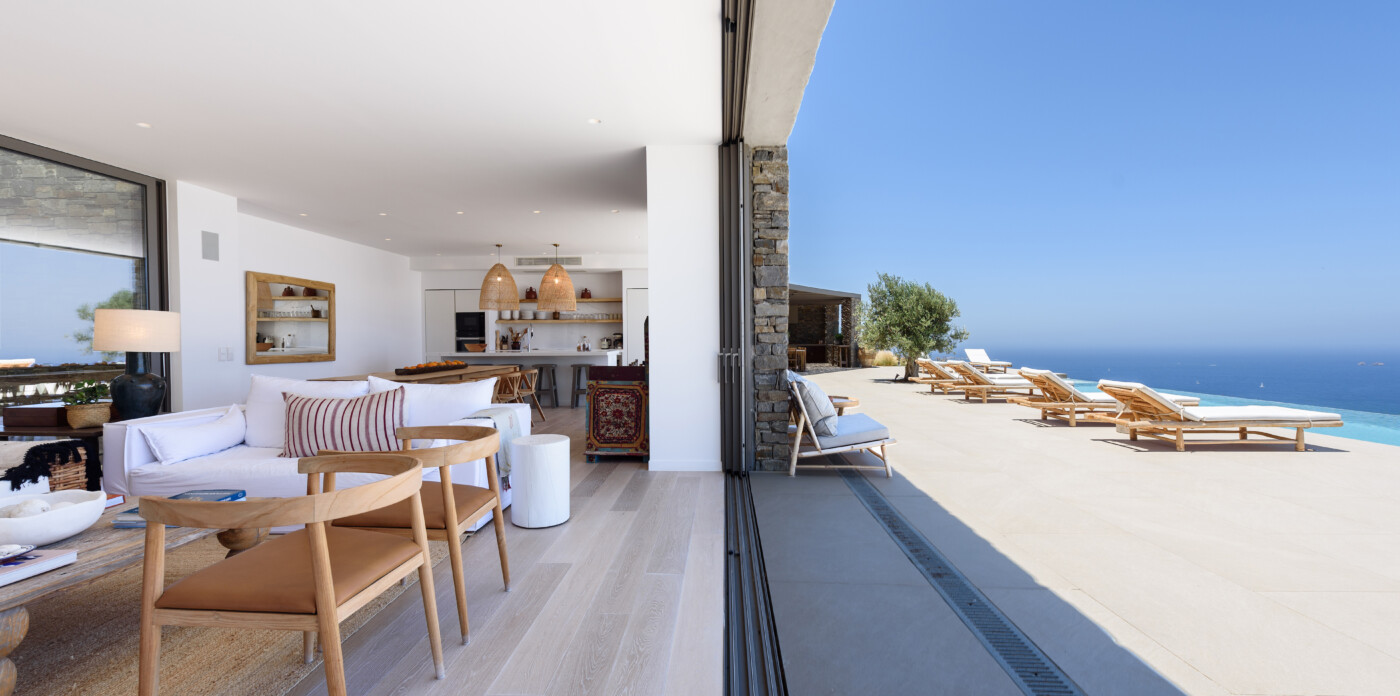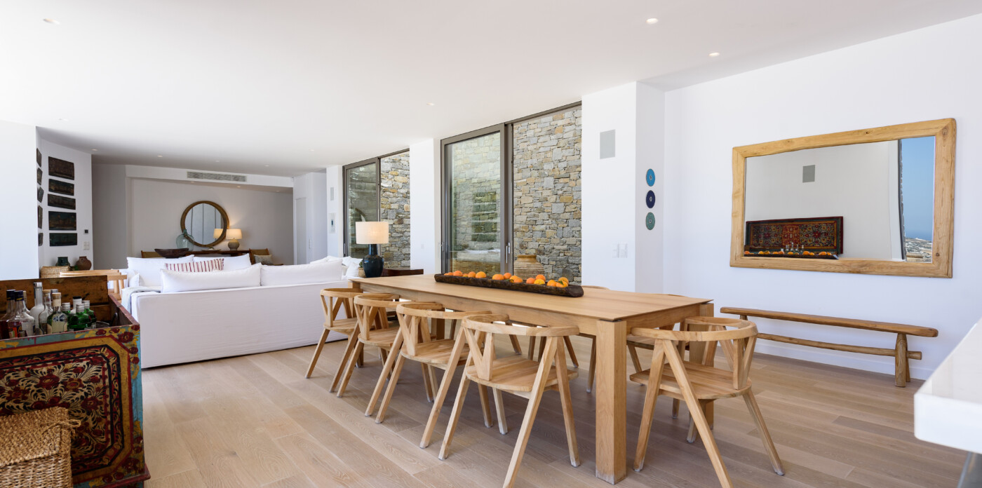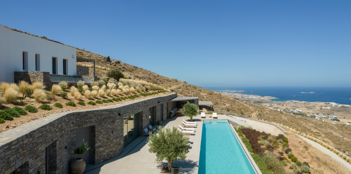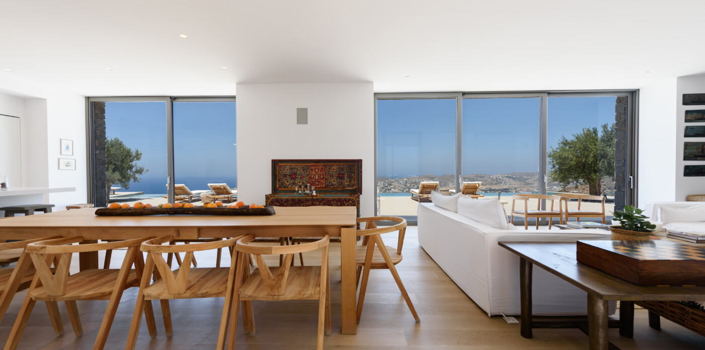 Crystalline, is a magnificent 6-bedroom brand new villa that offers breathtaking panoramic views of the Aegean Sea and the islands of Mykonos, Syros and Serifos. Situated on an elevated plot, the villa combines modern luxury with the desirable Cycladic charm, featuring sleek architectural lines and natural stone elements. Its crystal clear views of the endless sea and sky will just enchant you at first sight. Here you may enjoy the most astonishing sunsets and breathtaking views all day long.