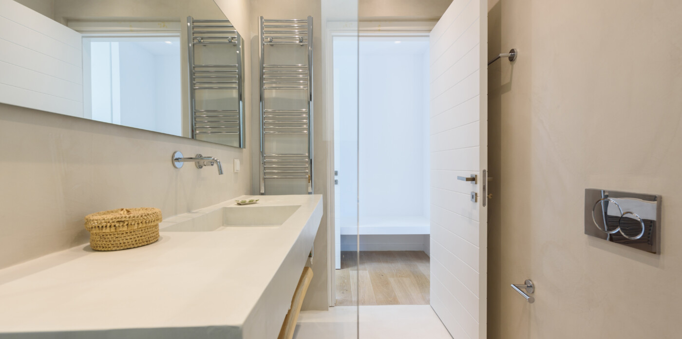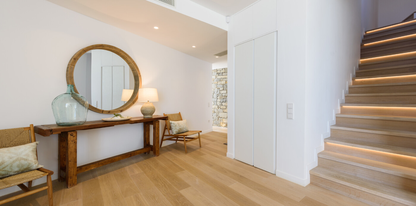 The open-plan living and dining area is designed to maximise natural light, with floor-to-ceiling windows that frame the stunning coastal views. The interior features a minimalist yet elegant style, with whitewashed walls, light wood flooring, and high-end finishes throughout. The fully equipped all white kitchen, designed for both functionality and entertaining, seamlessly flows into the living spaces and the outdoor terrace.