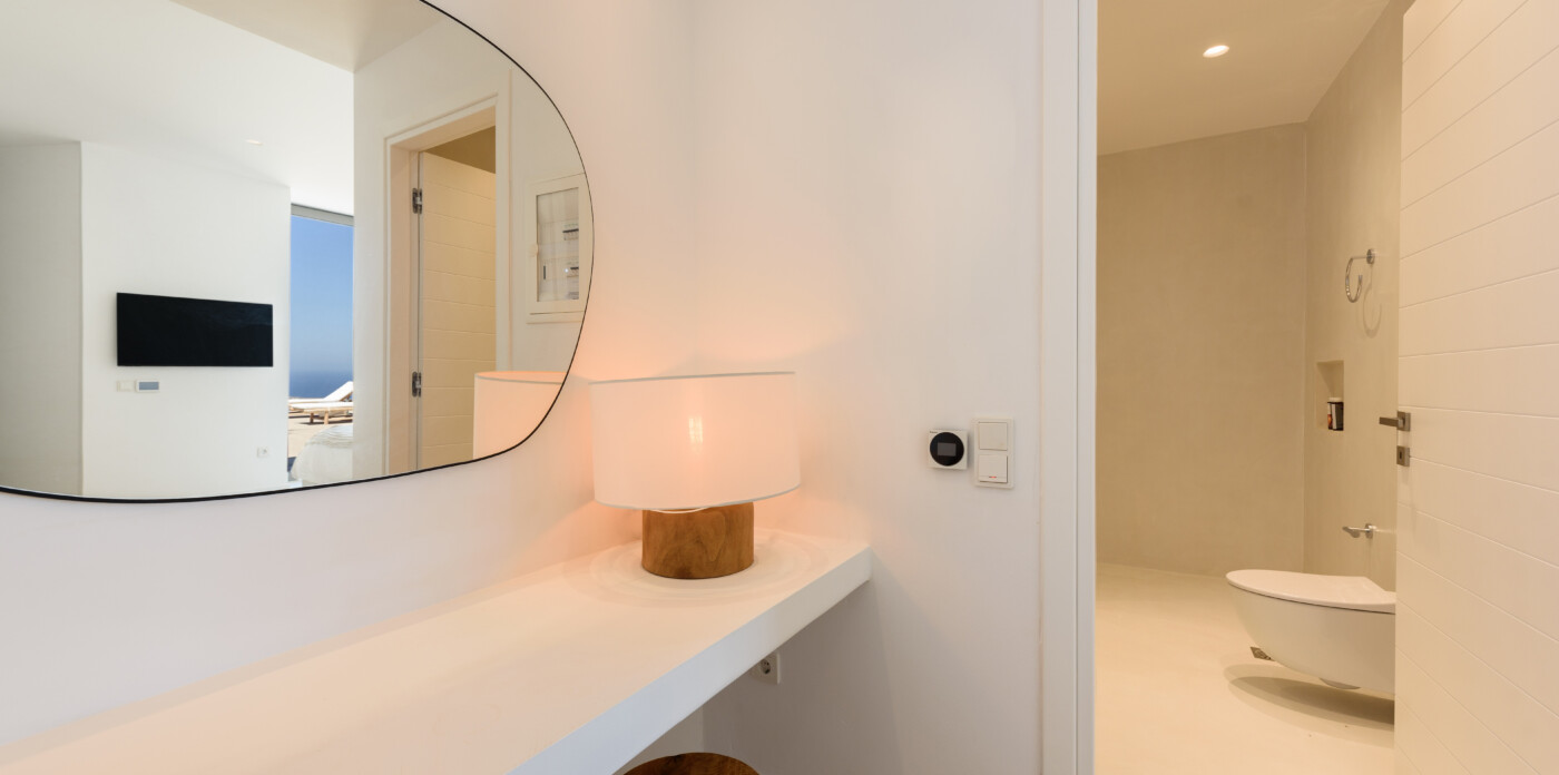 The expansive outdoor terrace is centered around a sparkling infinity pool that perfectly blends with the horizon, providing the ultimate space to relax and soak in the sun while enjoying uninterrupted sea views. Surrounded by lush Mediterranean landscaping, the property offers privacy and tranquility.