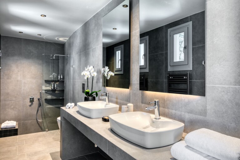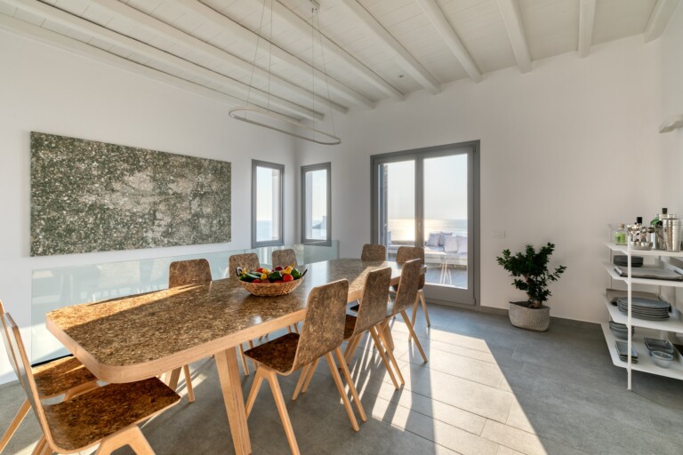 Éclat’s outdoor living experience is one of its defining features. An expansive terrace stretches across multiple levels, offering a variety of settings for every hour of the day: sun-drenched lounge areas for peaceful mornings, pergola-shaded dining spaces for al fresco meals, and thoughtfully positioned seating areas that capture the island’s legendary sunsets. At the heart of the exterior is the infinity-style pool, which visually merges with the horizon, creating the illusion of floating above the sea.