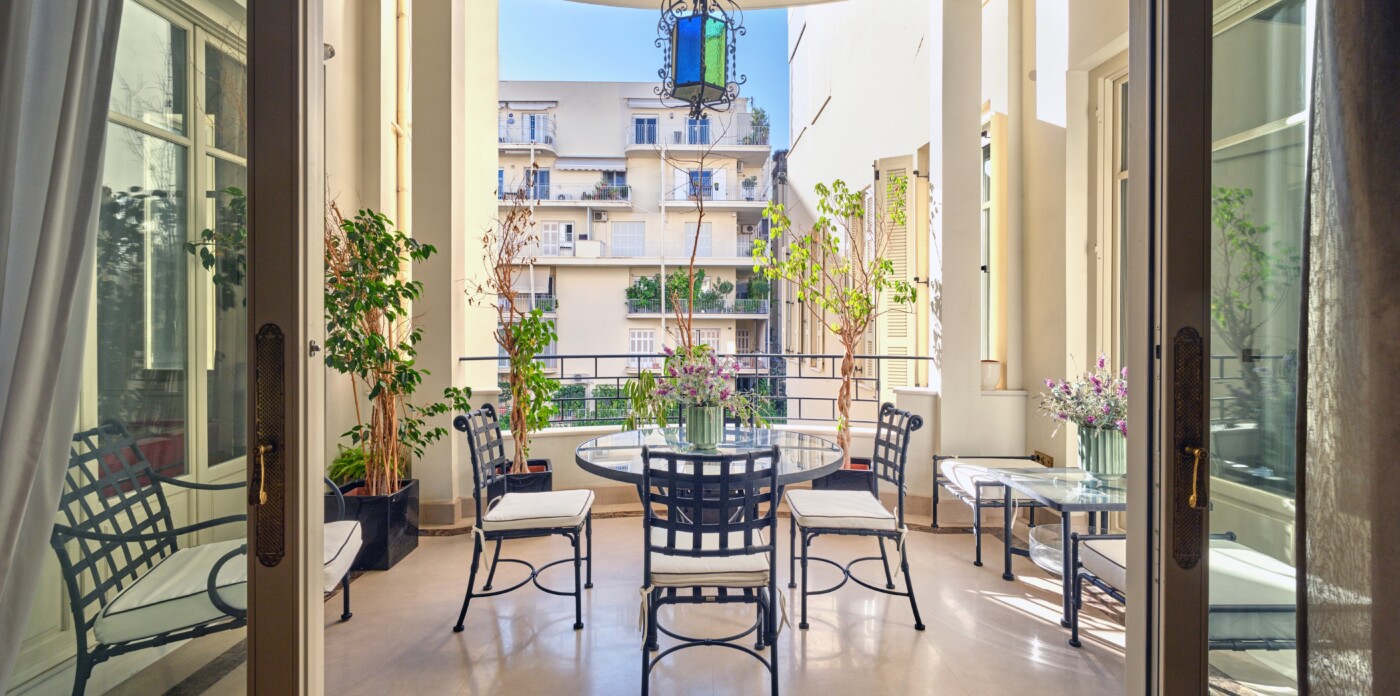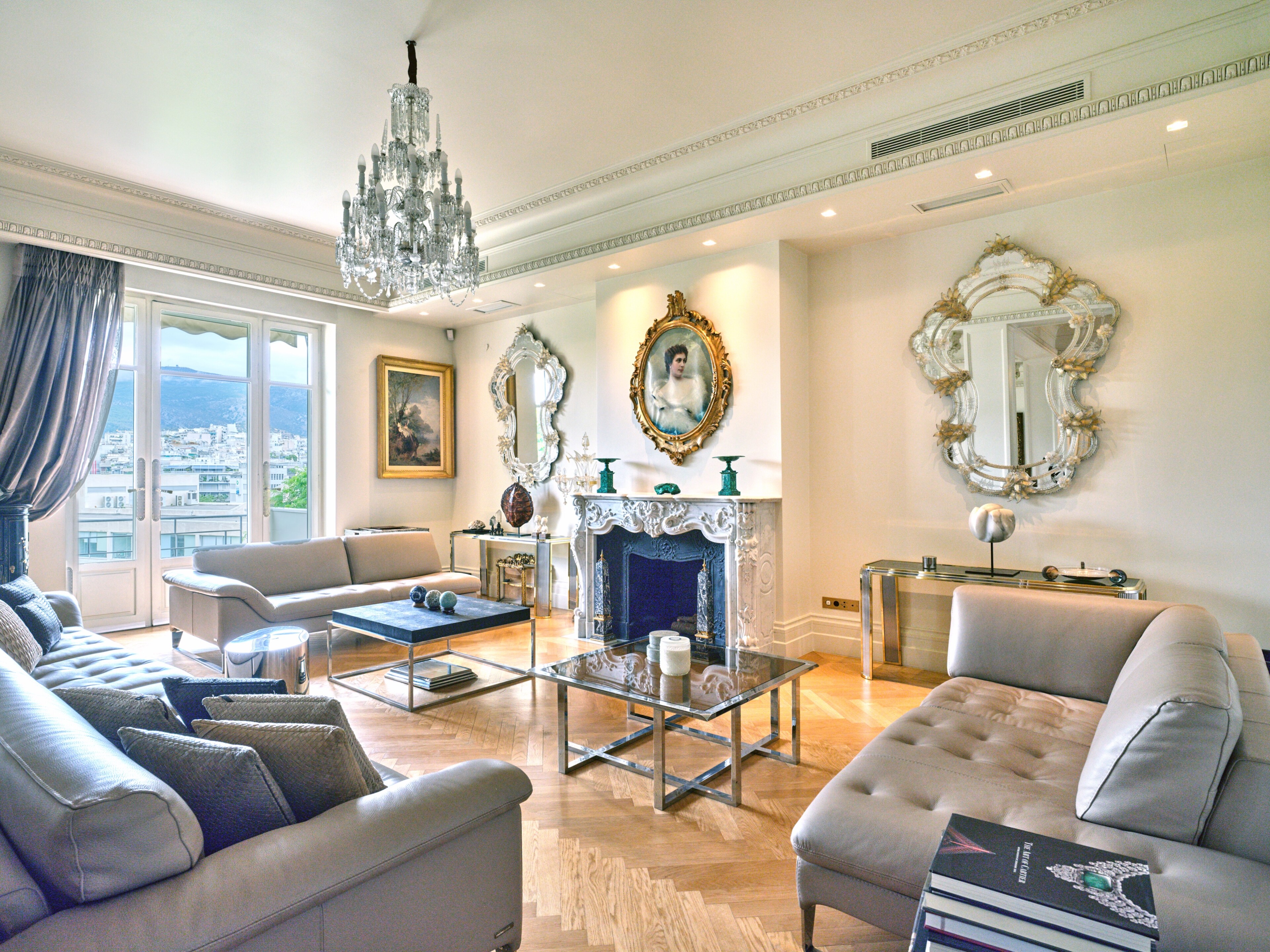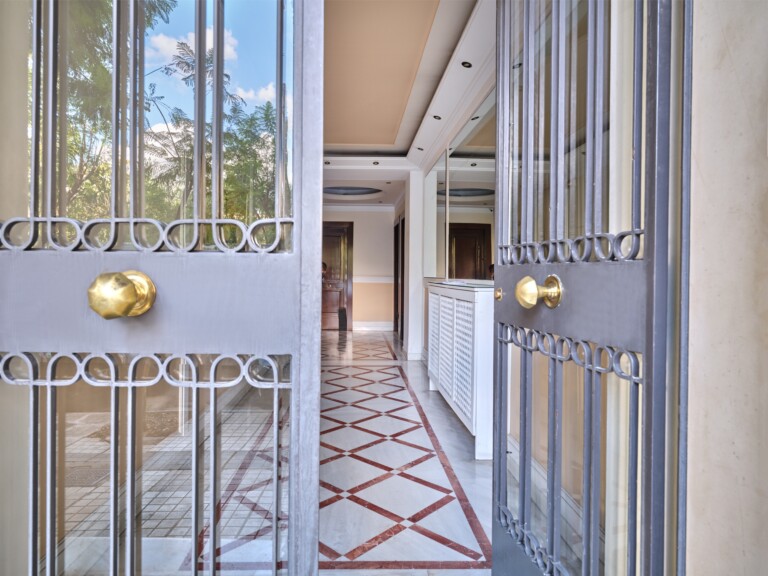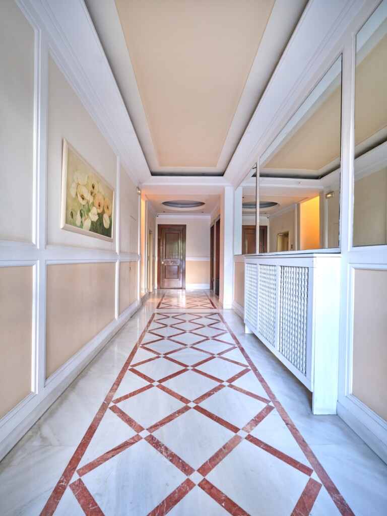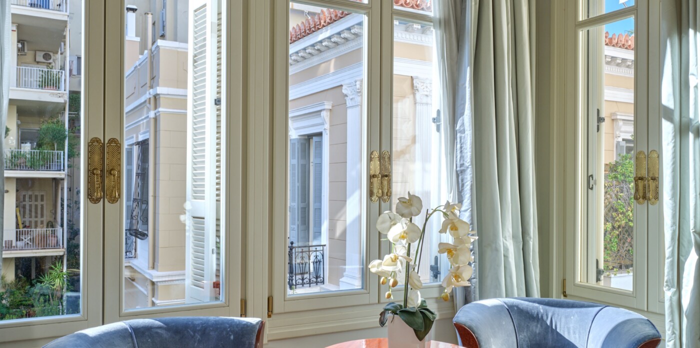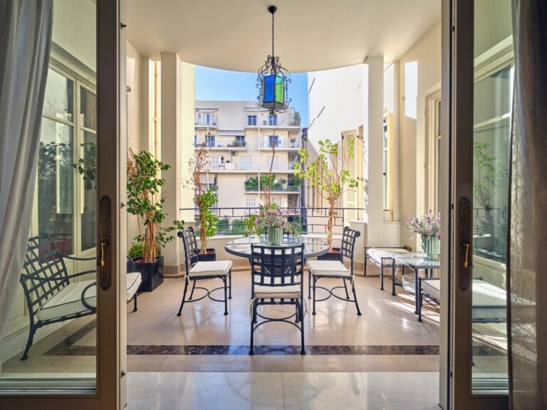 In a building that boasts pre-war architecture, the private residence is in perfect condition, featuring a mixture of luxurious modern furniture coupled with antique pieces. It offers beautiful views of Athens while it faces the Archaeological Site of the Lyceum of Aristotle ( founded in 335 BC to function as a school of philosophy) and the Athens Conservatoire. Highlight : a lovely balcony facing a stunning interior courtyard. Its vintage elevator, state of the art entrance, high ceilings, impressive common areas and frescos in certain rooms are just a few of the features that make it unique.