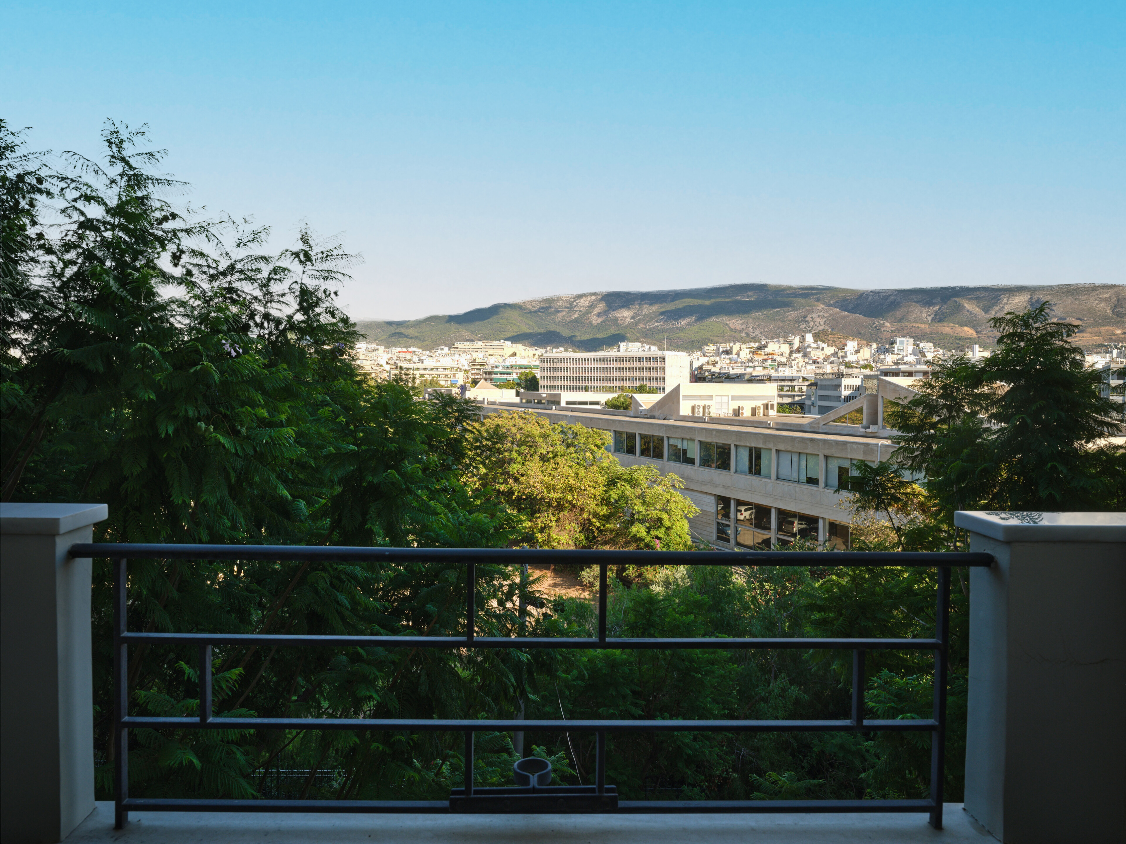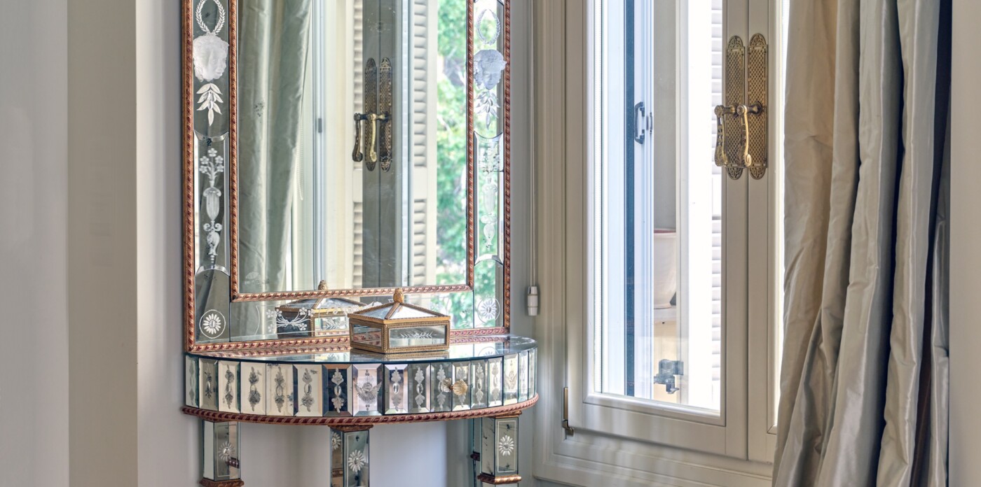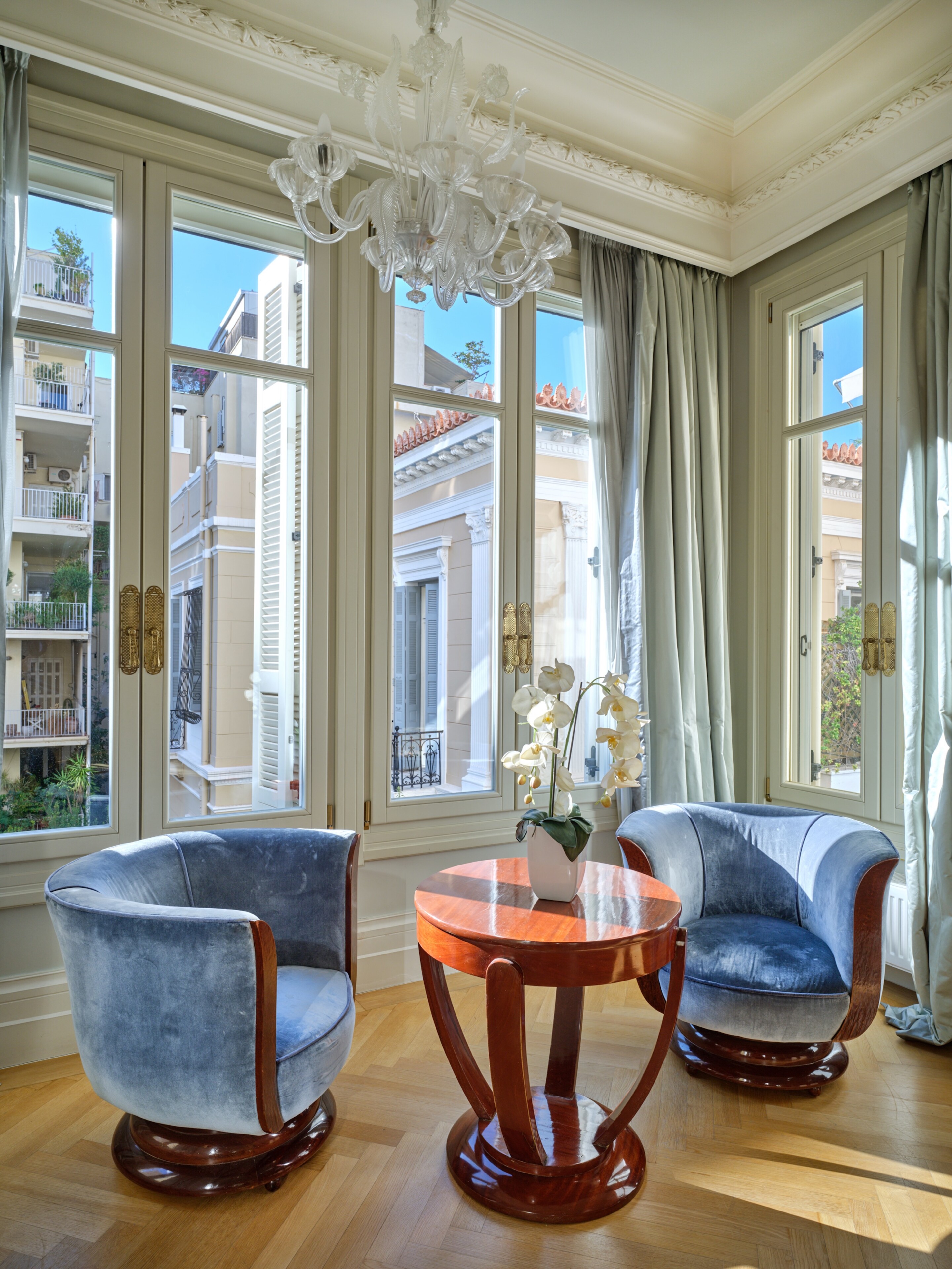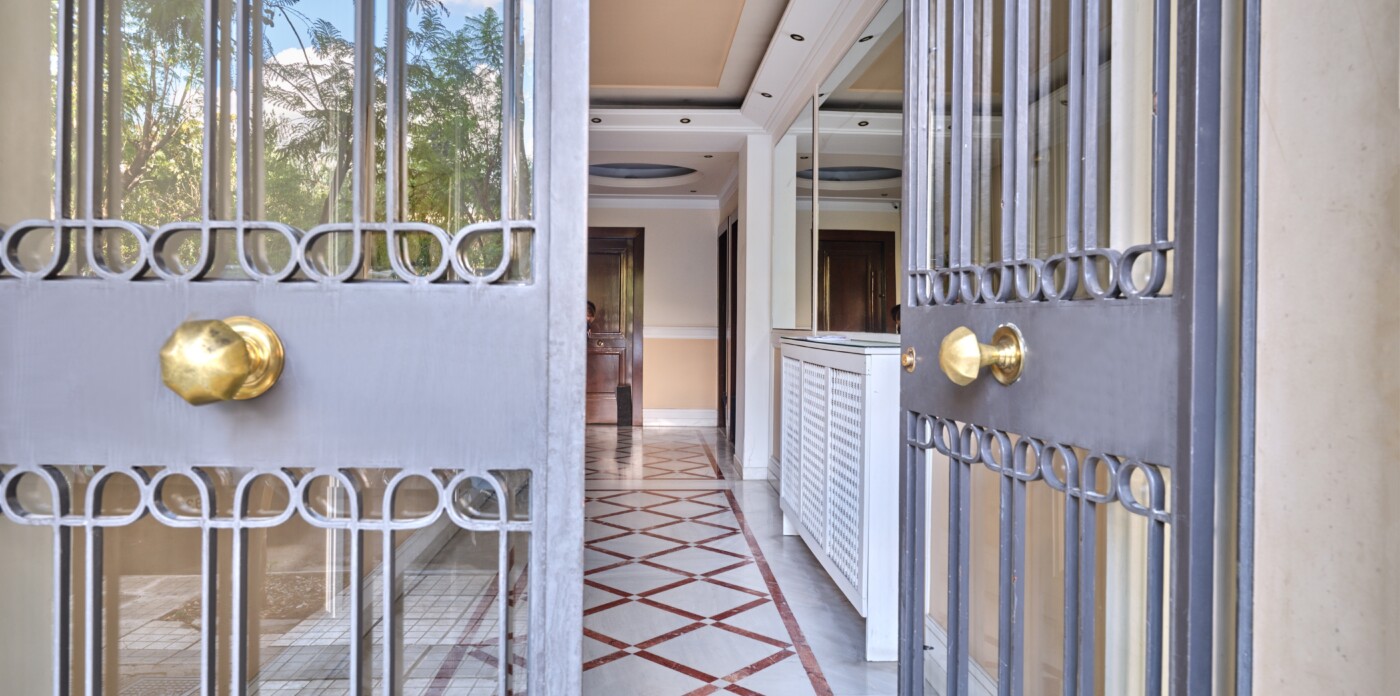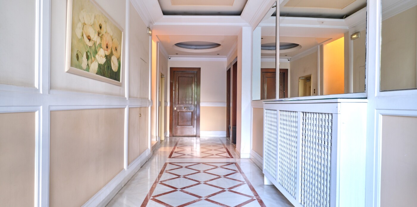 In a building that boasts pre-war architecture, the private residence is in perfect condition, featuring a mixture of luxurious modern furniture coupled with antique pieces. It offers beautiful views of Athens while it faces the Archaeological Site of the Lyceum of Aristotle ( founded in 335 BC to function as a school of philosophy) and the Athens Conservatoire. Highlight : a lovely balcony facing a stunning interior courtyard. Its vintage elevator, state of the art entrance, high ceilings, impressive common areas and frescos in certain rooms are just a few of the features that make it unique.