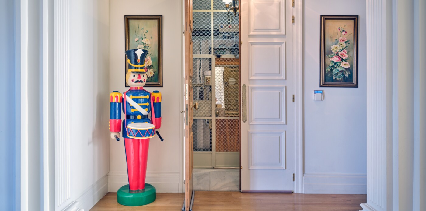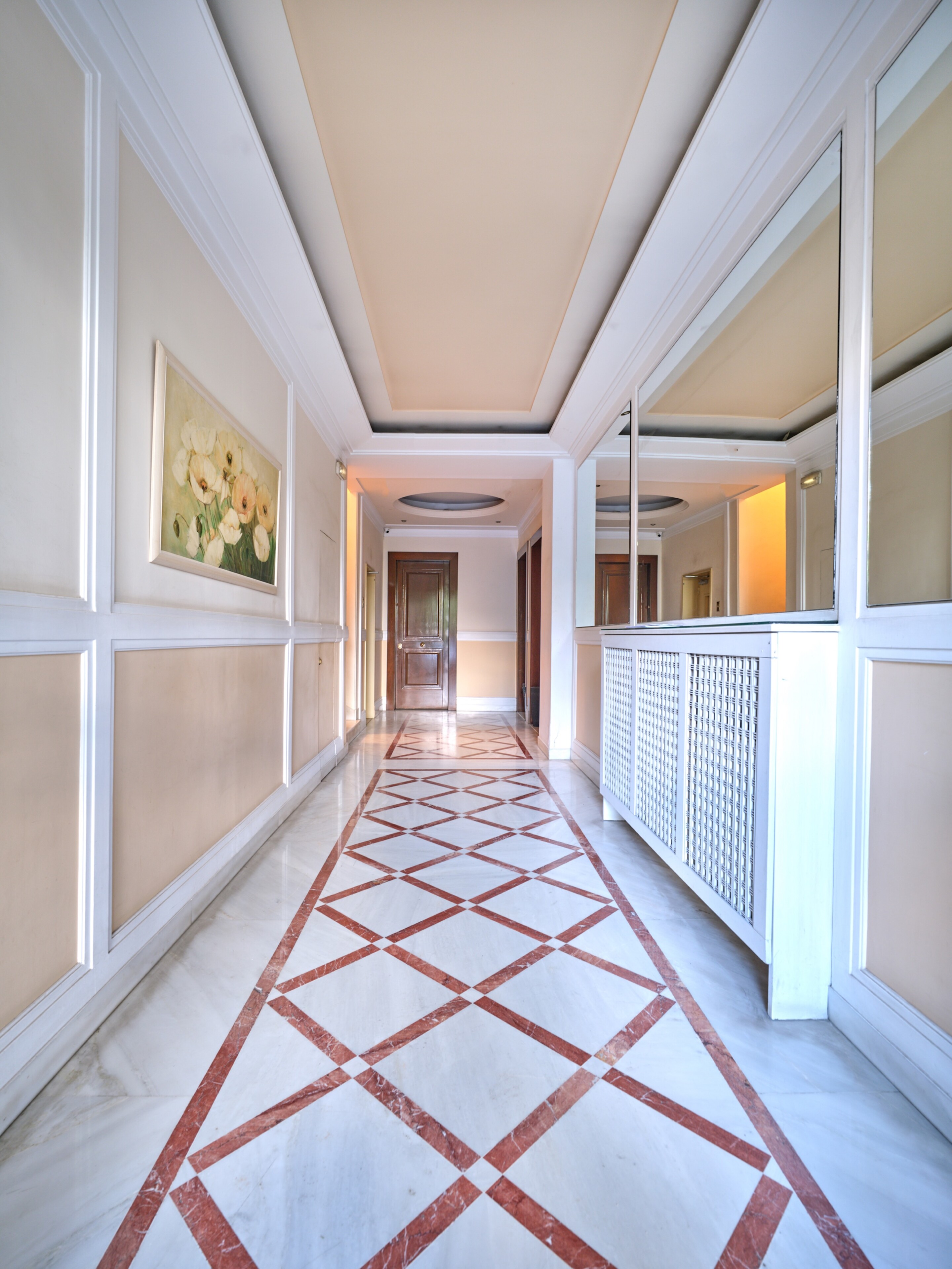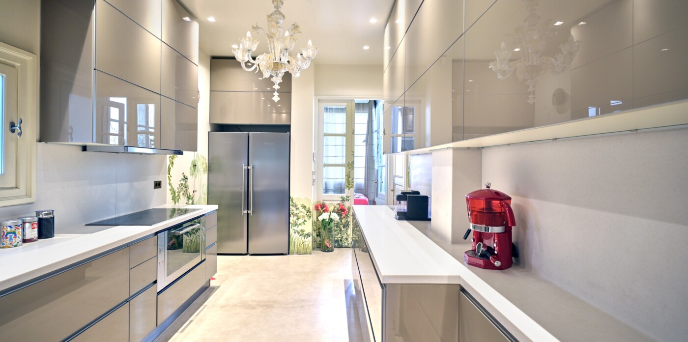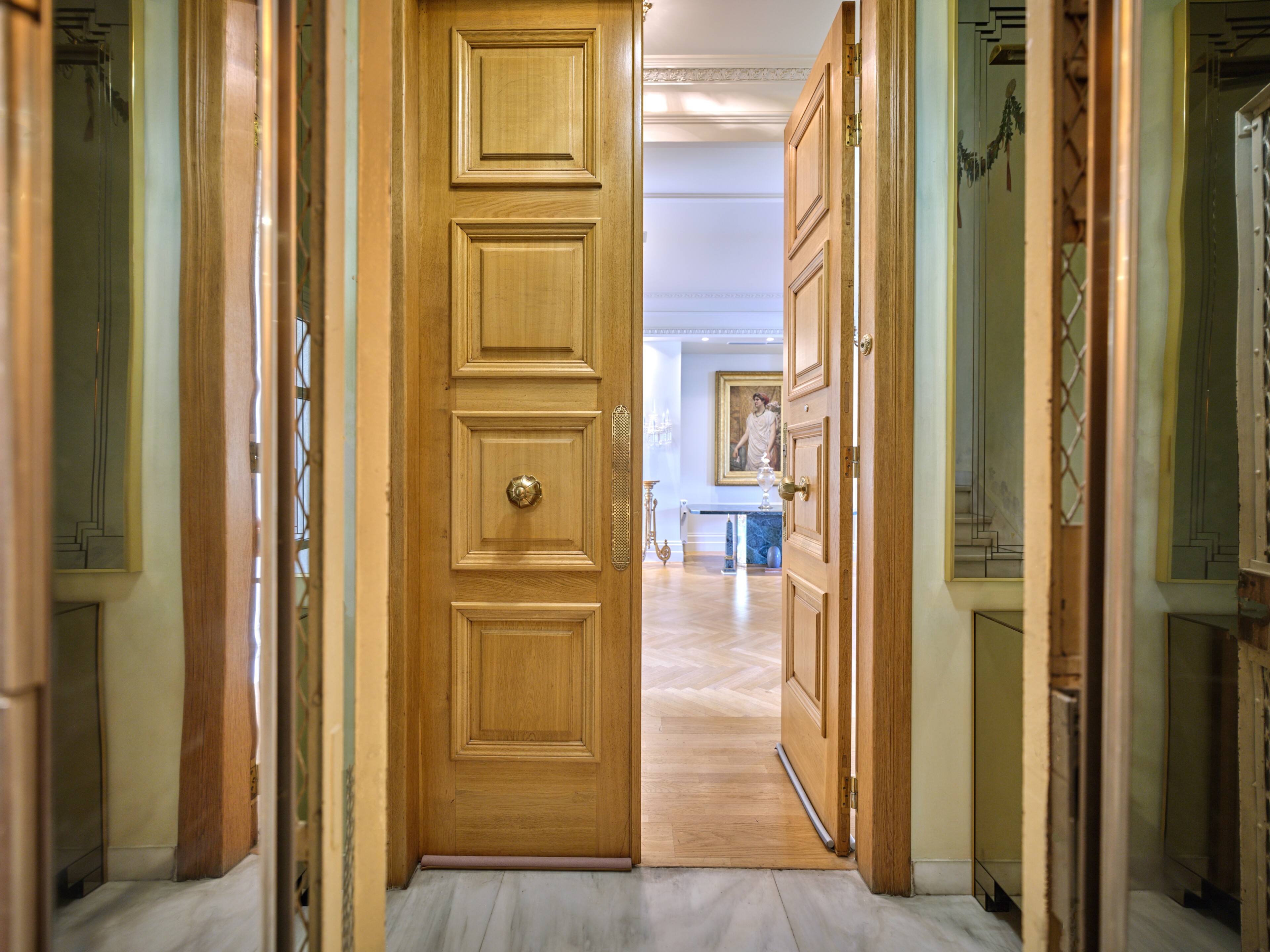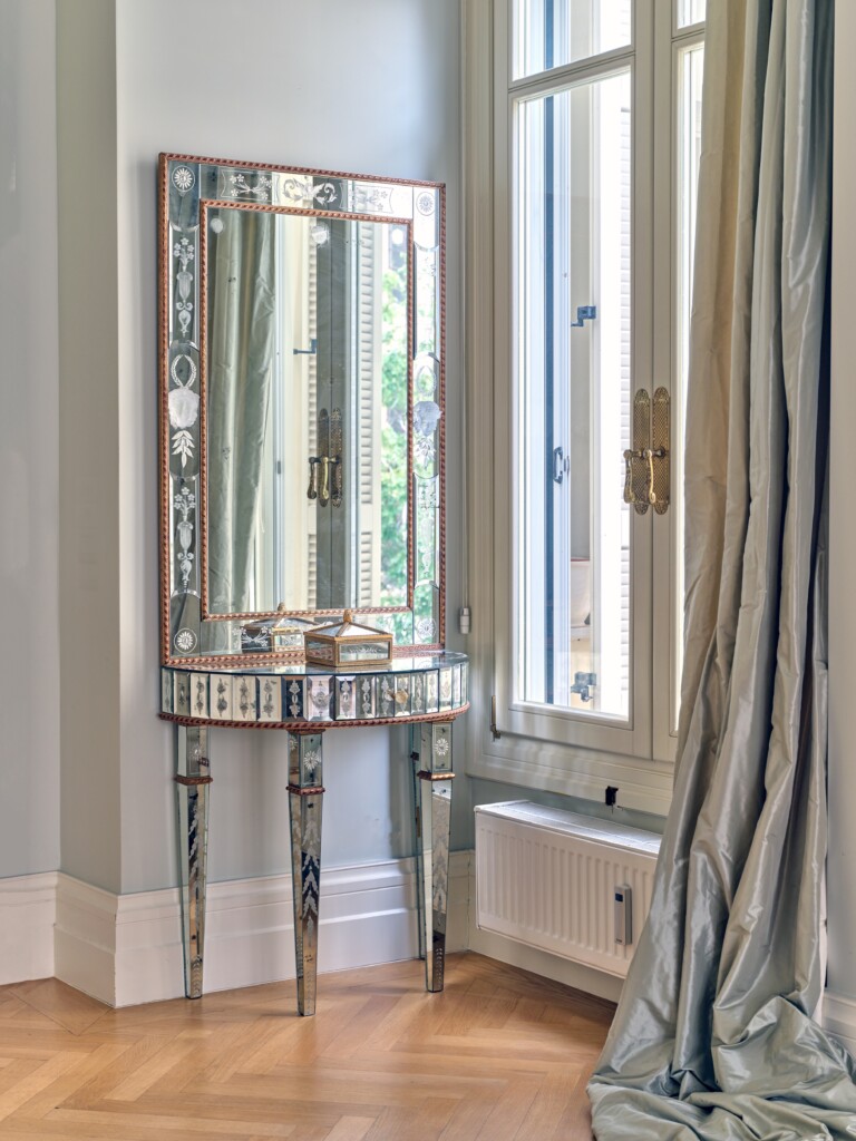In a building that boasts pre-war architecture, the private residence is in perfect condition, featuring a mixture of luxurious modern furniture coupled with antique pieces. It offers beautiful views of Athens while it faces the Archaeological Site of the Lyceum of Aristotle ( founded in 335 BC to function as a school of philosophy) and the Athens Conservatoire. Highlight : a lovely balcony facing a stunning interior courtyard. Its vintage elevator, state of the art entrance, high ceilings, impressive common areas and frescos in certain rooms are just a few of the features that make it unique.
