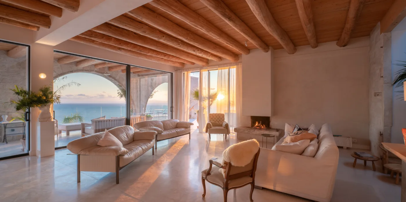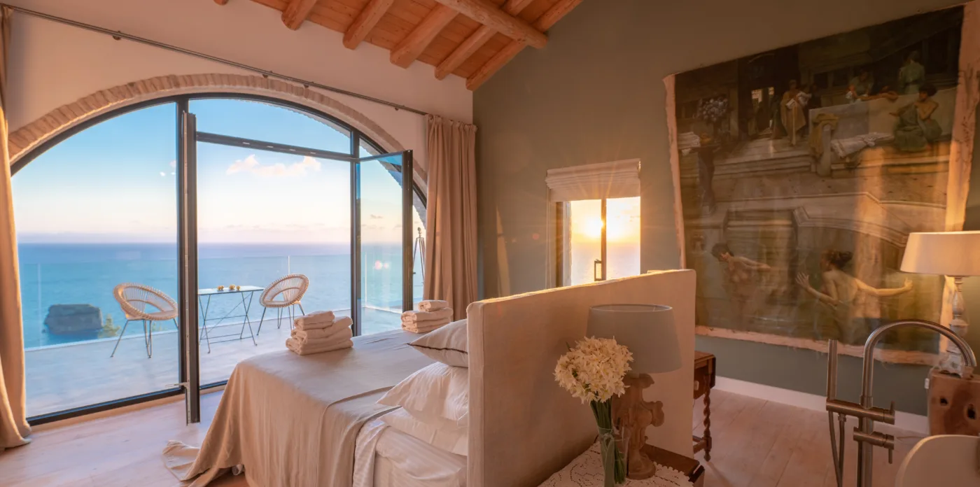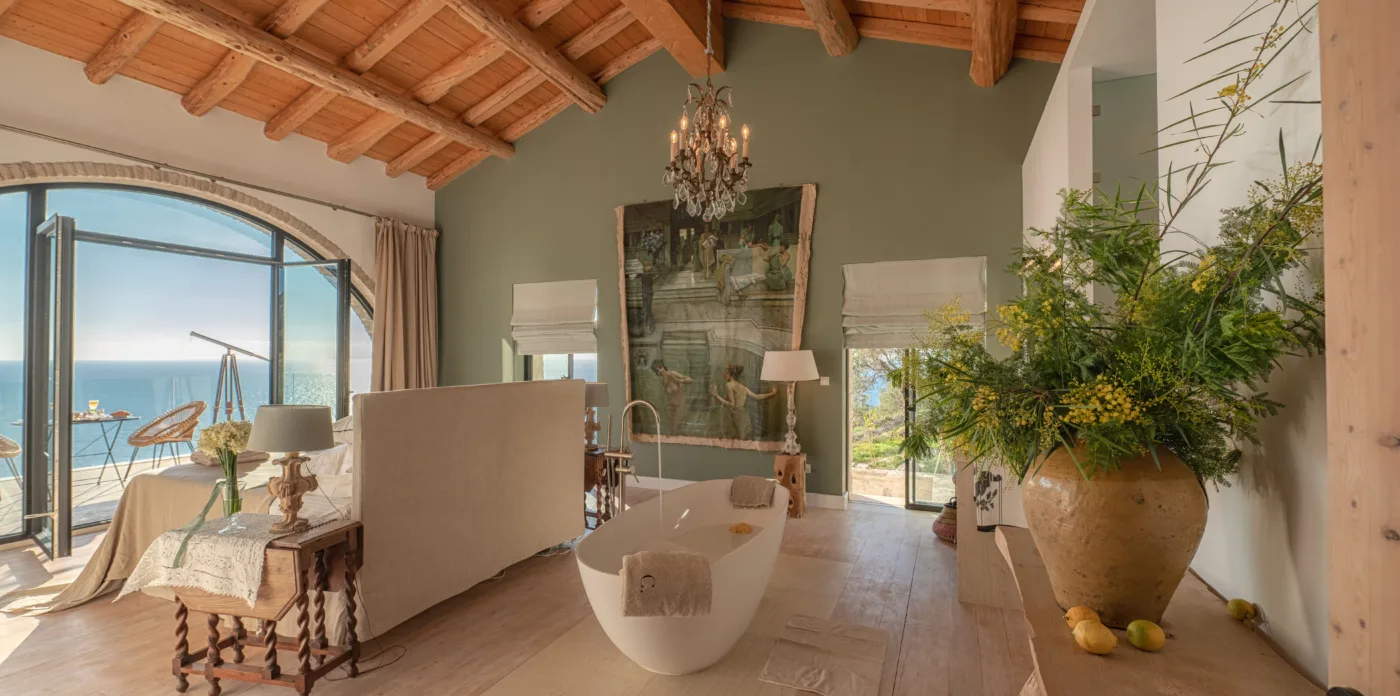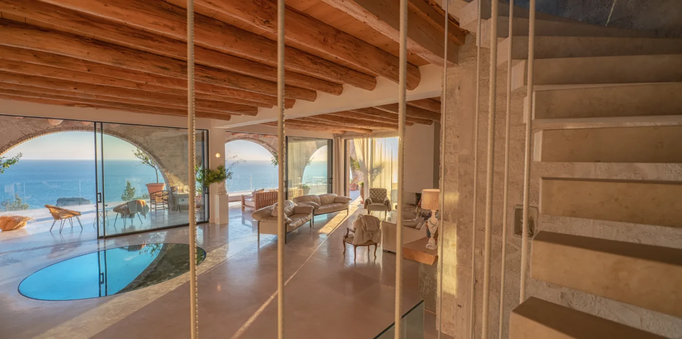 An impressive circular stone staircase leads you to the upper floor. Round walls guide you through the entryway to four en-suite bedrooms featuring cypress wooden floors and wood beamed ceilings, giving a wonderfully perfumed fragrance. Two bedrooms have a free bathtub and a thrilling sea view. The bedrooms have a big glass arched windows that open up with access to a balcony with an incredible view to the sea and a 180-degree horizon. Two additional bedrooms are located on the lower level.