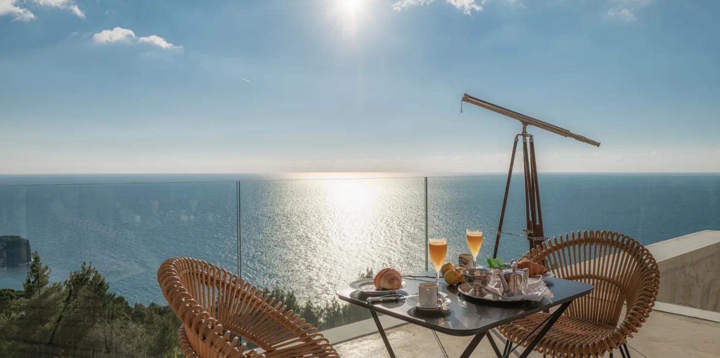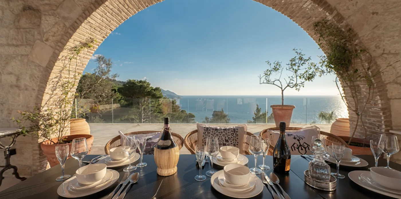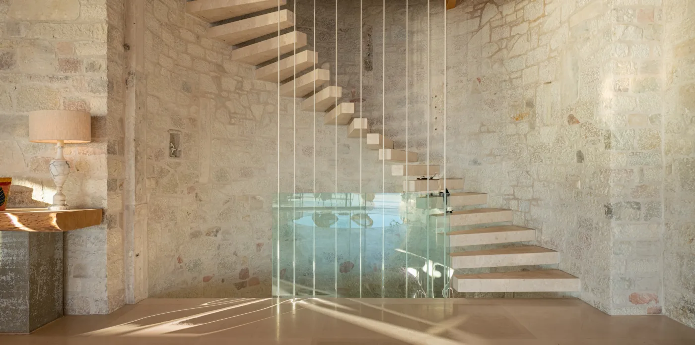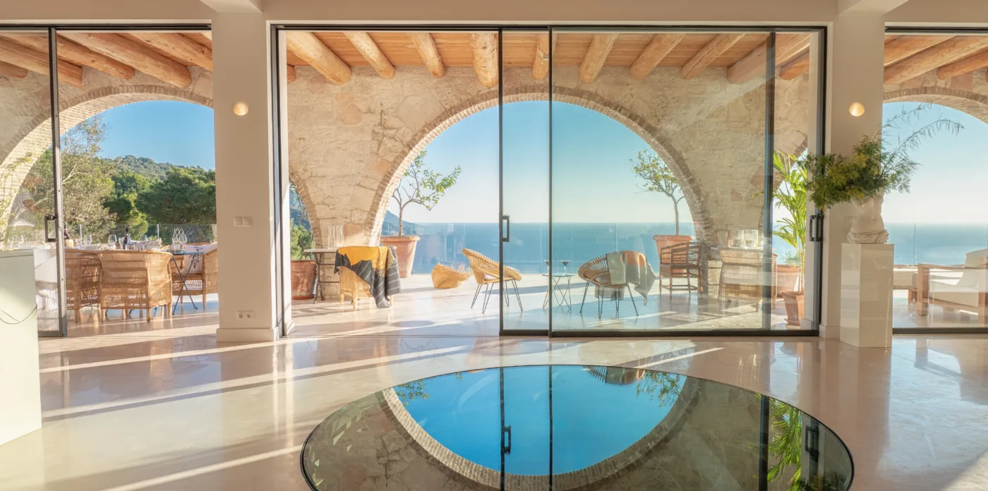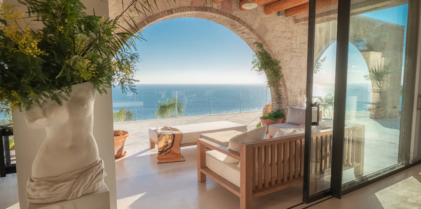An impressive circular stone staircase leads you to the upper floor. Round walls guide you through the entryway to four en-suite bedrooms featuring cypress wooden floors and wood beamed ceilings, giving a wonderfully perfumed fragrance. Two bedrooms have a free bathtub and a thrilling sea view. The bedrooms have a big glass arched windows that open up with access to a balcony with an incredible view to the sea and a 180-degree horizon. Two additional bedrooms are located on the lower level.