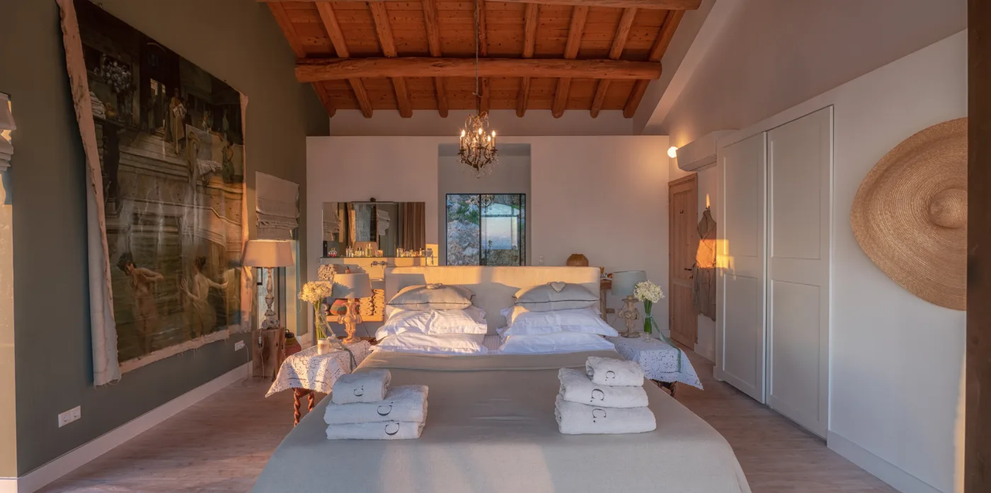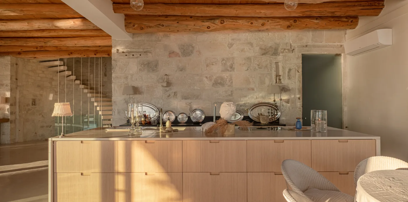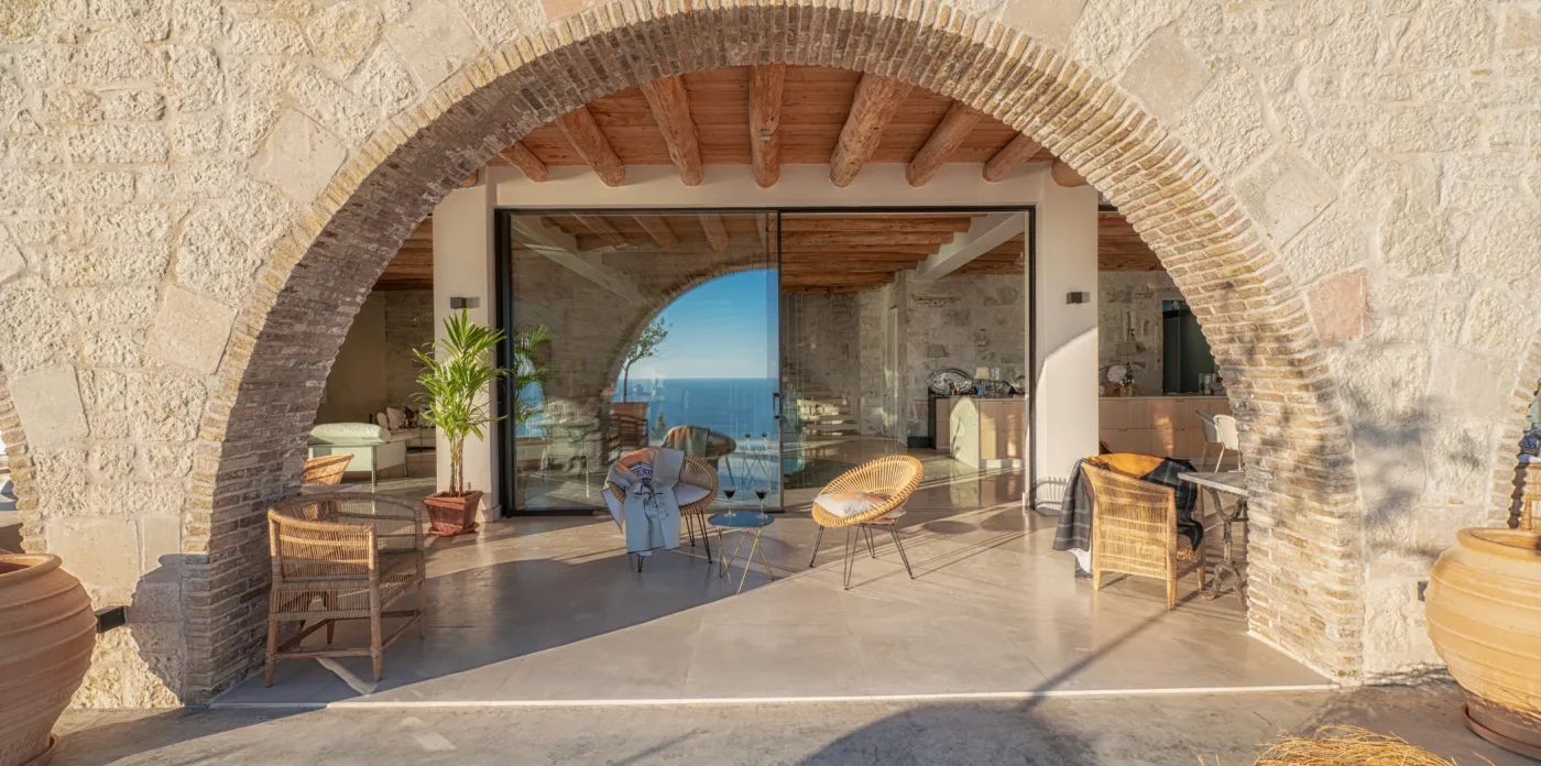 The internal walls are made of ancient stones with beautiful brick features. The ground floor hosts an open kitchen with original floor tiles made from Greek Tsini marble and cypress beam ceilings which give a continued fragrance mixed with a cool sea breeze. The floor has access to the covered veranda, featuring 5 big stone arches that run along the villa’s side. The stone floors, wooden beamed cypress ceilings and an exterior fireplace, along with the outdoor kitchen, pizza oven and grill create the perfect outdoor environment for al fresco dining with sunset views.
