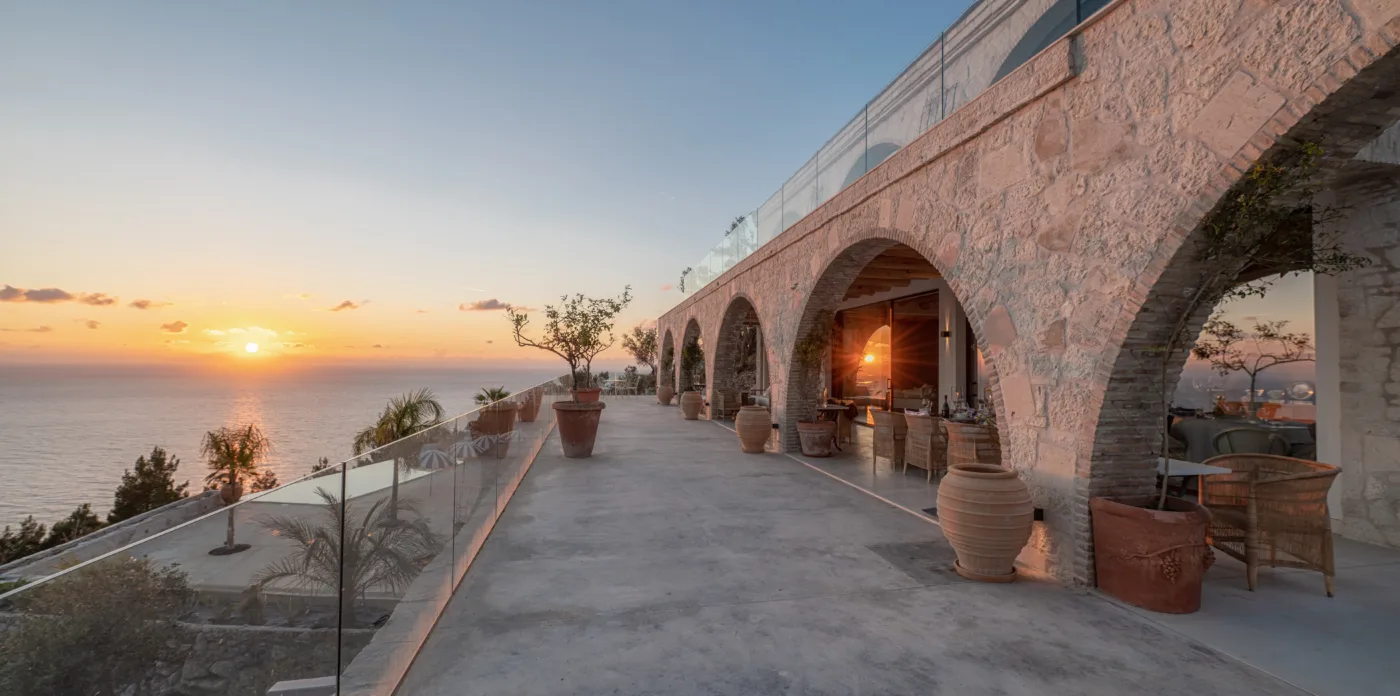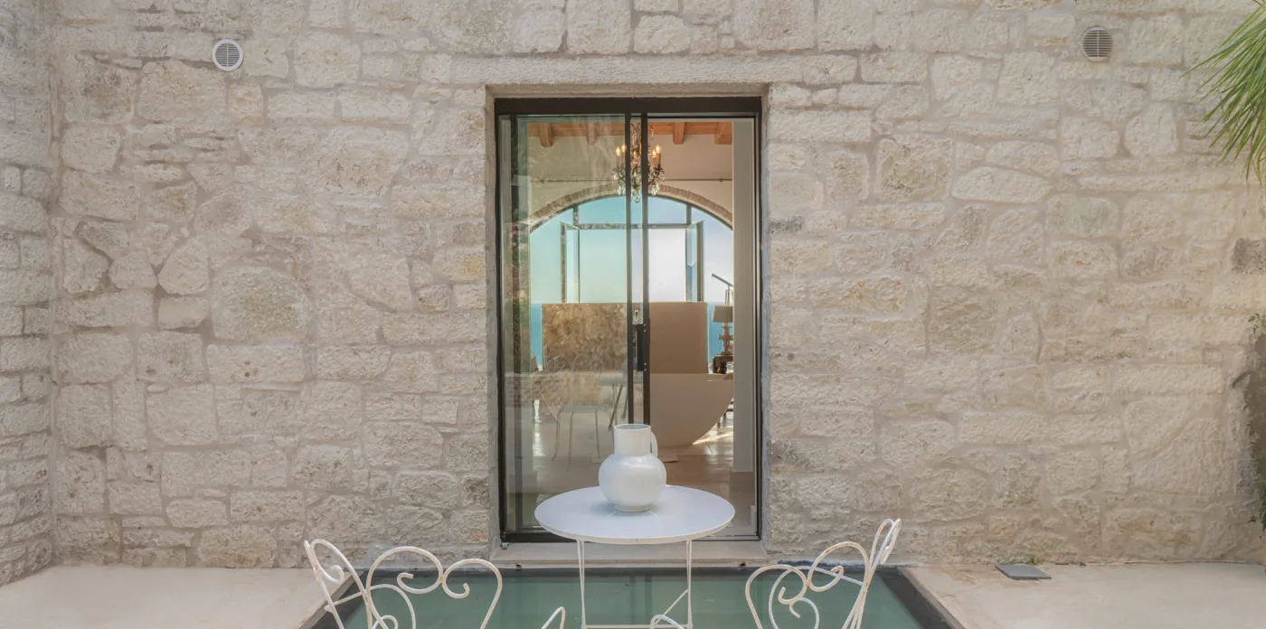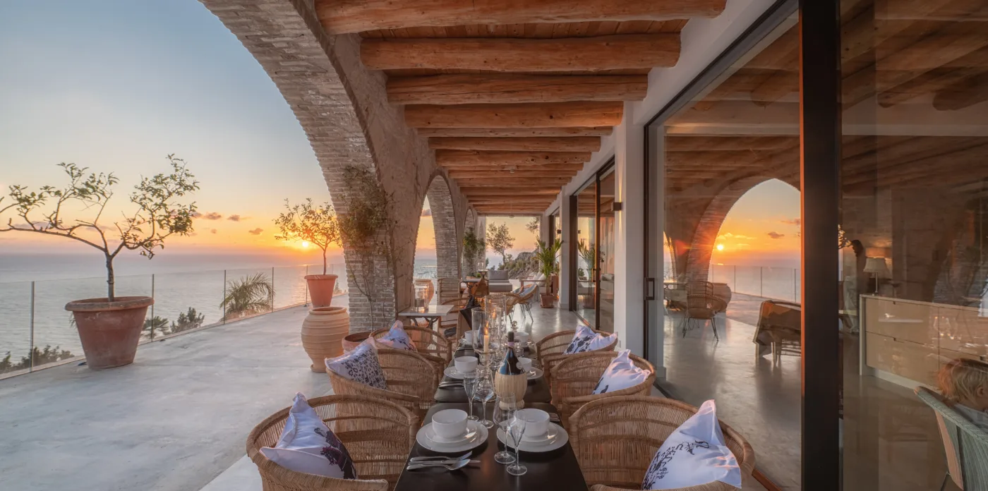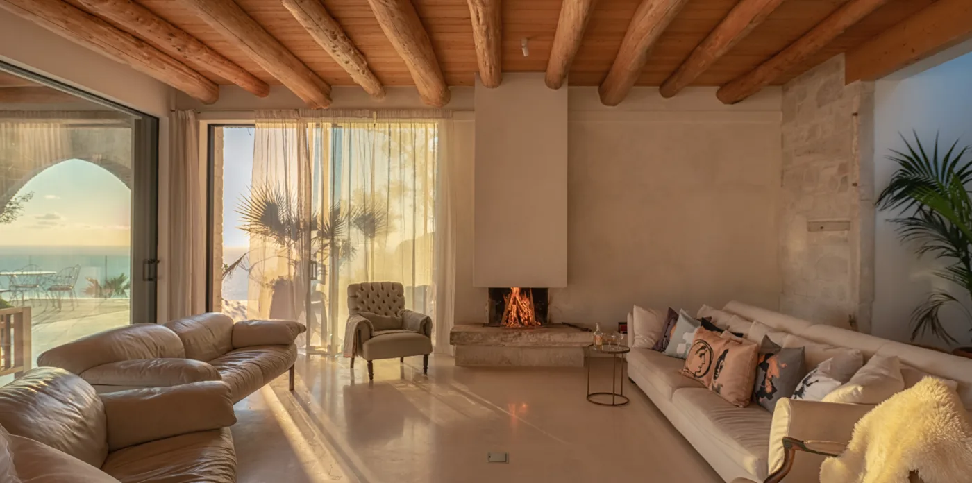 The internal walls are made of ancient stones with beautiful brick features. The ground floor hosts an open kitchen with original floor tiles made from Greek Tsini marble and cypress beam ceilings which give a continued fragrance mixed with a cool sea breeze. The floor has access to the covered veranda, featuring 5 big stone arches that run along the villa’s side. The stone floors, wooden beamed cypress ceilings and an exterior fireplace, along with the outdoor kitchen, pizza oven and grill create the perfect outdoor environment for al fresco dining with sunset views.