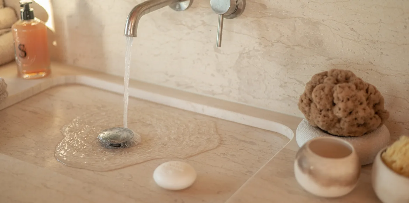 The gardens are well maintained with the swimming pool sitting on a lower level at the right side of the house. There is a covered terrace here, also ideal for dining, relaxing or protection from the sun on hot days. A highlight, is the Moroccan style garden with its wall lounge sofas which offers shade on summer days. Here, you’re surrounded by lots of different plants like citrus trees, palms, tropical flowers, herbs, along with hammocks, where you can rest during the afternoons, with fresh wild herbal teas served all day.The pink stone colours were selected to provide that true Morrocan atmosphere.