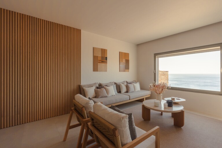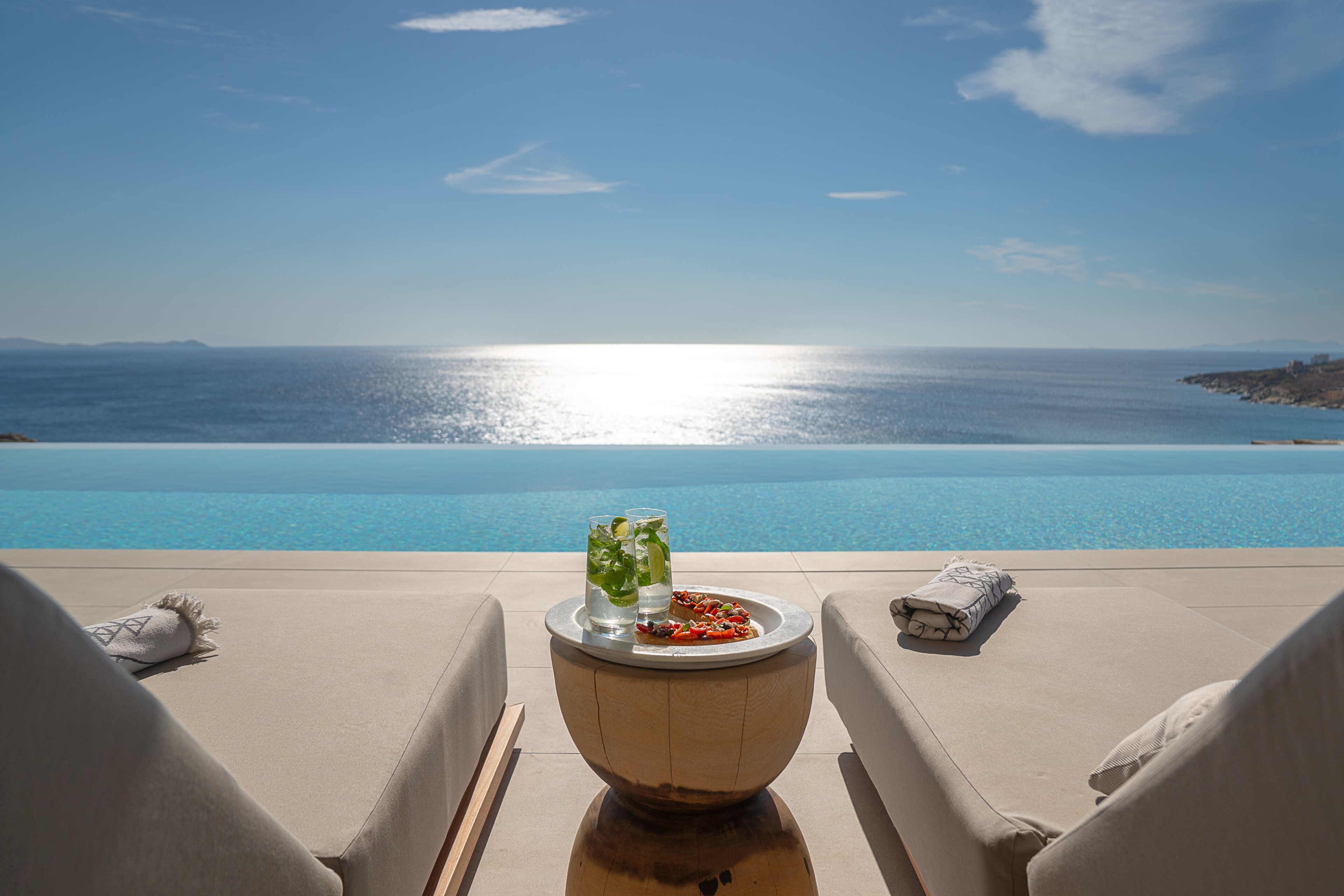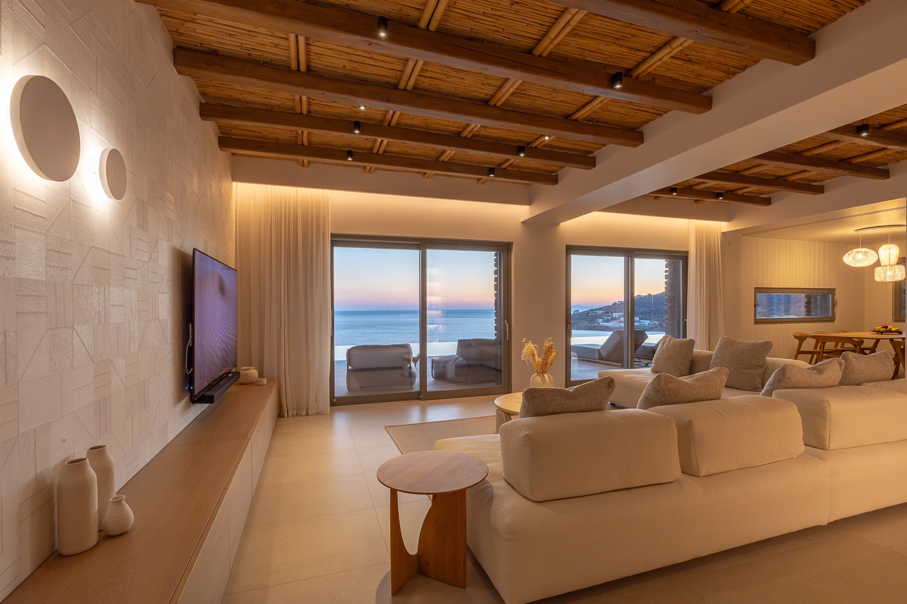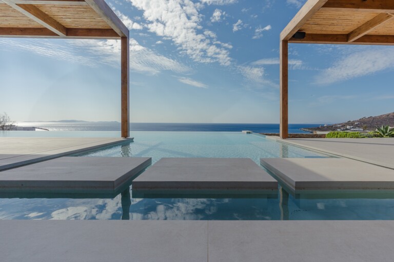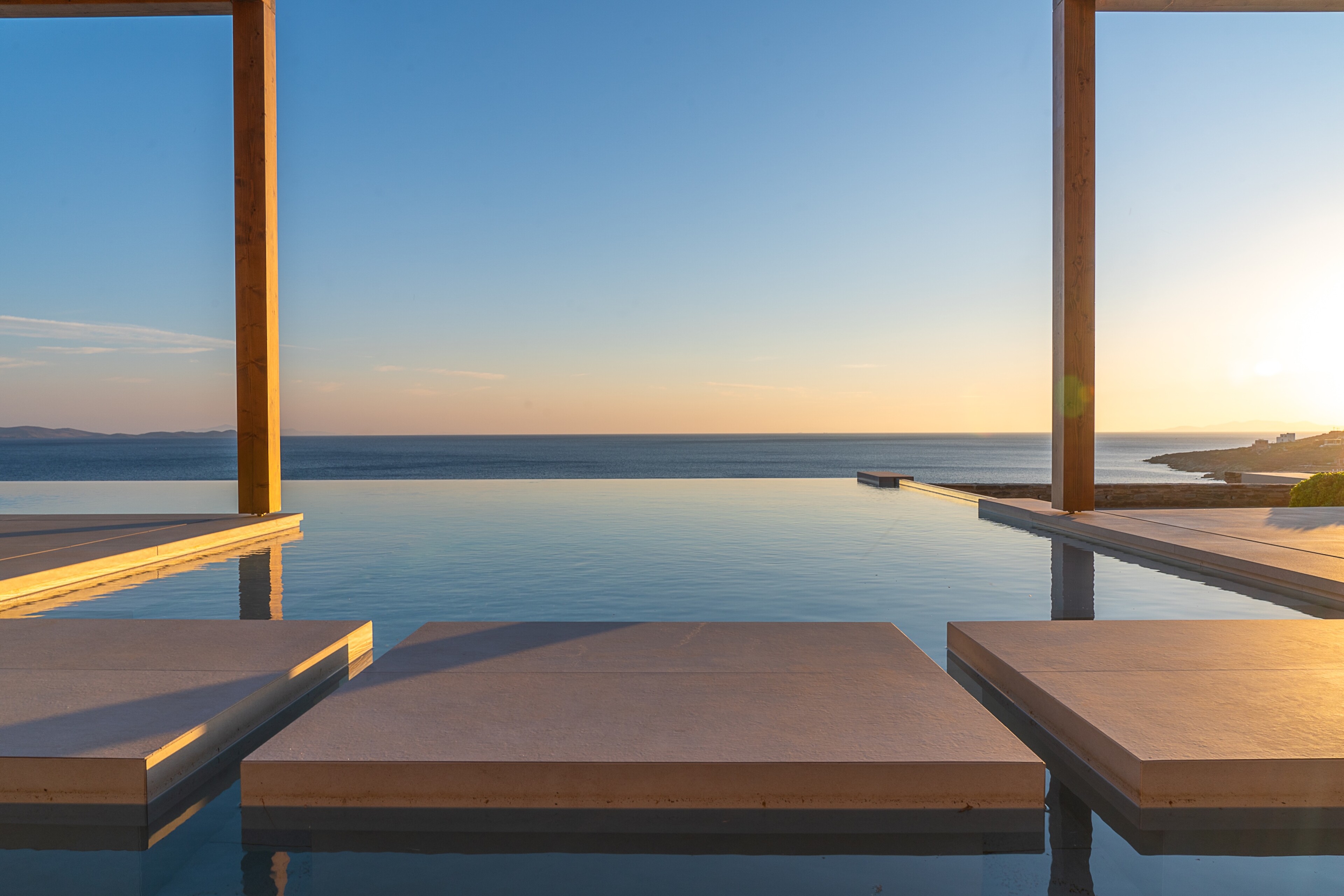 At its centre, an infinity pool reflects the surrounding sea and sky, creating a calm focal point for outdoor life. Loungers beneath a timber pergola offer shade and stillness through the afternoon, while expansive glass doors open the interiors to light, air, and the soft scent of the island.