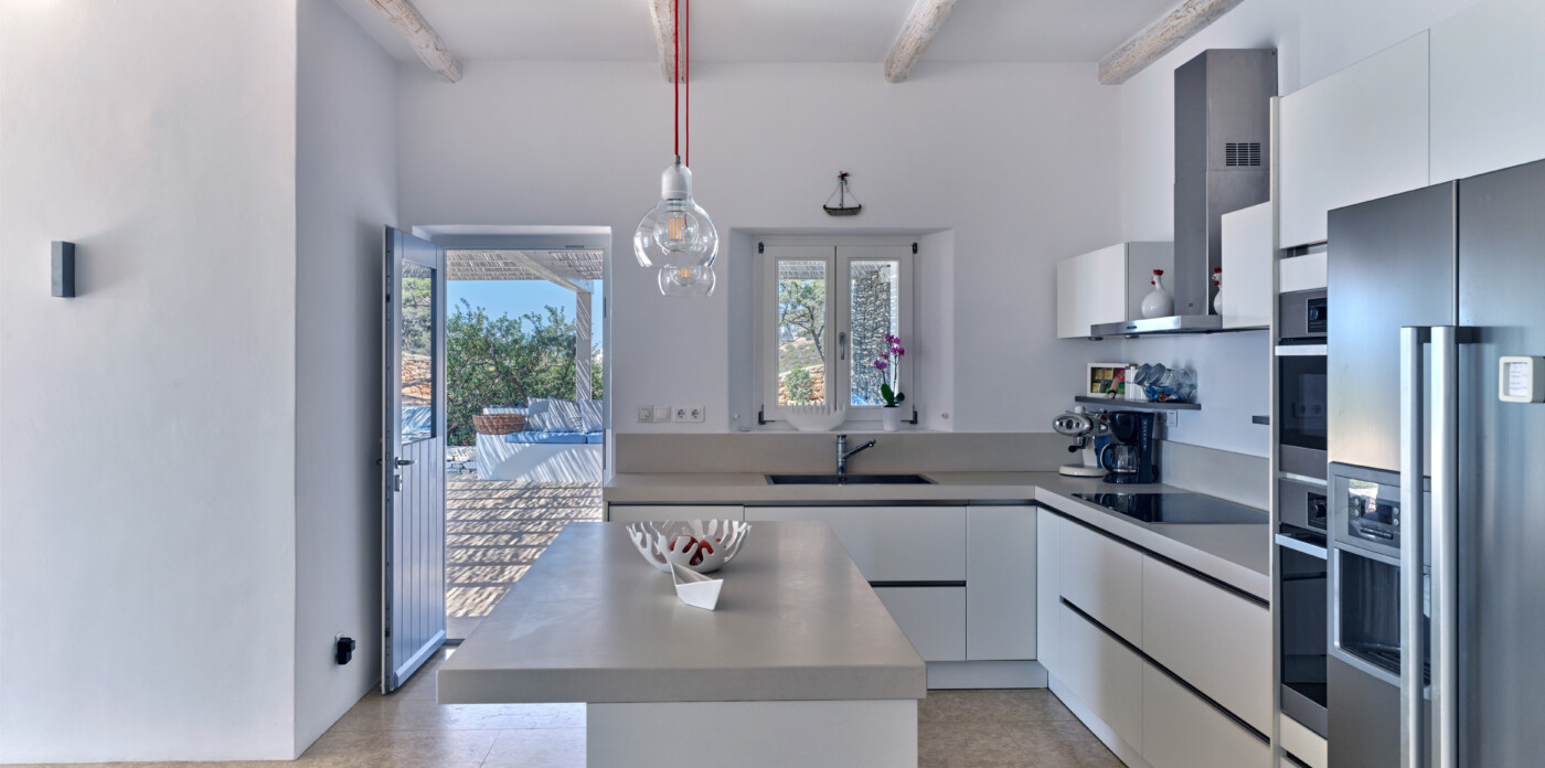 Four en-suite bedrooms, each providing stunning sea views or direct terrace access, ensure privacy and relaxation for guests. There are two additional guesthouses in the lower level making it ideal for a synthesis of up to 12 people. The spacious living room, complete with a fireplace, TV, and sound system, seamlessly connects to a fully equipped kitchen, creating an inviting space for gatherings.