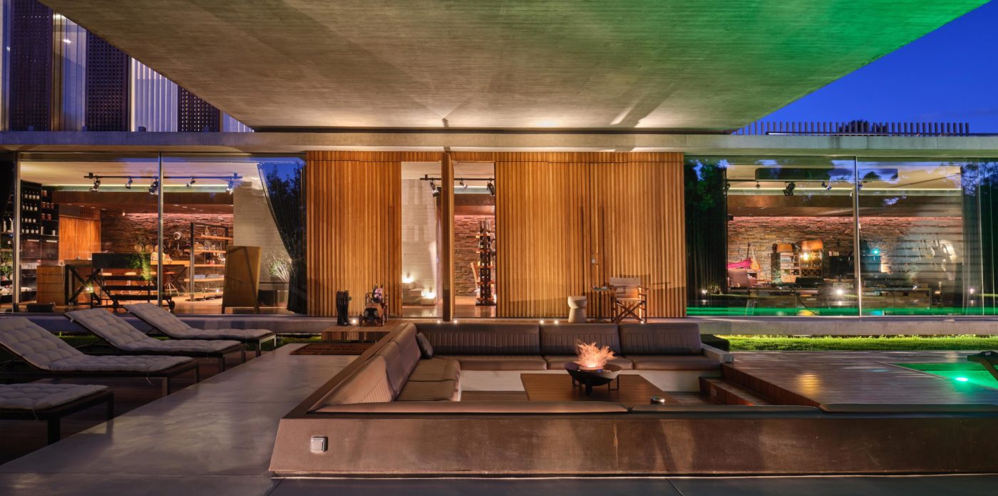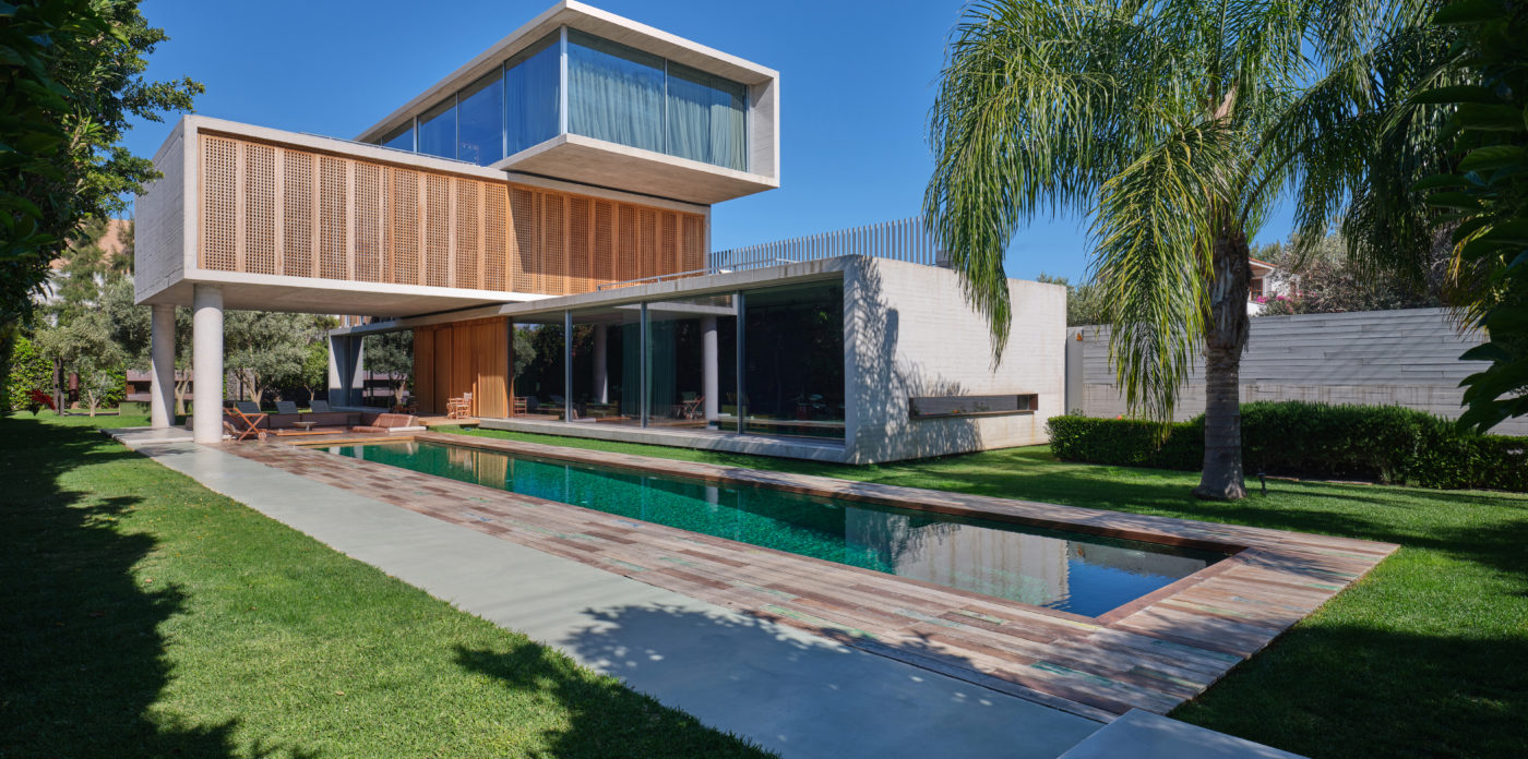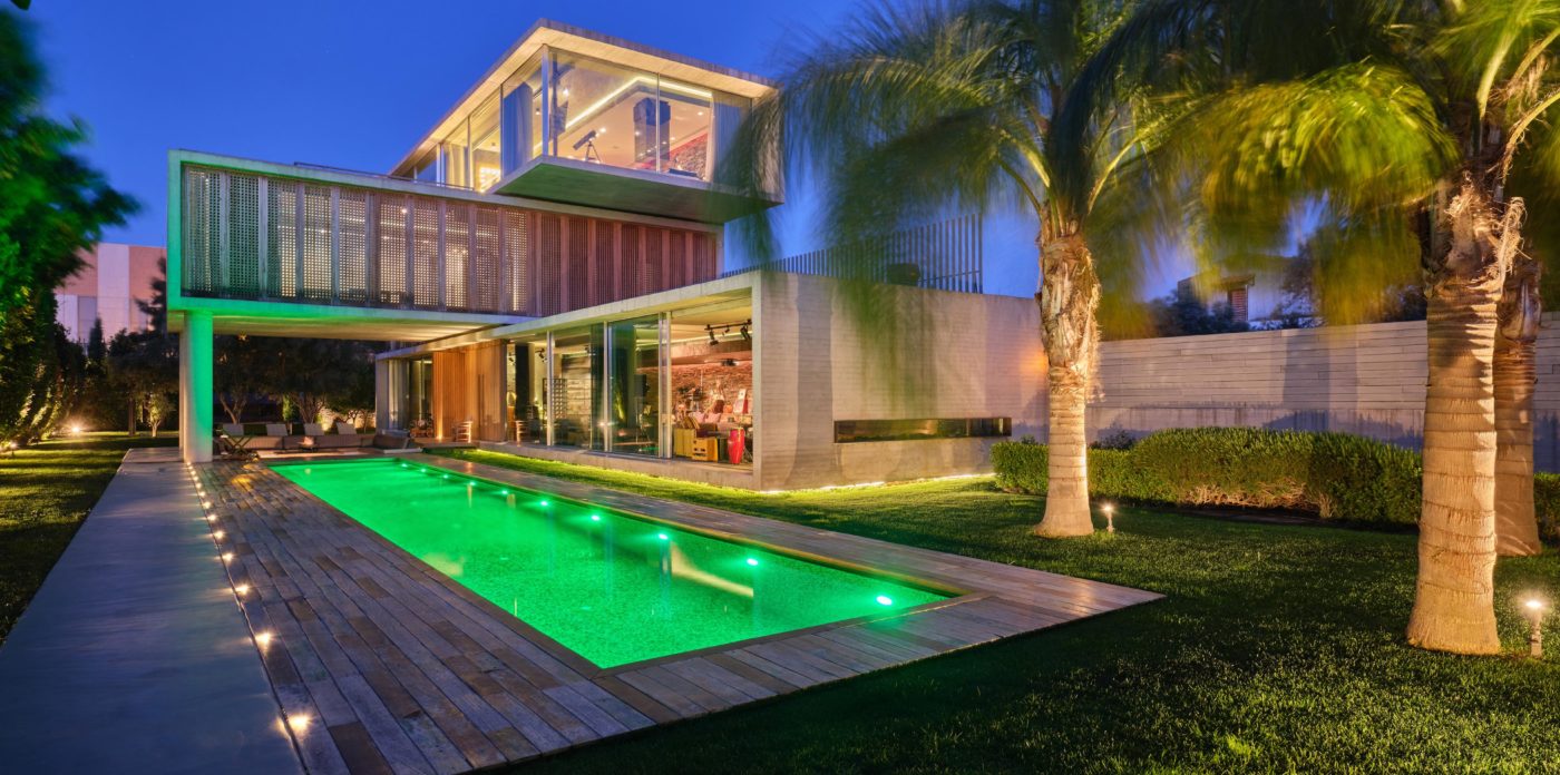 The 1180 sq.m open-plan residence boasts a geometric versatile architecture and is spread over four levels. Its spacious outdoors feature an enormous rectangular pool which perfectly complements the surrounding greenery, dining area, outdoor gym and BBQ.