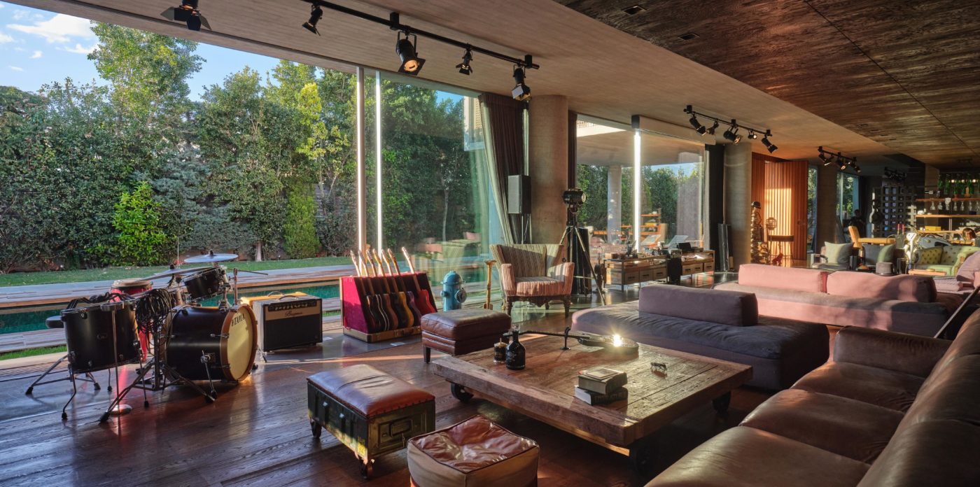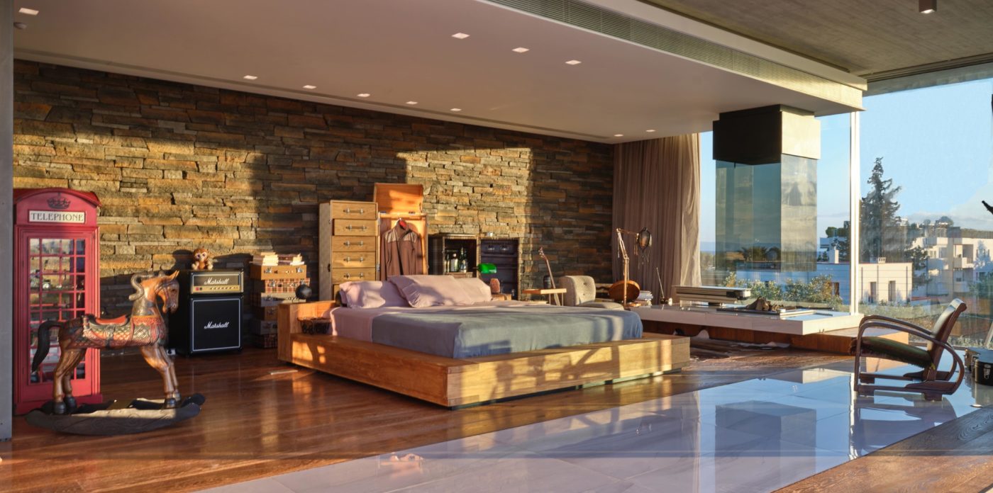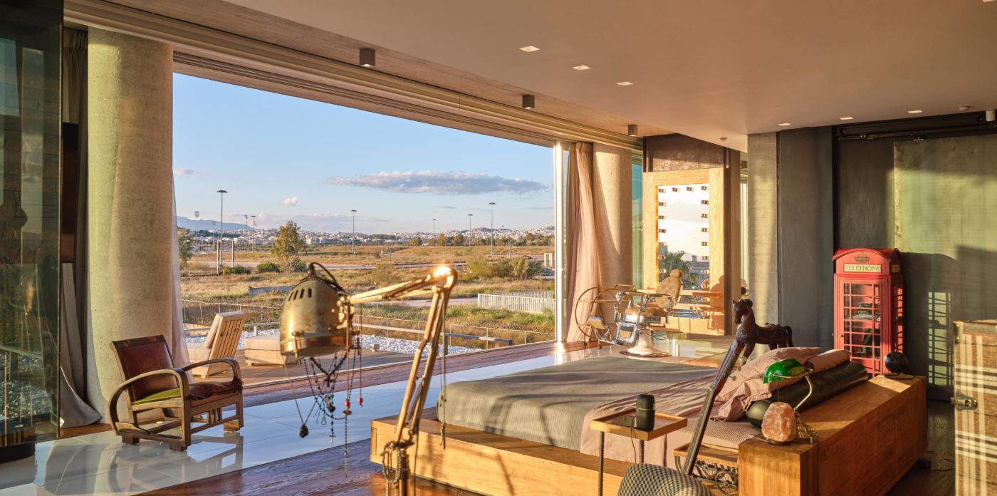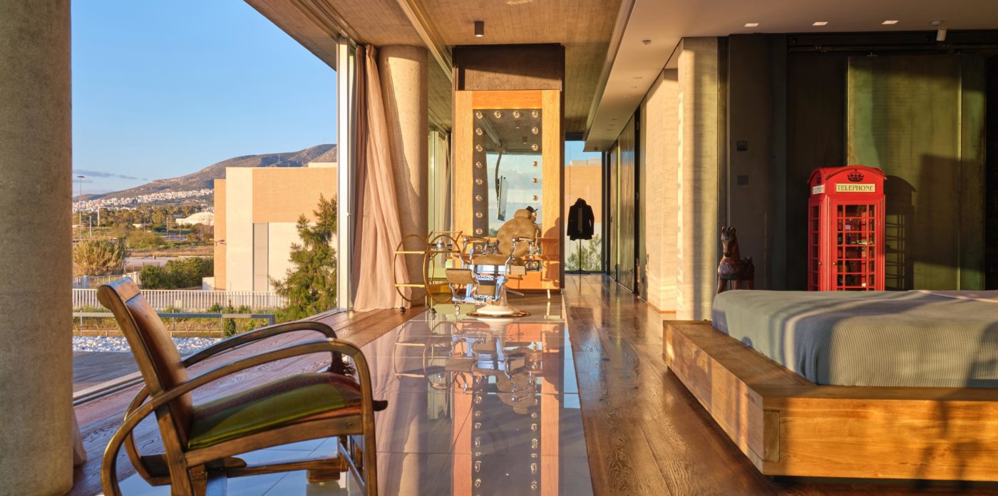 The villa is decorated with an eclectic mix of furniture with influences from the 70’s and mid century furnishings, while there are several spots that highlight the owner’s passion of art and music. The interiors feature a palette of grey and brown tones, tan leather upholstery and wooden details, furnishings that create a warm and relaxing atmosphere. Objects such as the antique 19th century black piano, a genuine WW2 BMW motorcycle, or the spectacular colourful guitars’ collection, will enchant you!