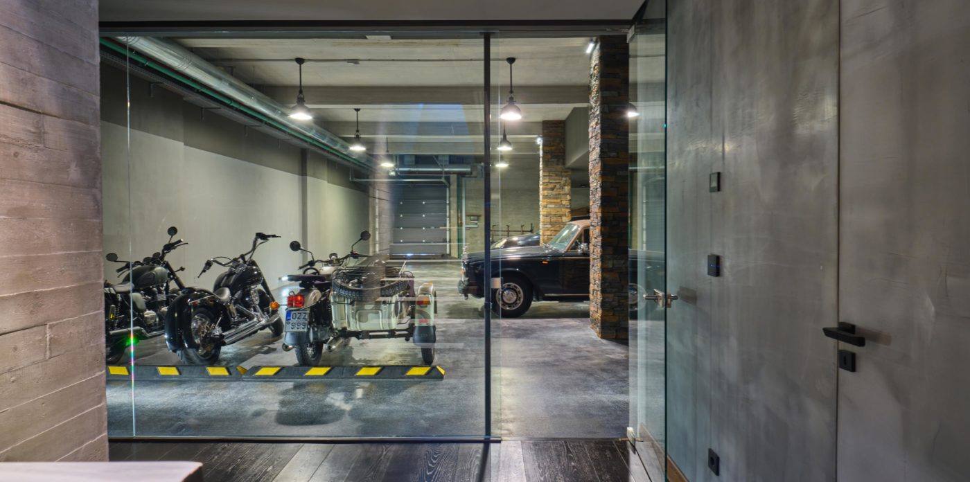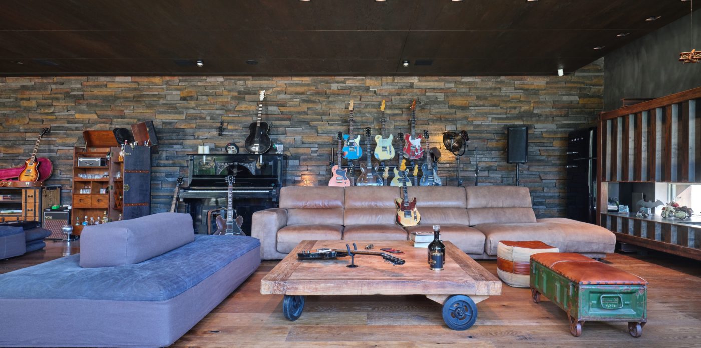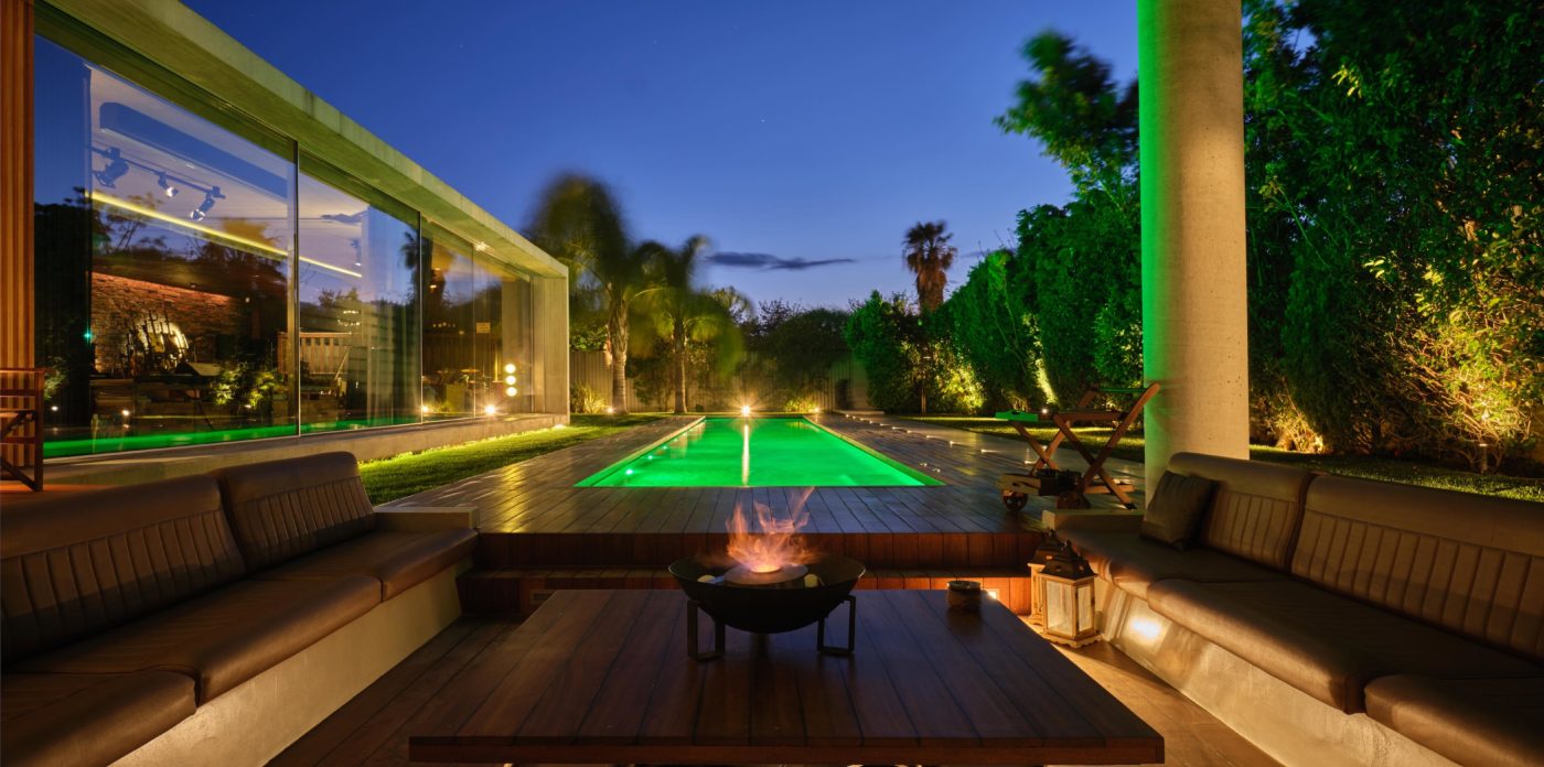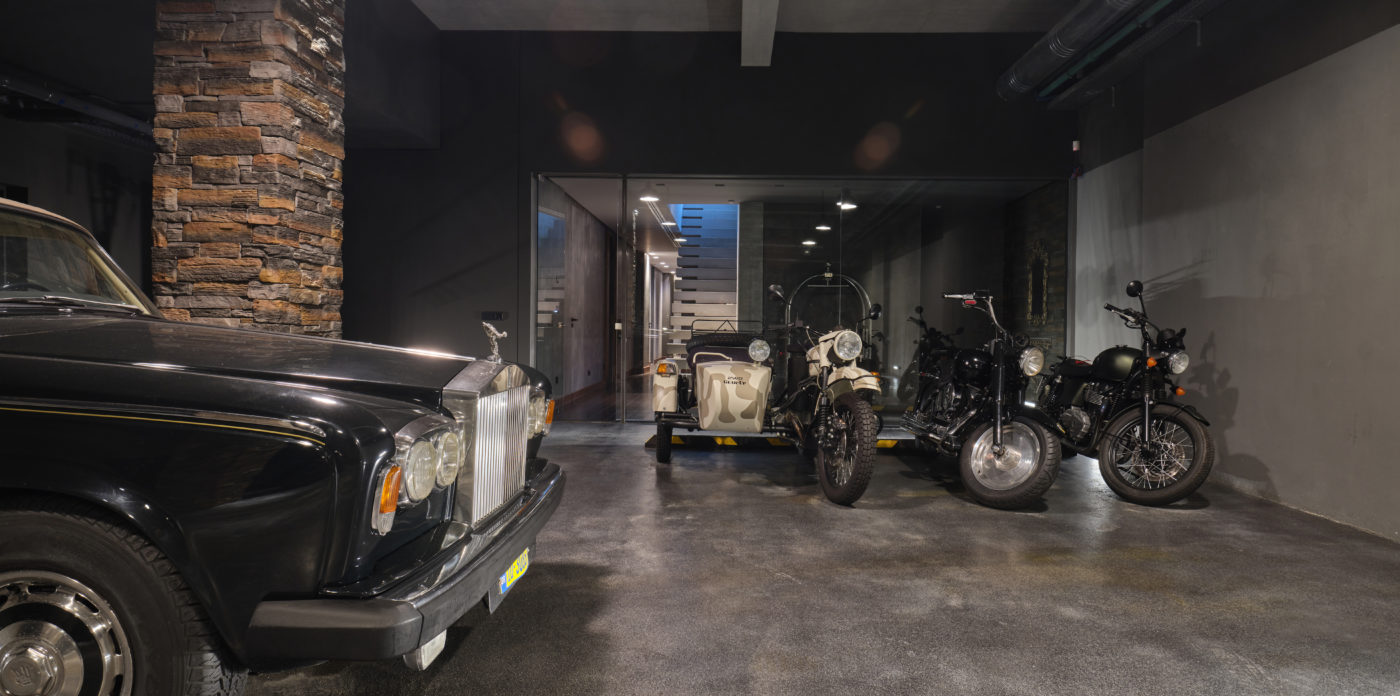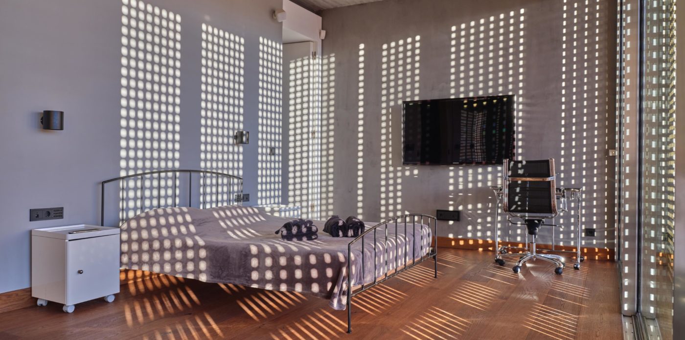 The villa is decorated with an eclectic mix of furniture with influences from the 70’s and mid century furnishings, while there are several spots that highlight the owner’s passion of art and music. The interiors feature a palette of grey and brown tones, tan leather upholstery and wooden details, furnishings that create a warm and relaxing atmosphere. Objects such as the antique 19th century black piano, a genuine WW2 BMW motorcycle, or the spectacular colourful guitars’ collection, will enchant you!