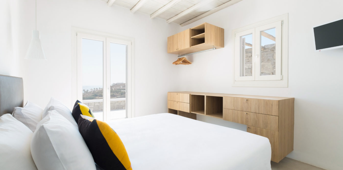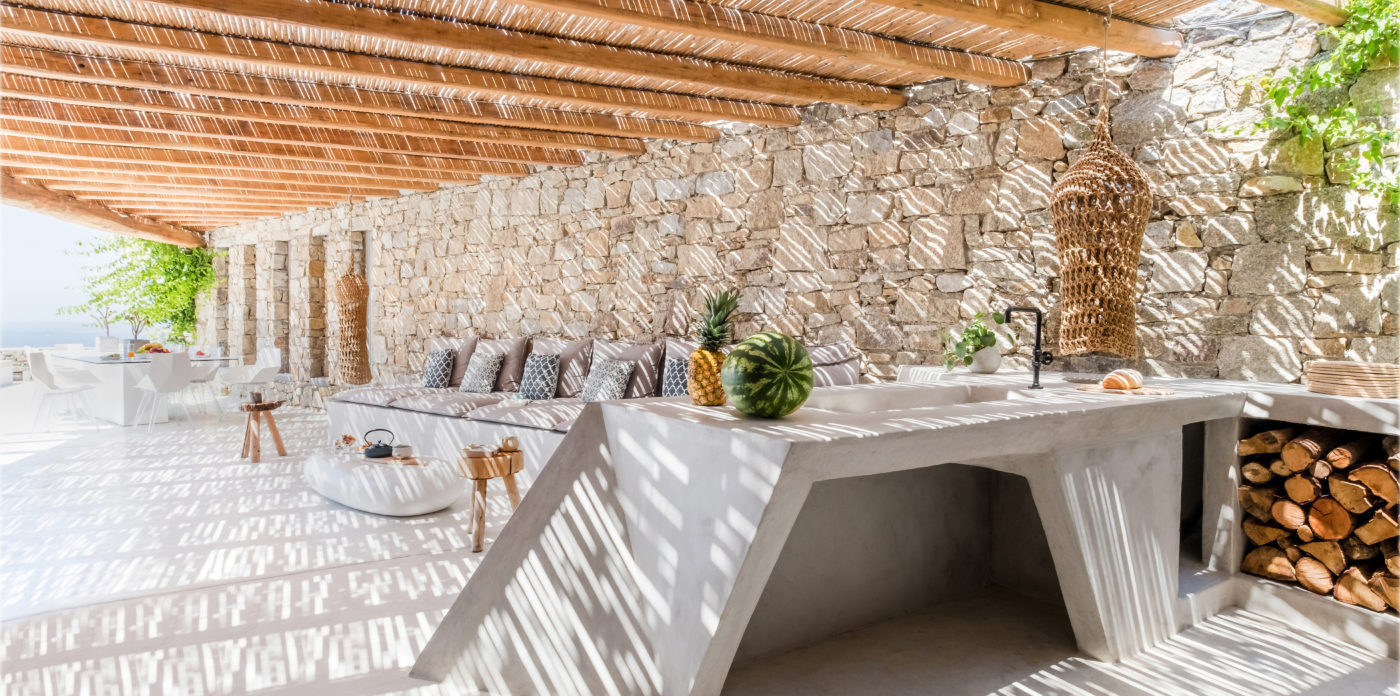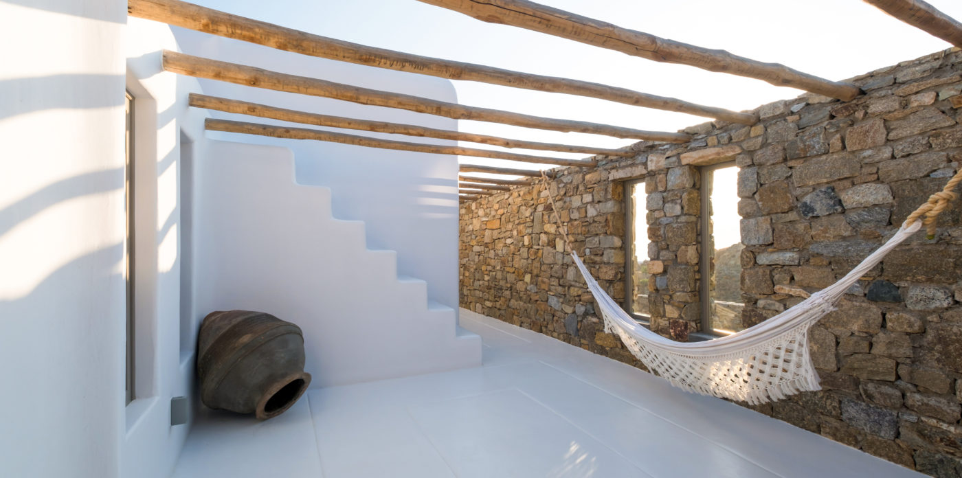 Still, the perfect place to enjoy the Mykonian summer lifestyle would be the area around the pool. The outdoor space includes, a grand corner lounge area with pergola, comfortable sun beds, 12 seat master table, unique-designed BBQ kitchenette and plenty of hammocks to enjoy relaxed moments in the afternoons!