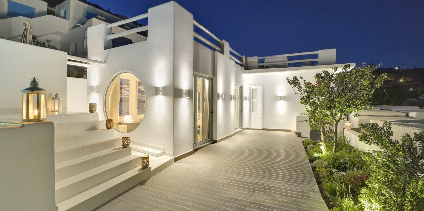 Mer et Soleil is a beachfront gem set on fashionable Psarou Beach, a favourite among the International jet-set for its golden sun-kissed sand and clear emerald green waters.