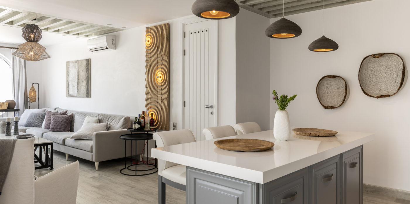 The villa boasts stylish interiors and balconies with panoramic sea views. In harmony with its nature, interiors have been designed using a cool, neutral palette with accents of colour, to create luxurious and enriching spaces, against the backdrop of the sparkling Psarou Beach.