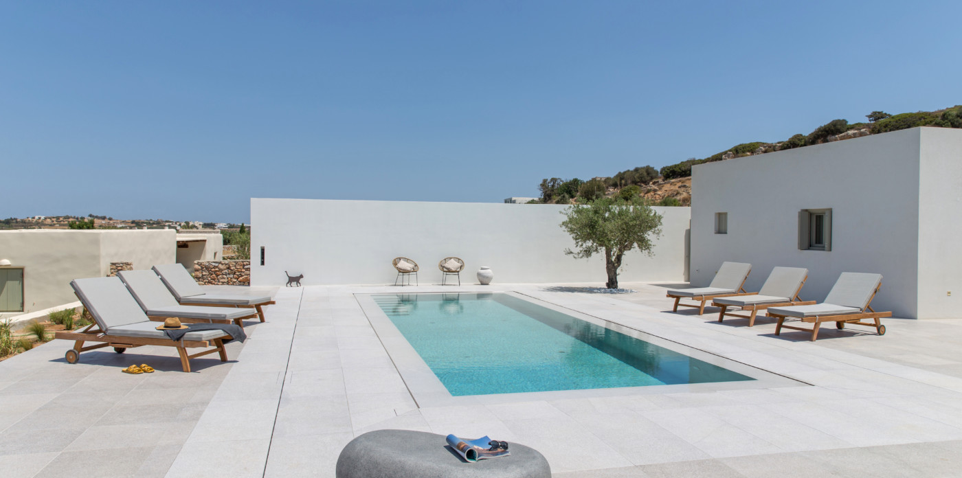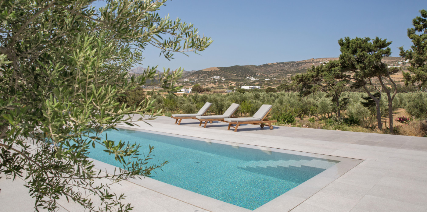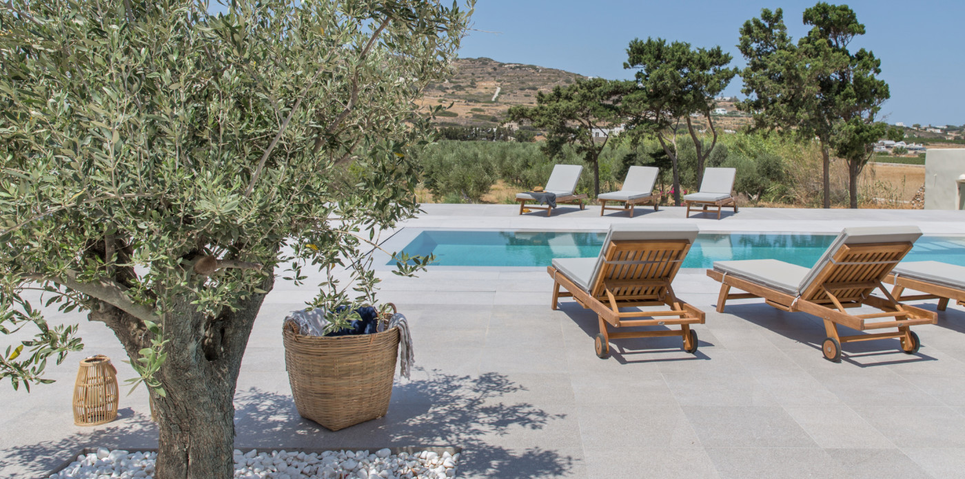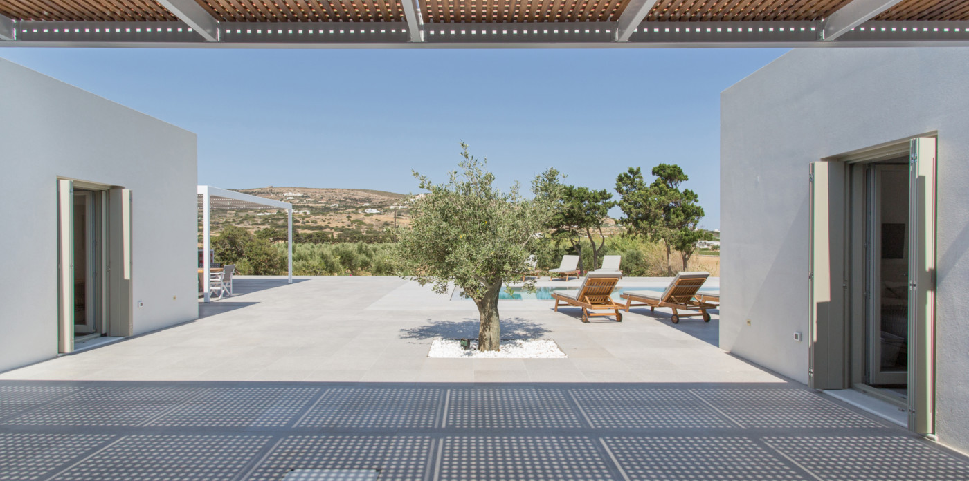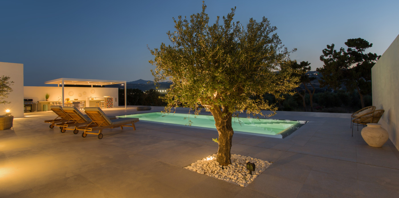 With 5 bedrooms, Olea has a relaxed feel. Indoors, fresh modern furnishings fuse with stylish, comfortable living spaces.Windows to either side bring in plenty of light and offer views of the Parian landscape and the front olive grove.The expansive outdoor area offers complete privacy.Here a large sundeck and sunbeds surround a lovely turquoise pool where you can enjoy endless dips in its refreshing waters.Two ancient olive trees draw in that Mediterranean element.