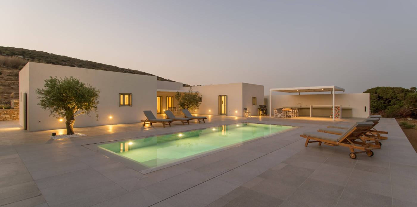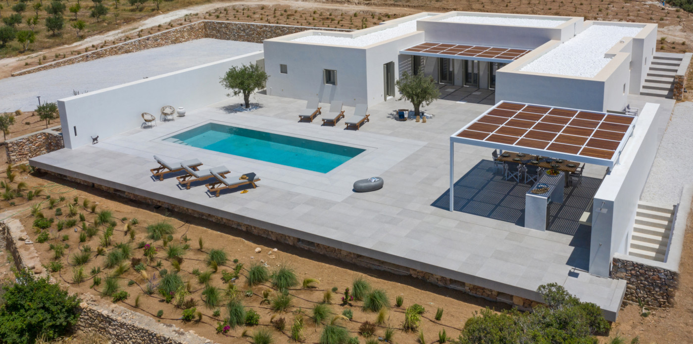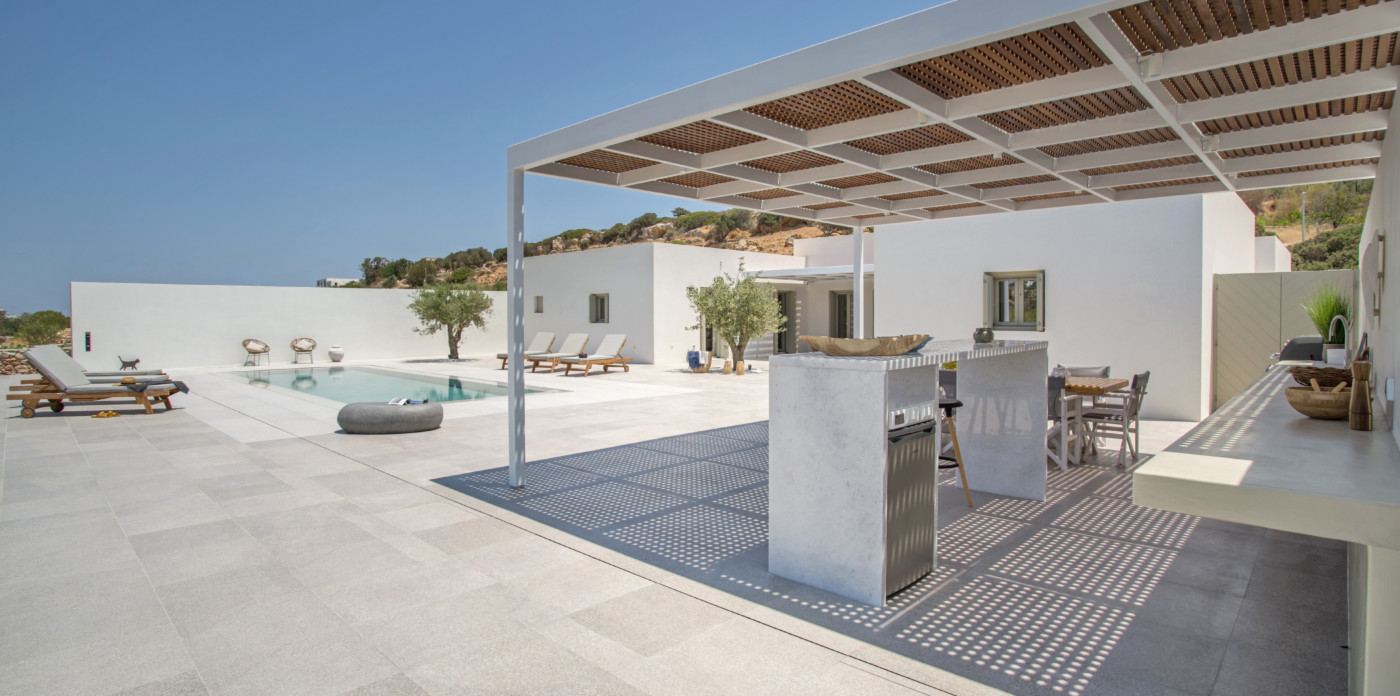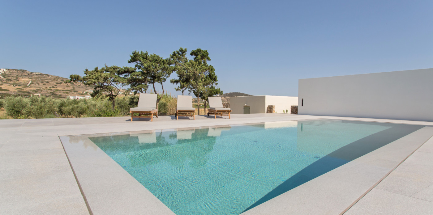 With 5 bedrooms, Olea has a relaxed feel. Indoors, fresh modern furnishings fuse with stylish, comfortable living spaces.Windows to either side bring in plenty of light and offer views of the Parian landscape and the front olive grove.The expansive outdoor area offers complete privacy.Here a large sundeck and sunbeds surround a lovely turquoise pool where you can enjoy endless dips in its refreshing waters.Two ancient olive trees draw in that Mediterranean element.