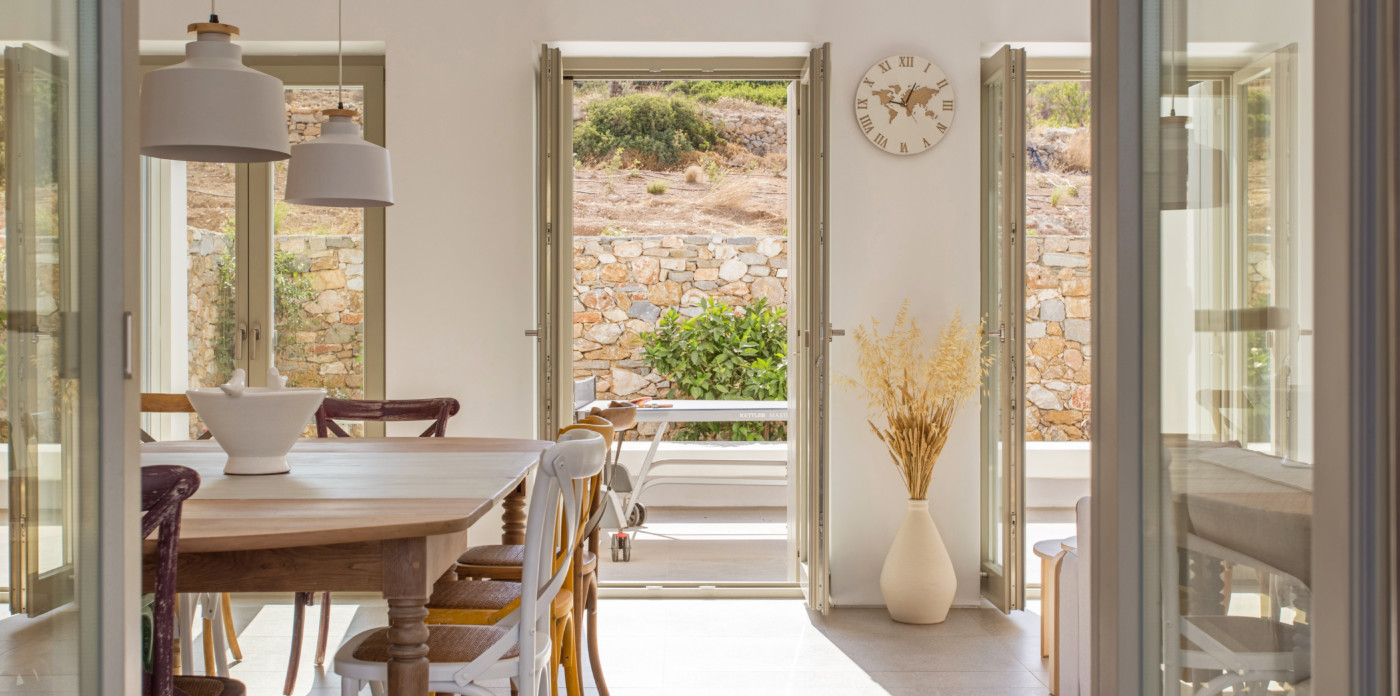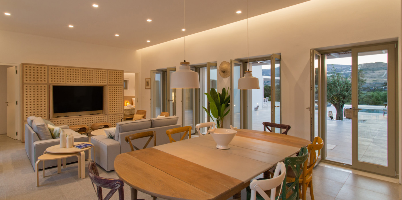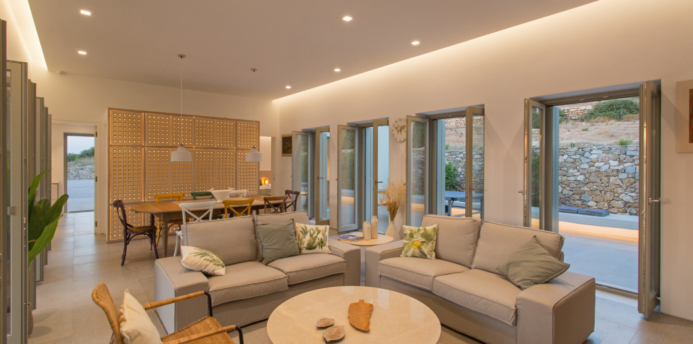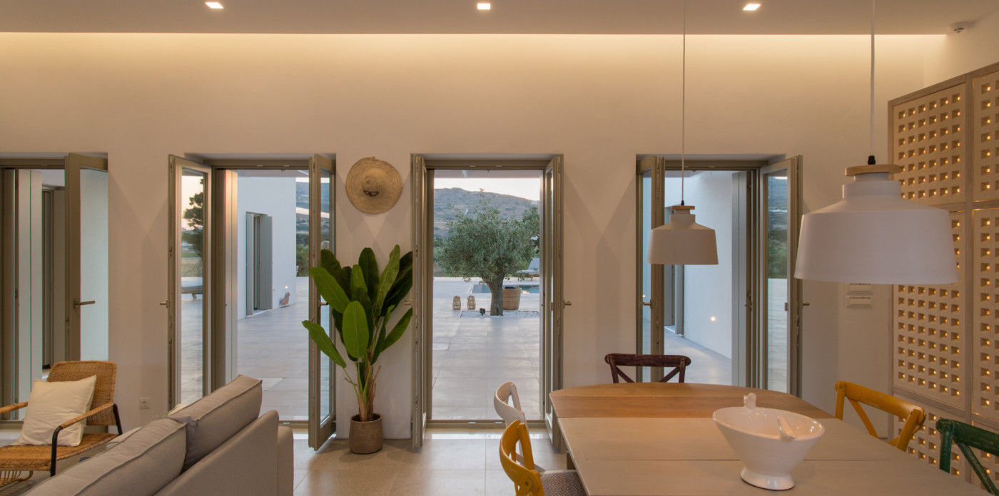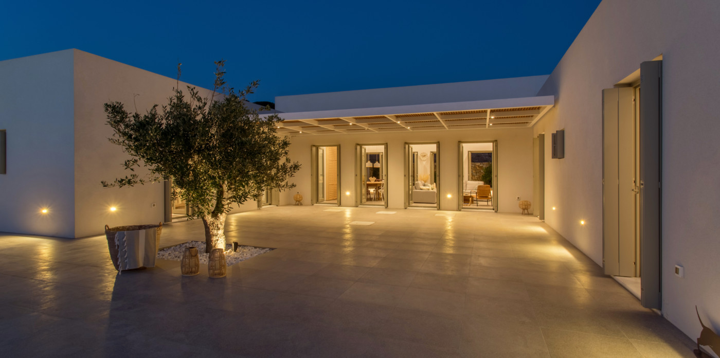 The child friendly home is built around a courtyard and above the old olive grove that stretches along the hill.Here families can relax and create lasting memories. This new villa embodies that iconic whiter than white Greek island architecture with spacious indoor and outdoor living.