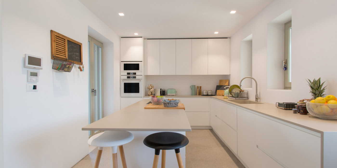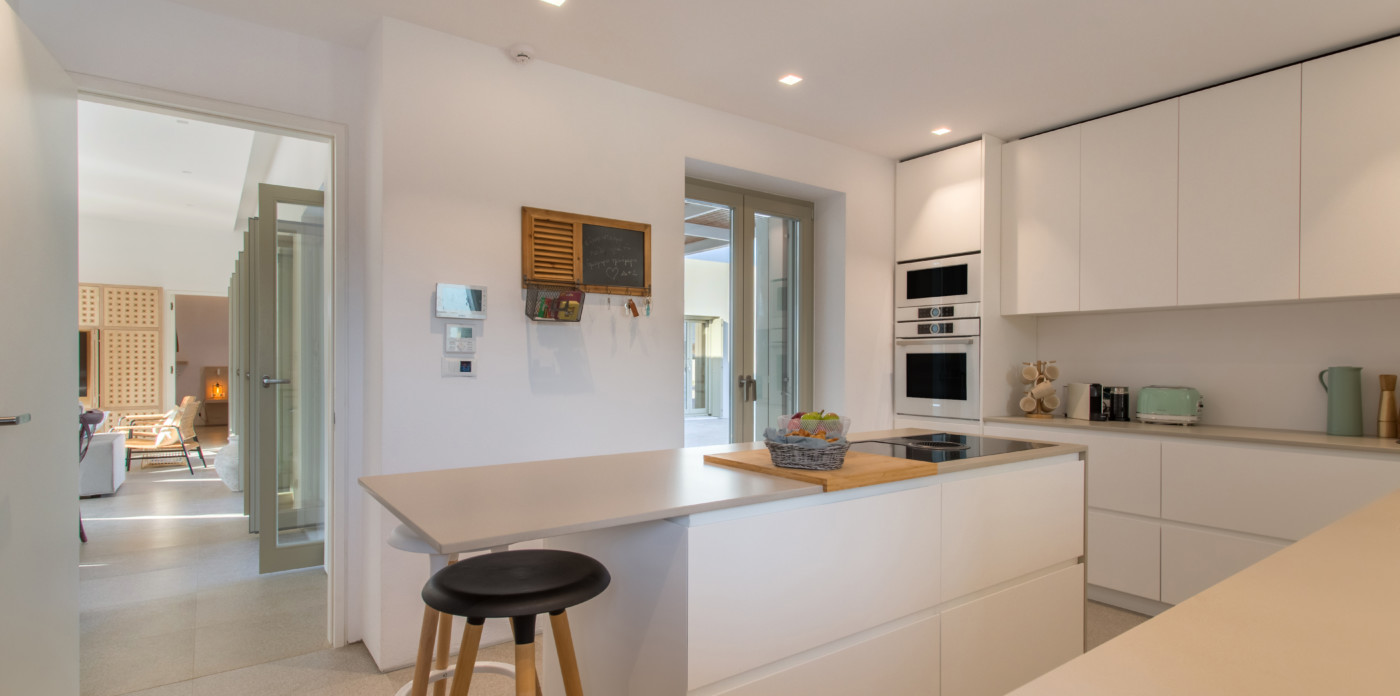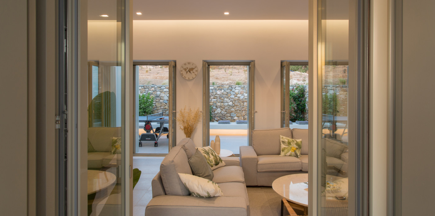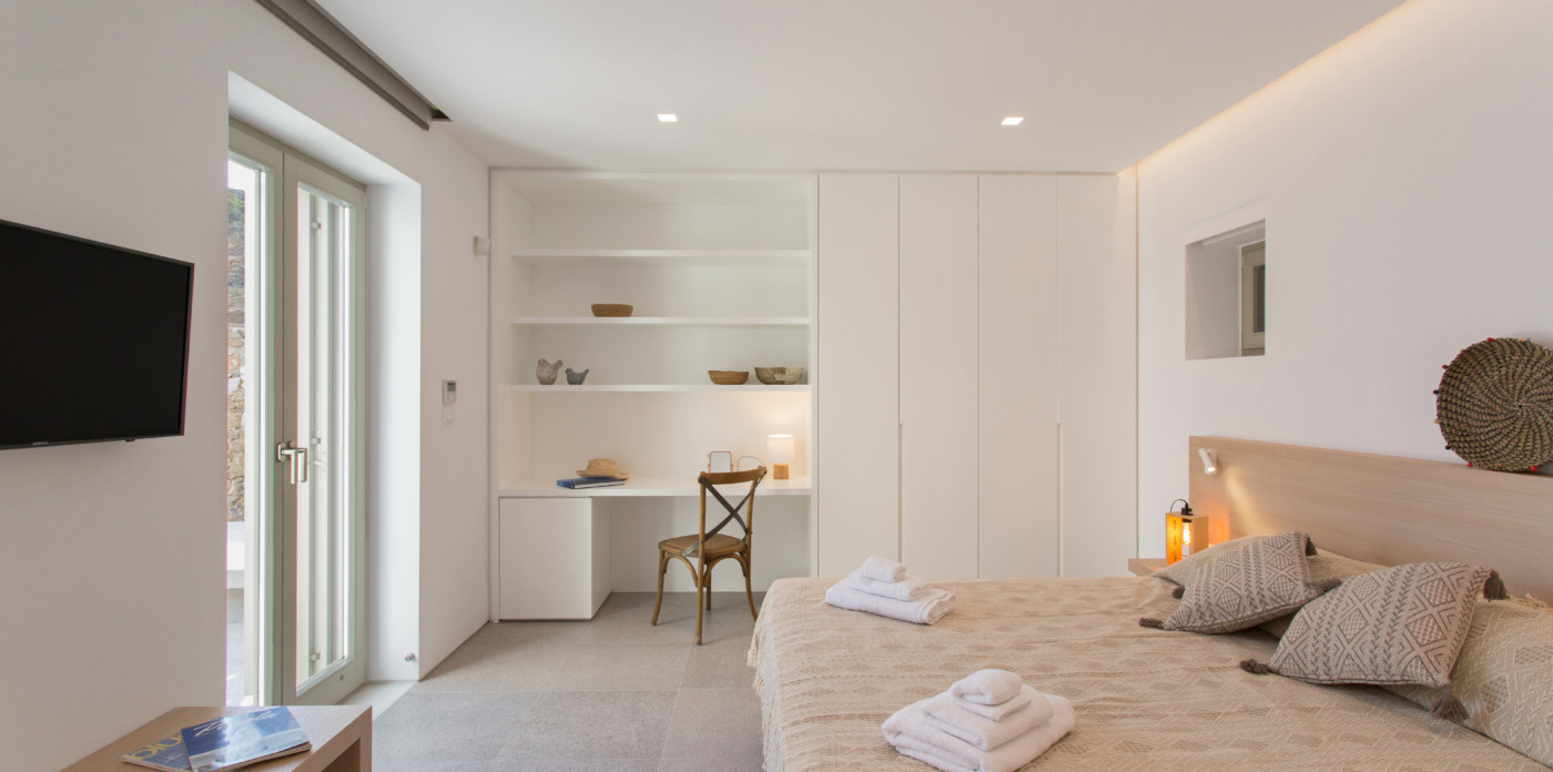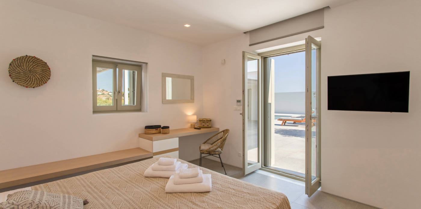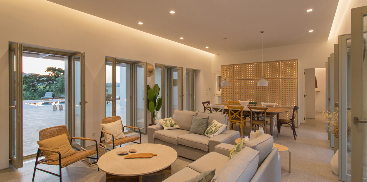 The child friendly home is built around a courtyard and above the old olive grove that stretches along the hill.Here families can relax and create lasting memories. This new villa embodies that iconic whiter than white Greek island architecture with spacious indoor and outdoor living.