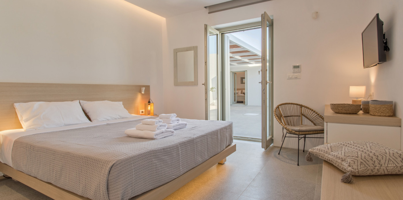 Set within a peaceful landscape, it is located in Kampos area, just five minutes drive from the picturesque fishing village of Naoussa and in close proximity to many beautiful beaches.