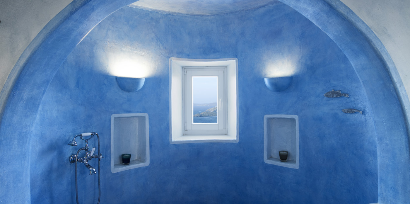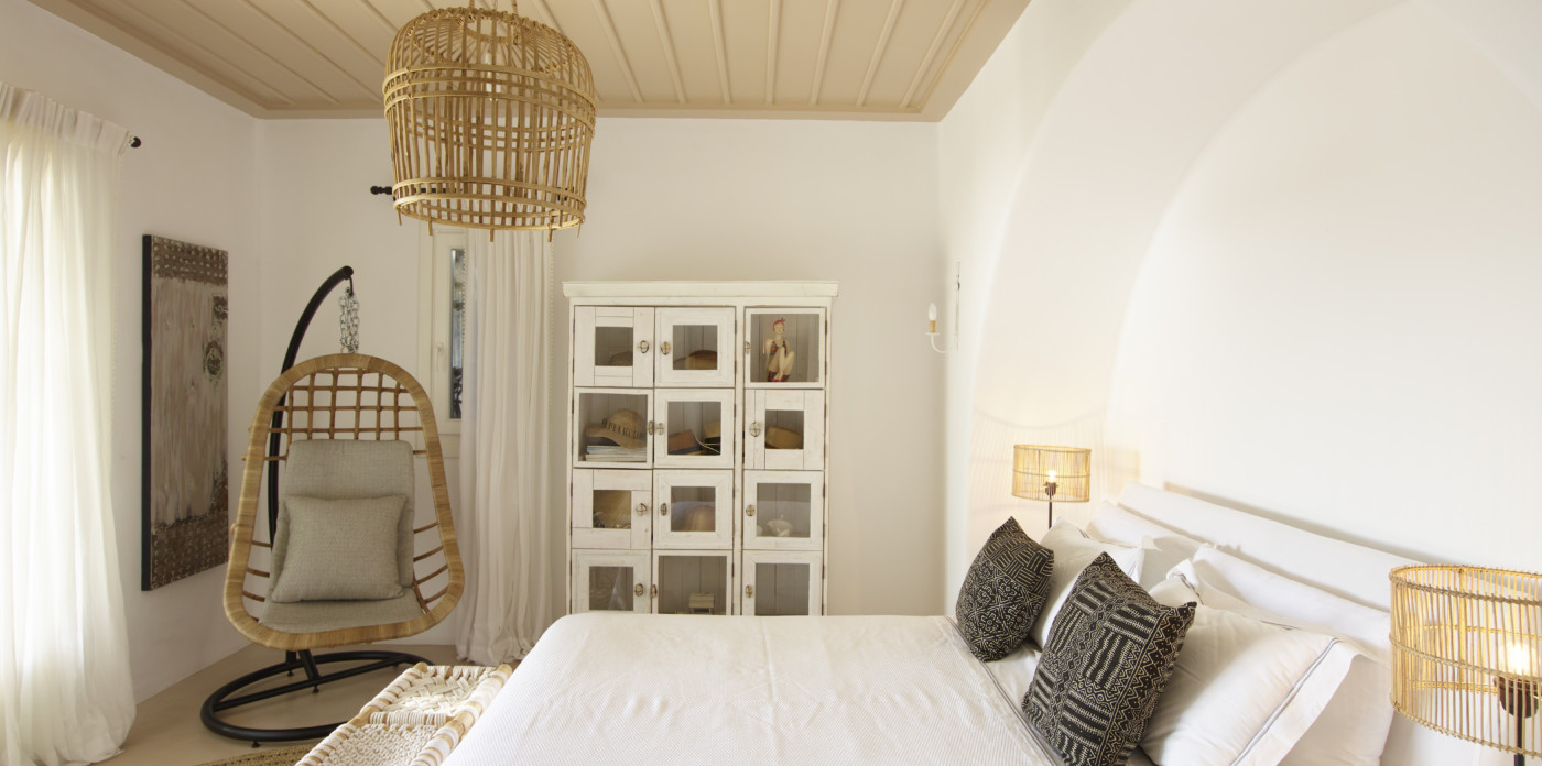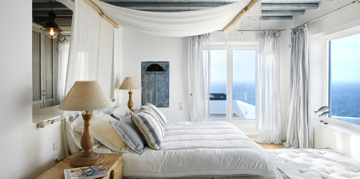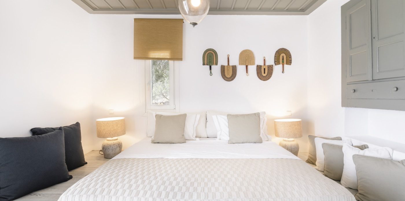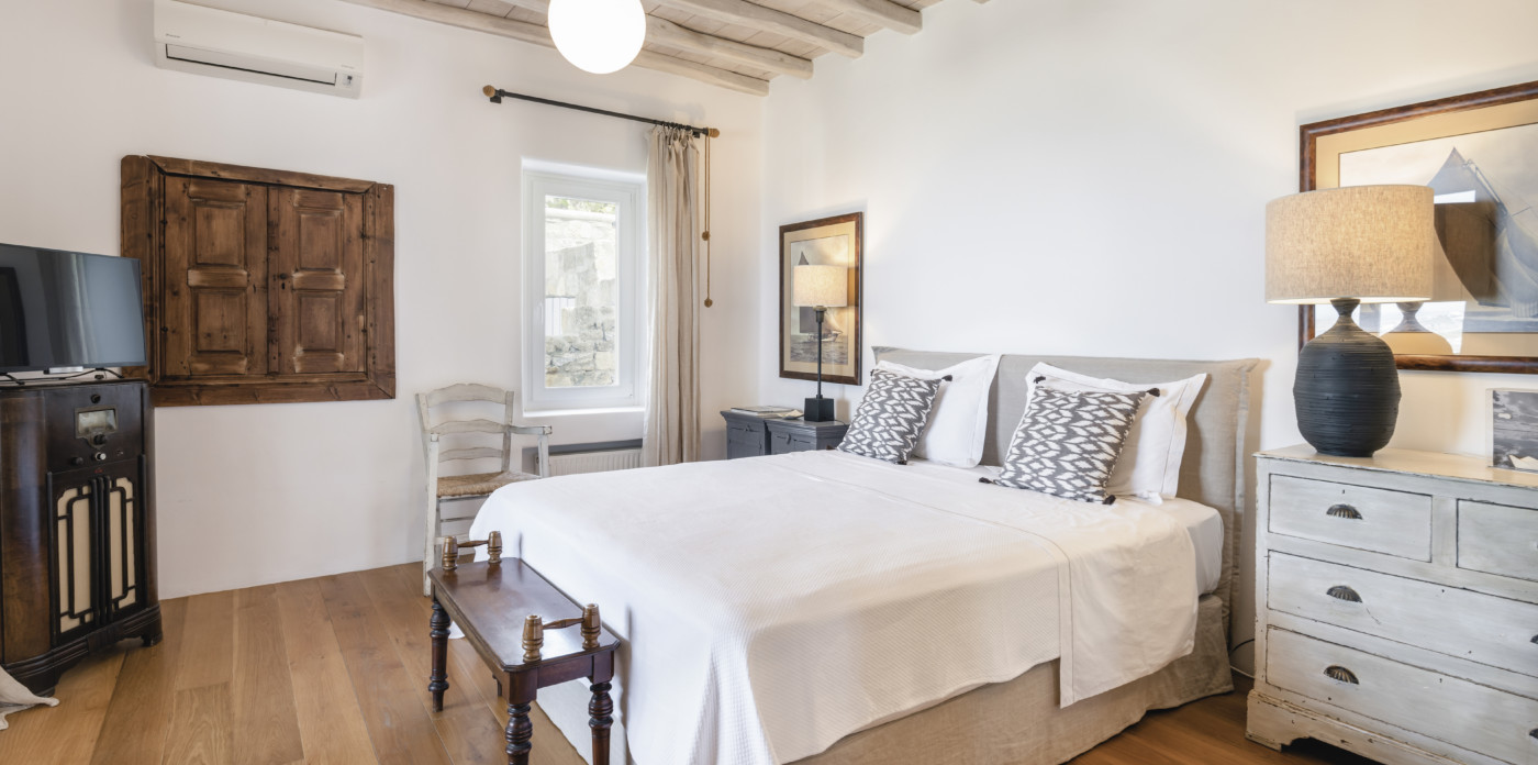 The relaxing bedrooms, a total of six, follow the same philosophy of homey yet luxurious – traditional atmosphere accommodation. Standing out is the master bedroom, positioned on the upper floor of the main house. Mesmerizing, it evokes a dreamy sensation, resembling a presidential suite on a cruise ship floating in the ocean. Outdoors, summer is staged on a rejuvenating pool terrace with pergola-shaded lounge and dining area, as well as sun-loungers and fluffy daybeds.