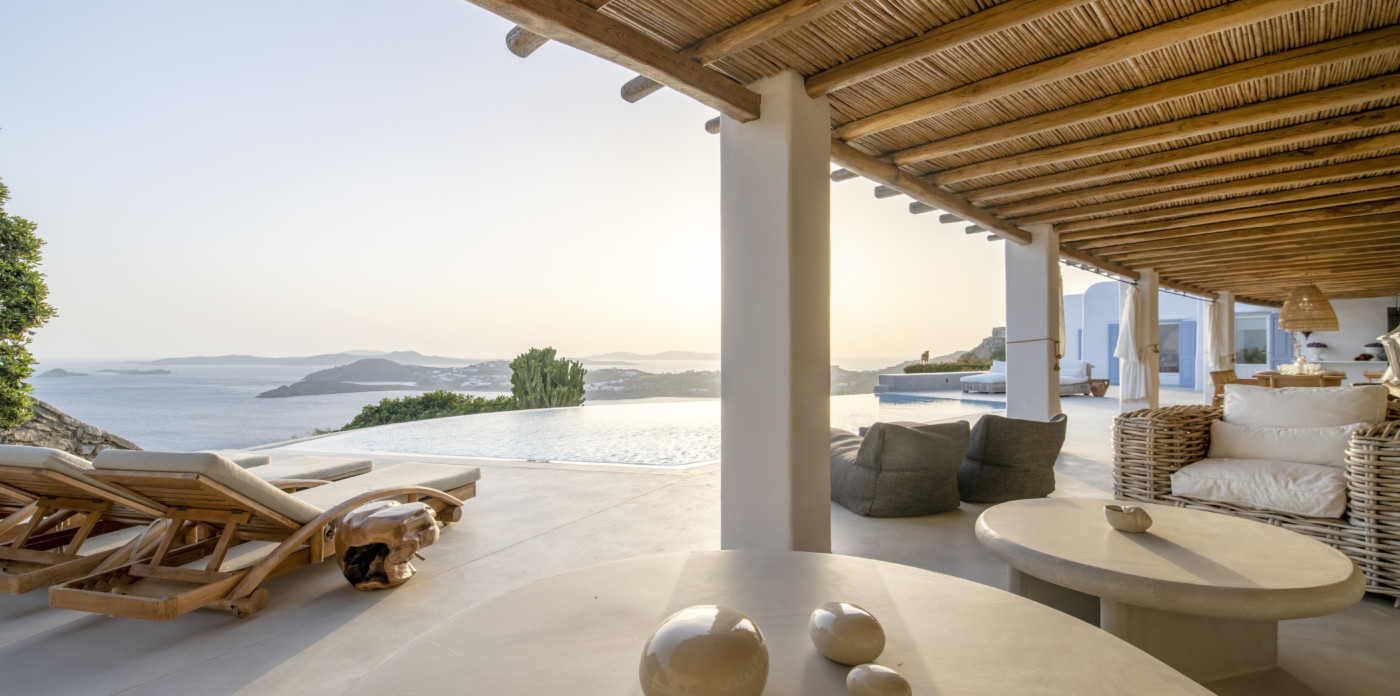 Renée is a lavish Mykonian villa set in Agios Lazaros, one of the finest areas on Mykonos island, known for views of the extensive sea and beautiful sunsets.