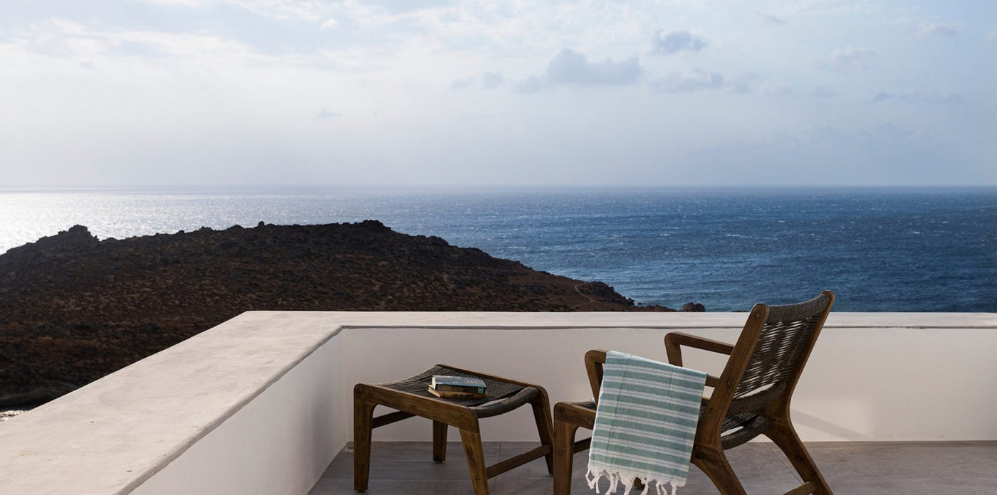 The villa’s comfortable minimal Mykonian interiors of 280 sq.m in black and beige tones, are divided over two levels. It features six bedrooms with en suite bathrooms, a welcoming living room with a dining area and fully equipped kitchen. An ensuite staff room with separate entrance is located adjacent to the villa.