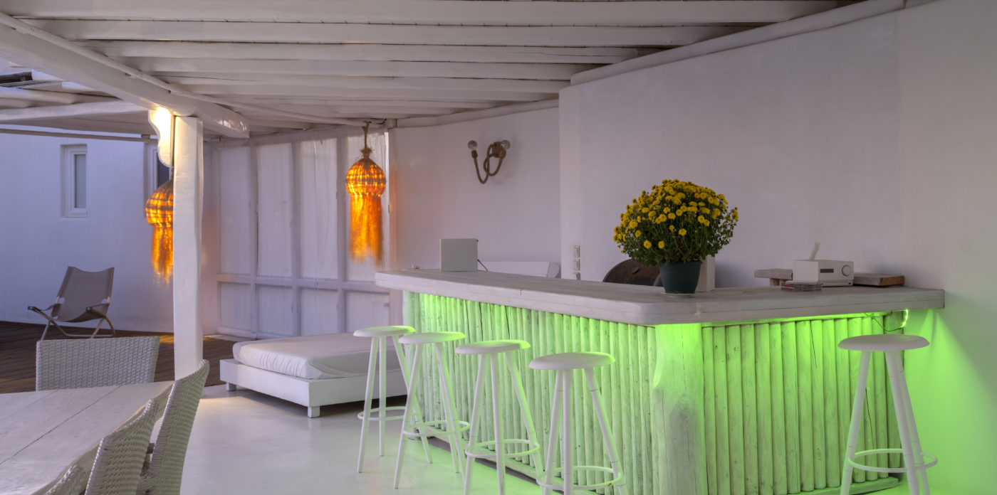 Its 8 suites and three terraces are finely decorated; all suites are deluxe, with wide windows and glass doors granting individual access to the terraces and enjoying breathtaking views of the sunset and the surrounding islands.