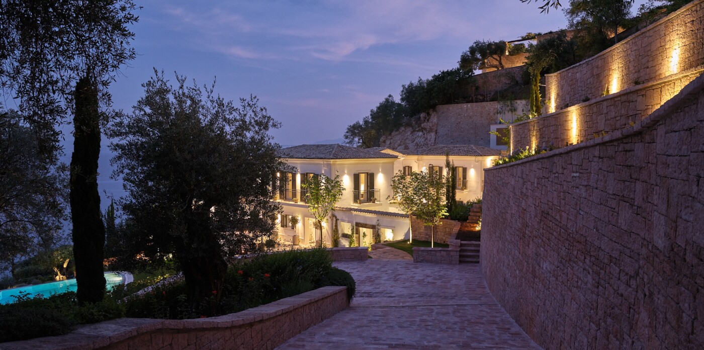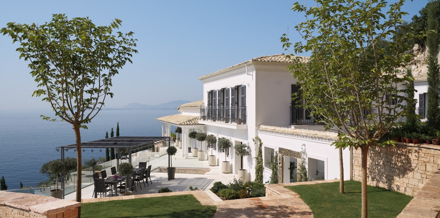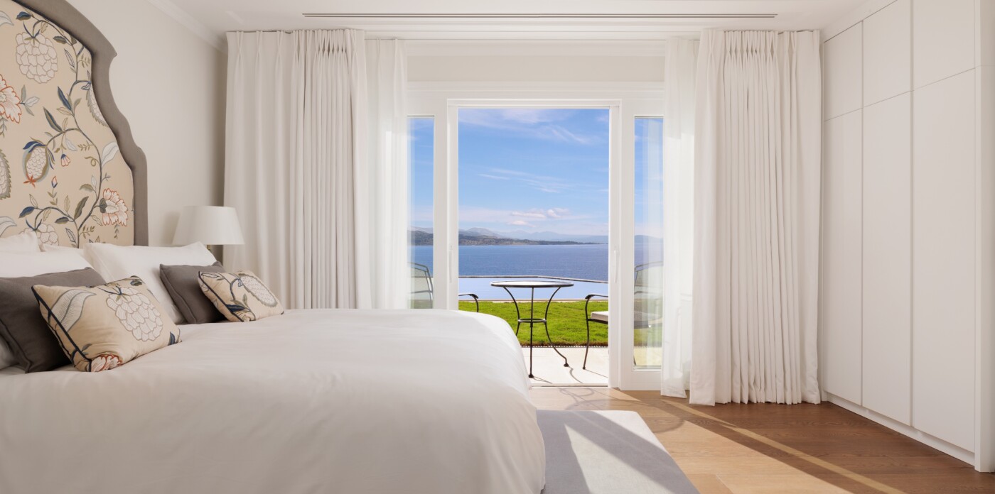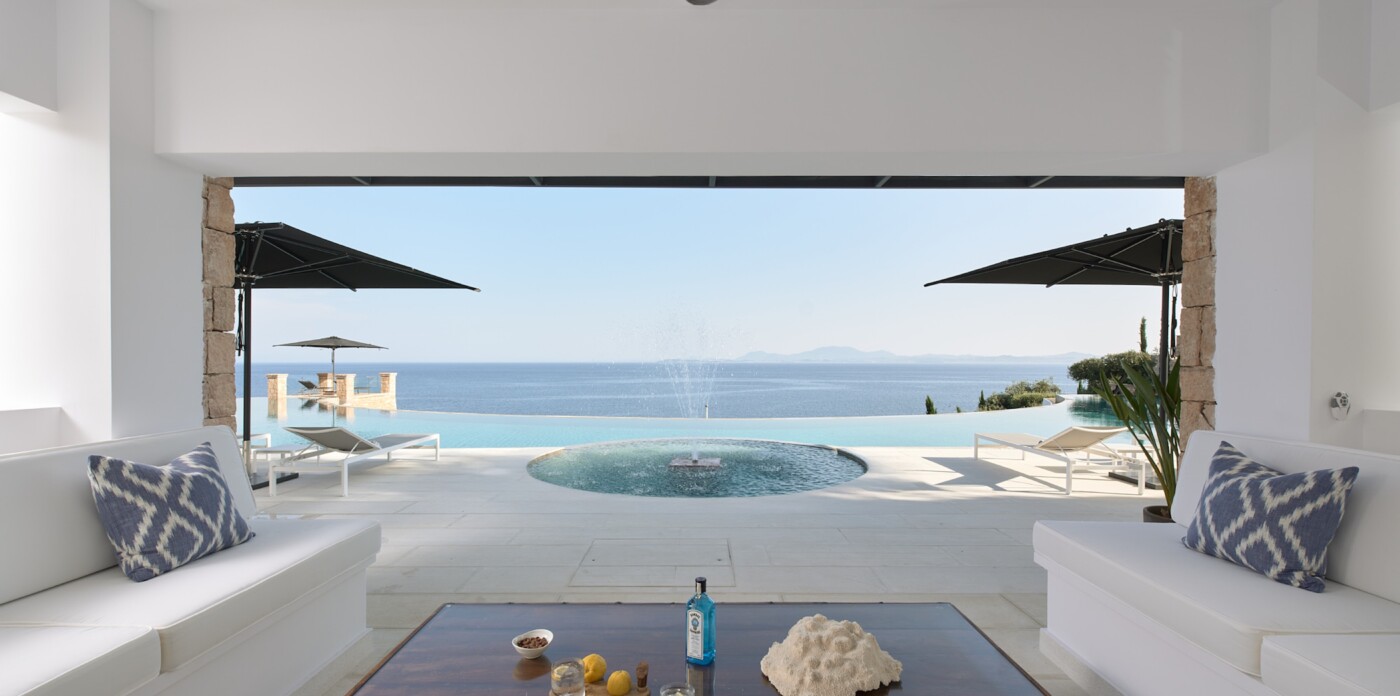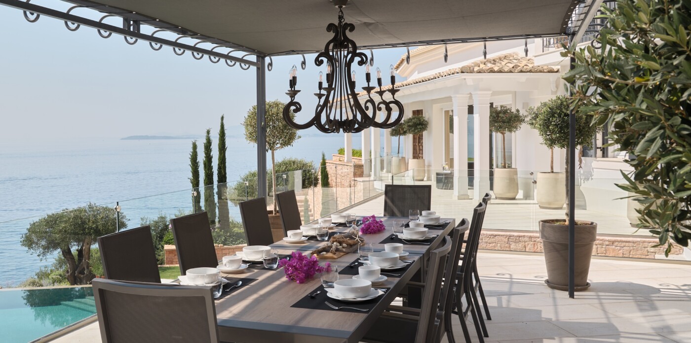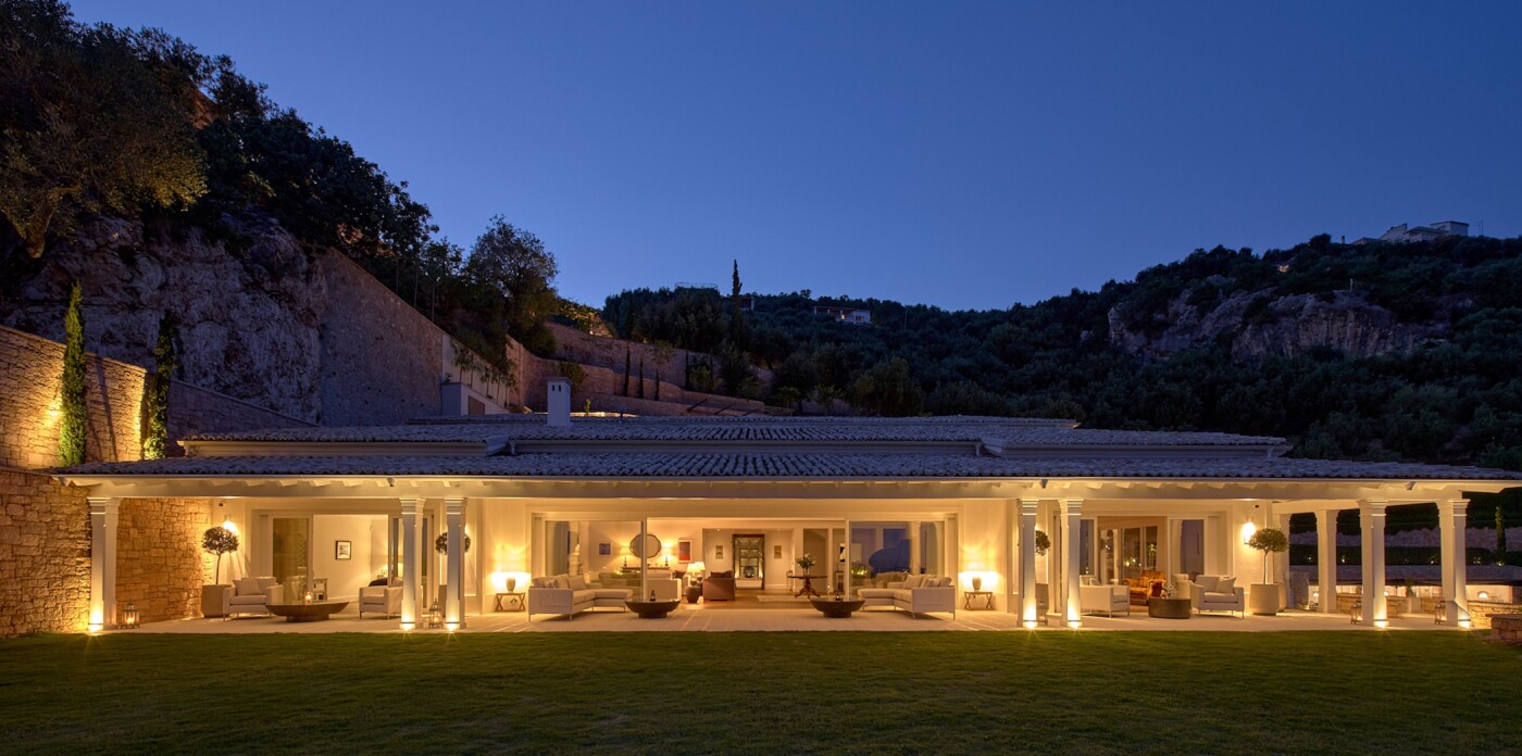 This spectacular estate, with a private guest house, welcomes up to 12 guests across eight luxurious suites: five in the main villa and three in the guest house. Every detail has been curated to offer absolute comfort, from the landscaped terraced lawns to the private seafront with jetty, offering direct access to the Ionian waters.