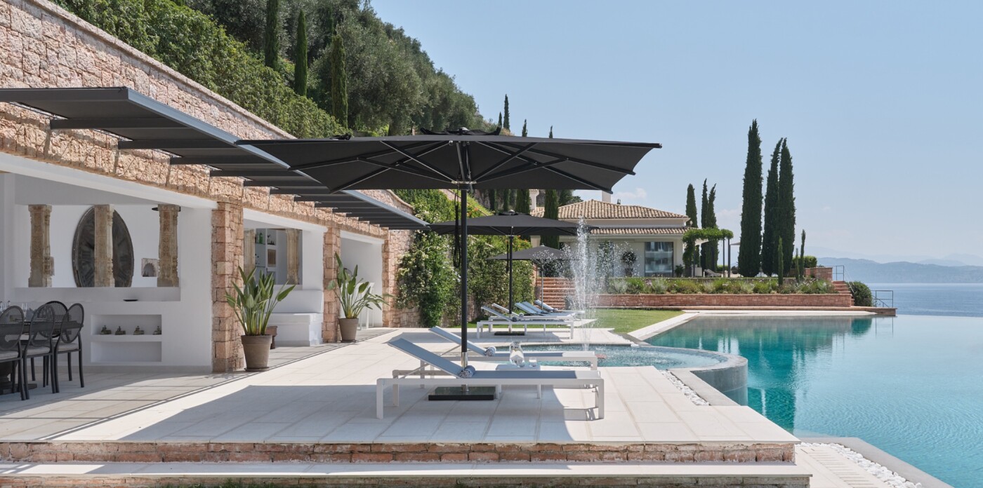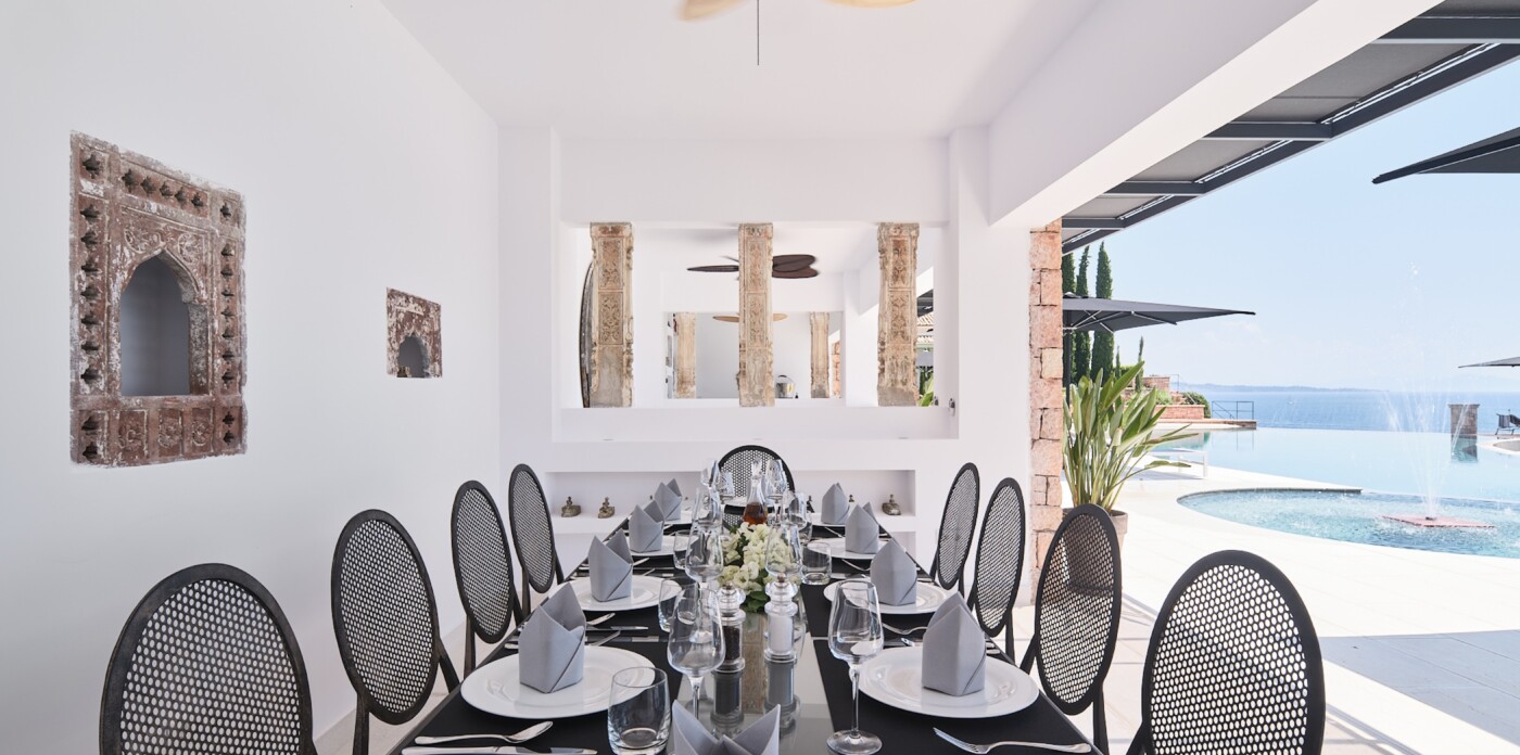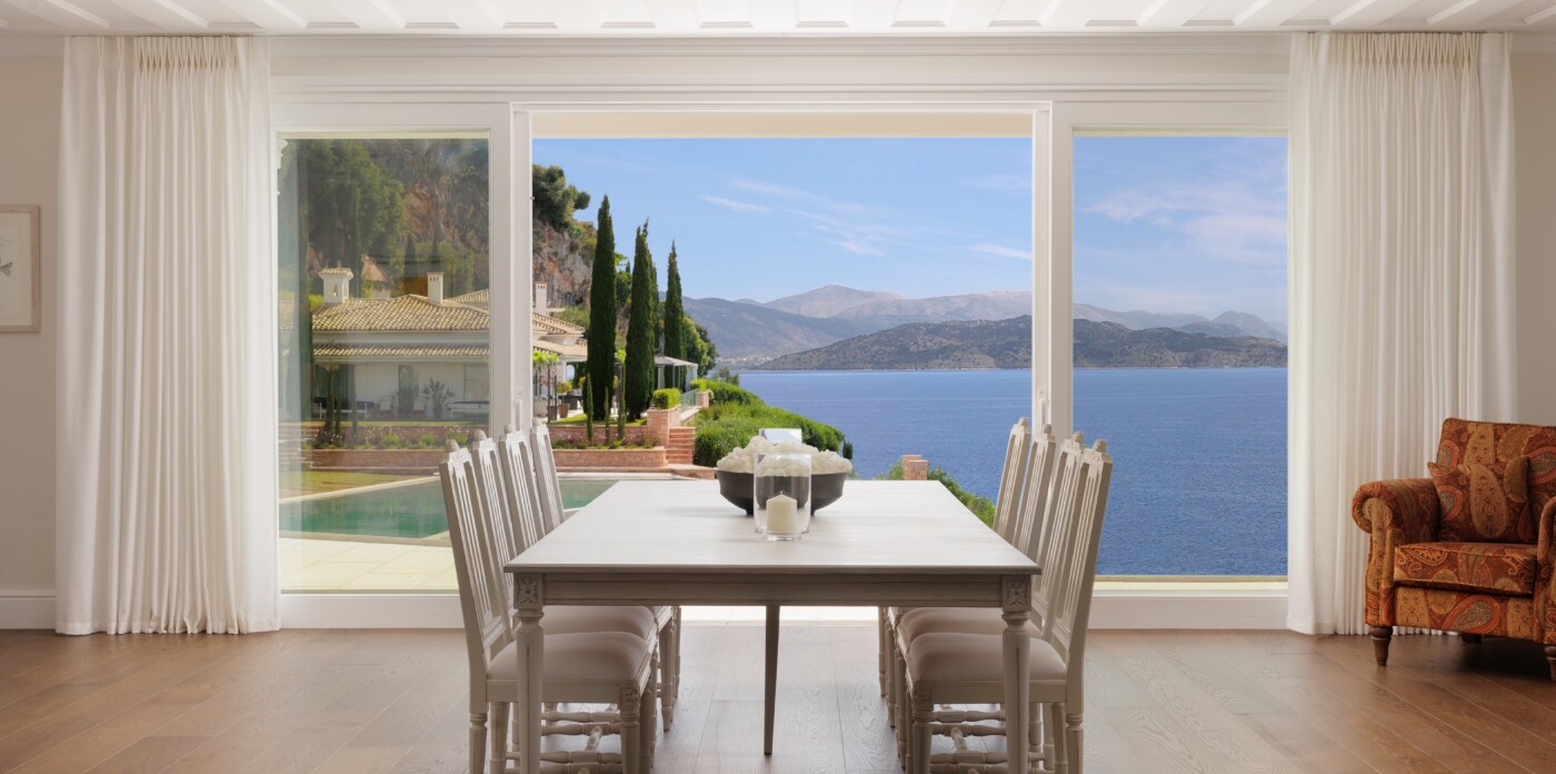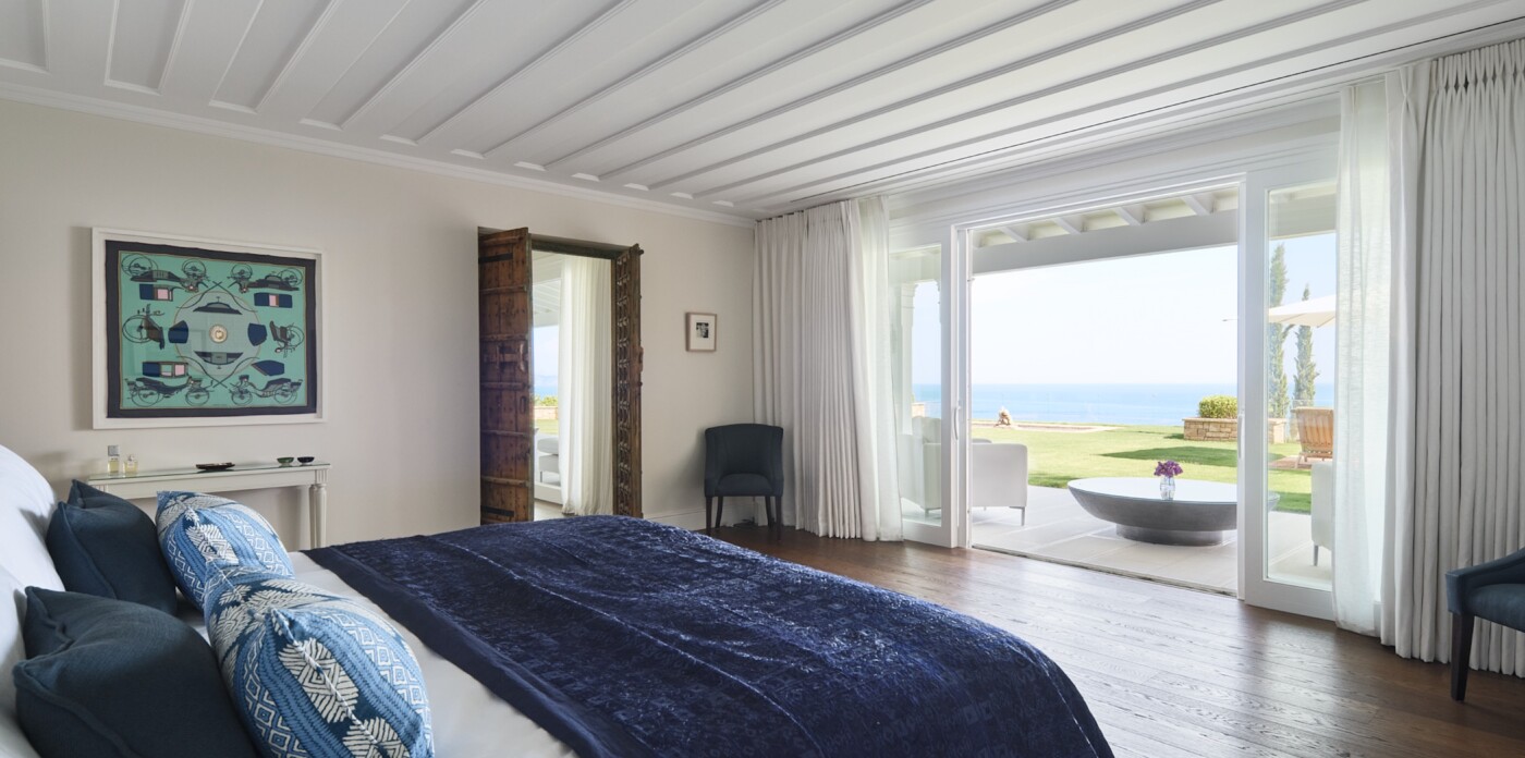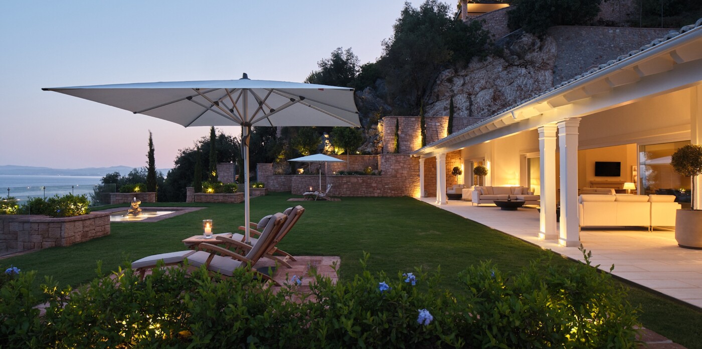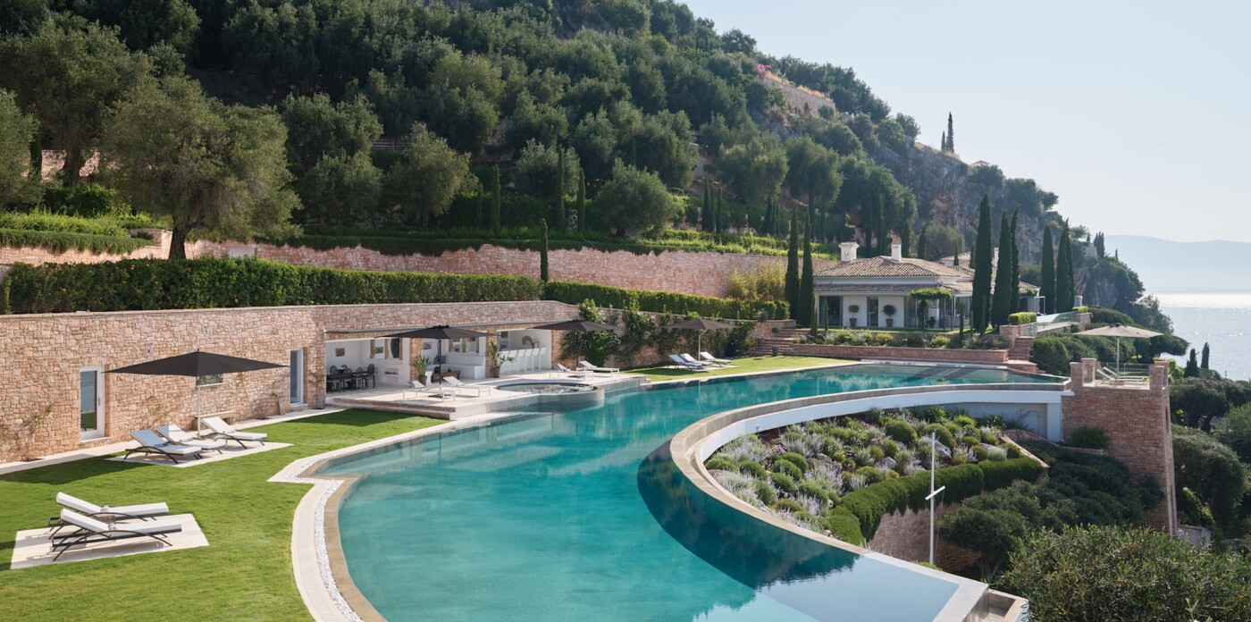 This spectacular estate, with a private guest house, welcomes up to 12 guests across eight luxurious suites: five in the main villa and three in the guest house. Every detail has been curated to offer absolute comfort, from the landscaped terraced lawns to the private seafront with jetty, offering direct access to the Ionian waters.