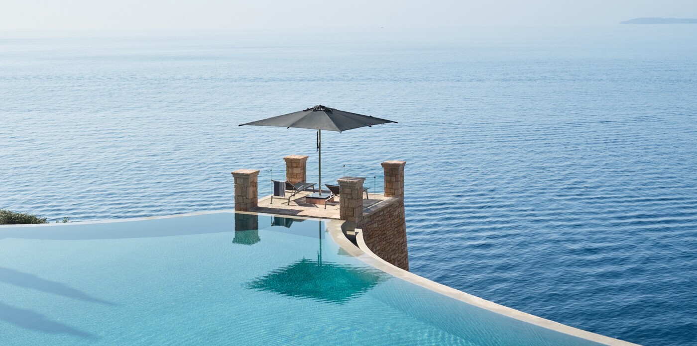 The centrepiece is the 65-metre infinity pool, oriented south for all-day sun and 180° panoramic sea views. A cabana with al fresco dining, a large bar, and a seating area anchors the poolside atmosphere, while above it, a circular elevated pool with built-in seating spills gently into the main pool in a cascading waterfall effect.