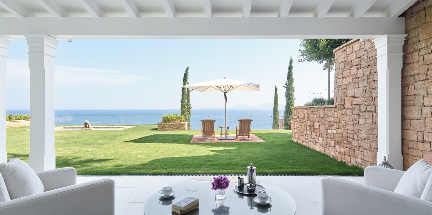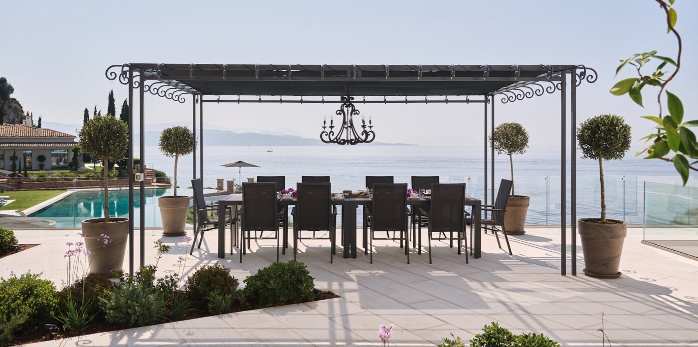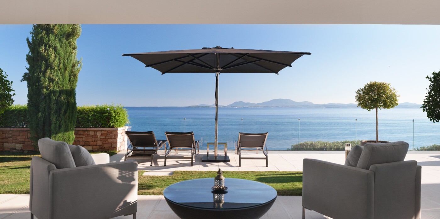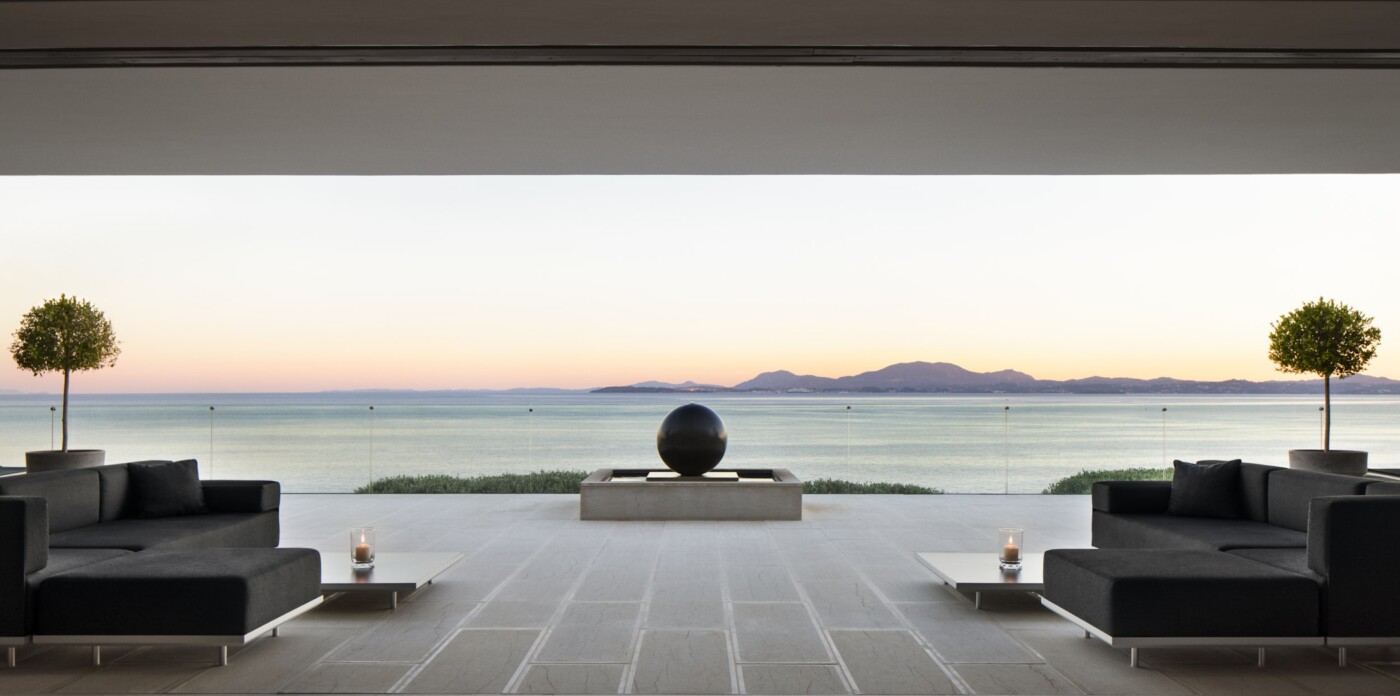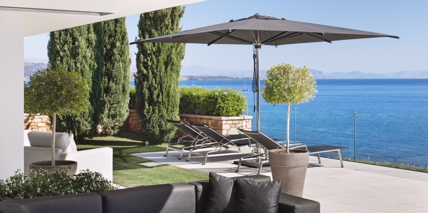 The gardens, cascading toward the sea, are designed as havens of peace. Multiple terraces invite both reflection and recreation with shaded pergolas for relaxation, and sun-drenched platforms for soaking up the Greek light.
