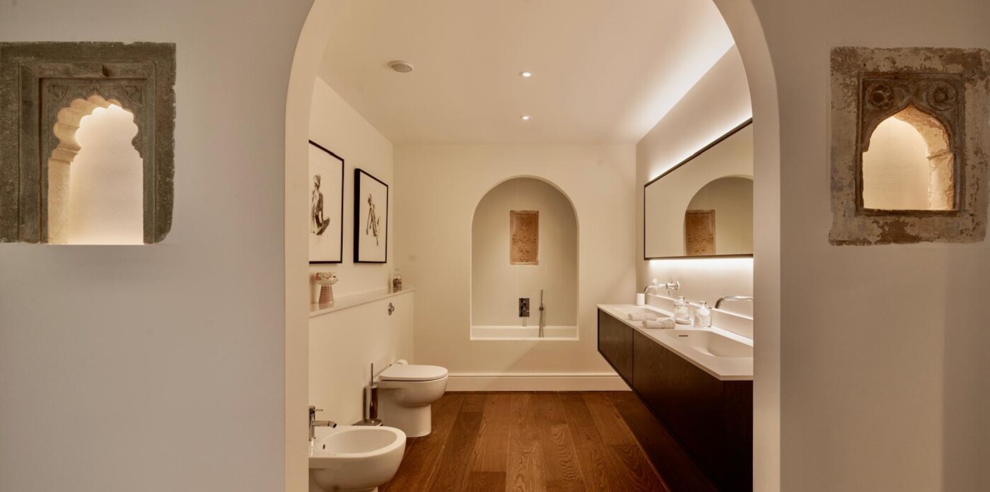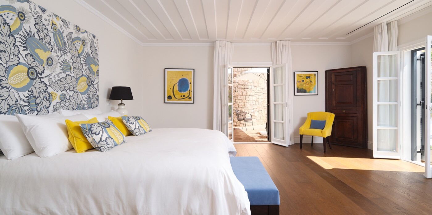 The master suite located on the ground floor comes with super king bed, walk-in dressing room, and spa-style bathroom, opens onto a private terrace with armchairs and steps to a secluded terrace with seating under a shaded pergola.
