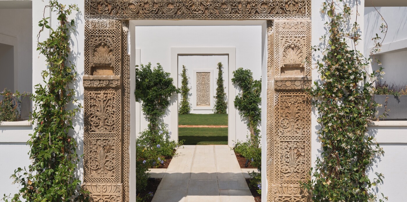 Entrance to this seafront masterpiece feels like stepping into a secret sanctuary. Serene outdoor areas framed by natural stone walls and calming water features sets the tone, while a pair of antique Indian doors—rich in carvings and history—open into a world of elegance and tranquillity.